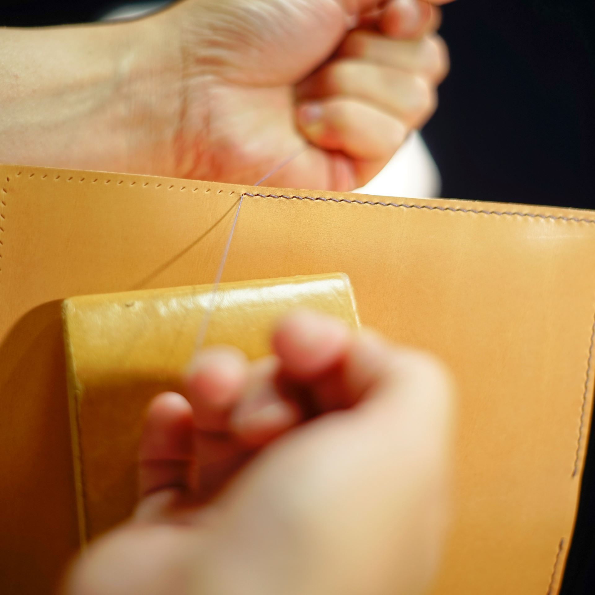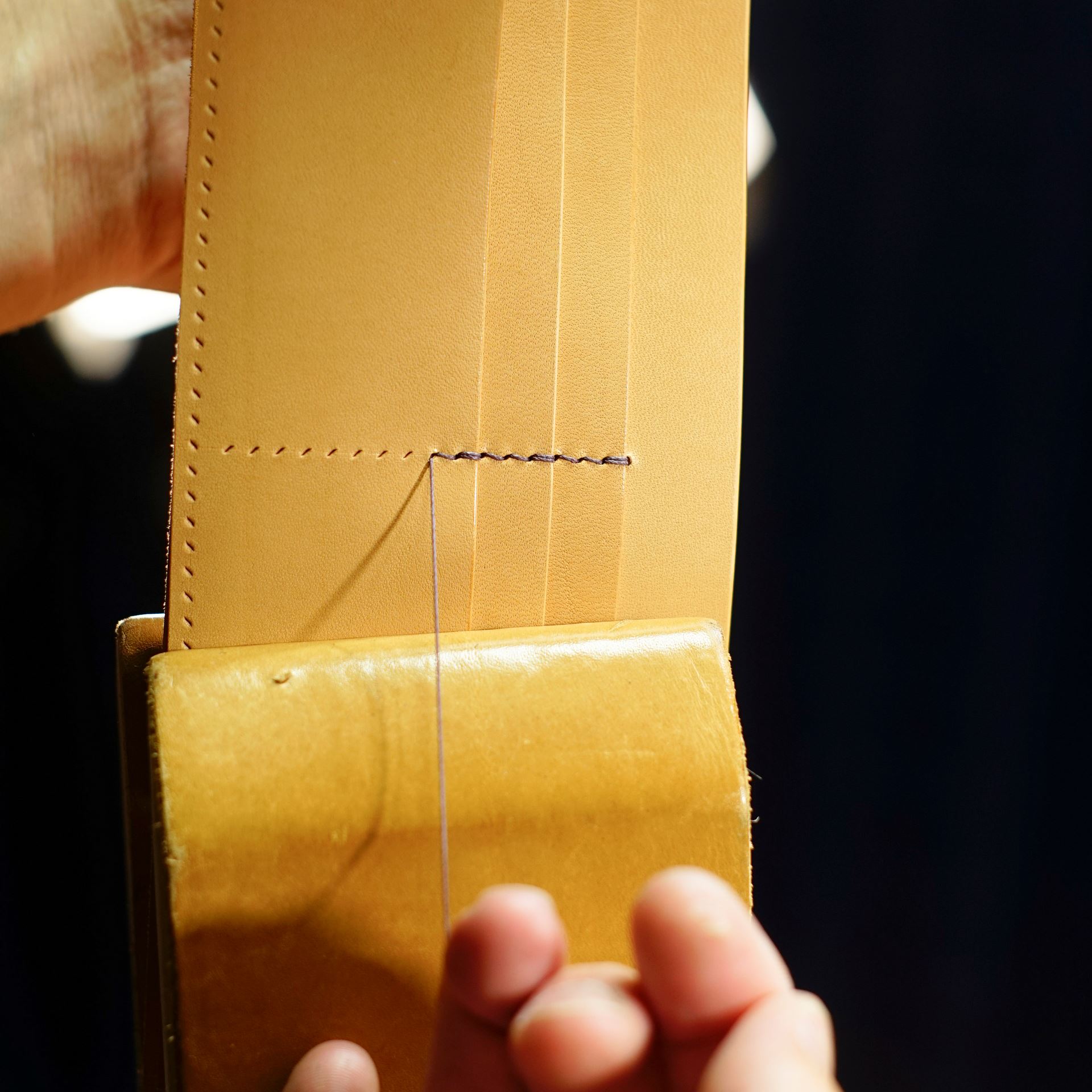 目打ちと打刻をしてコバ磨きできる所は済ませておきます。手縫いは六花リネン糸の30黒紅です。カード挿しと四方ぐるりを手縫いします。