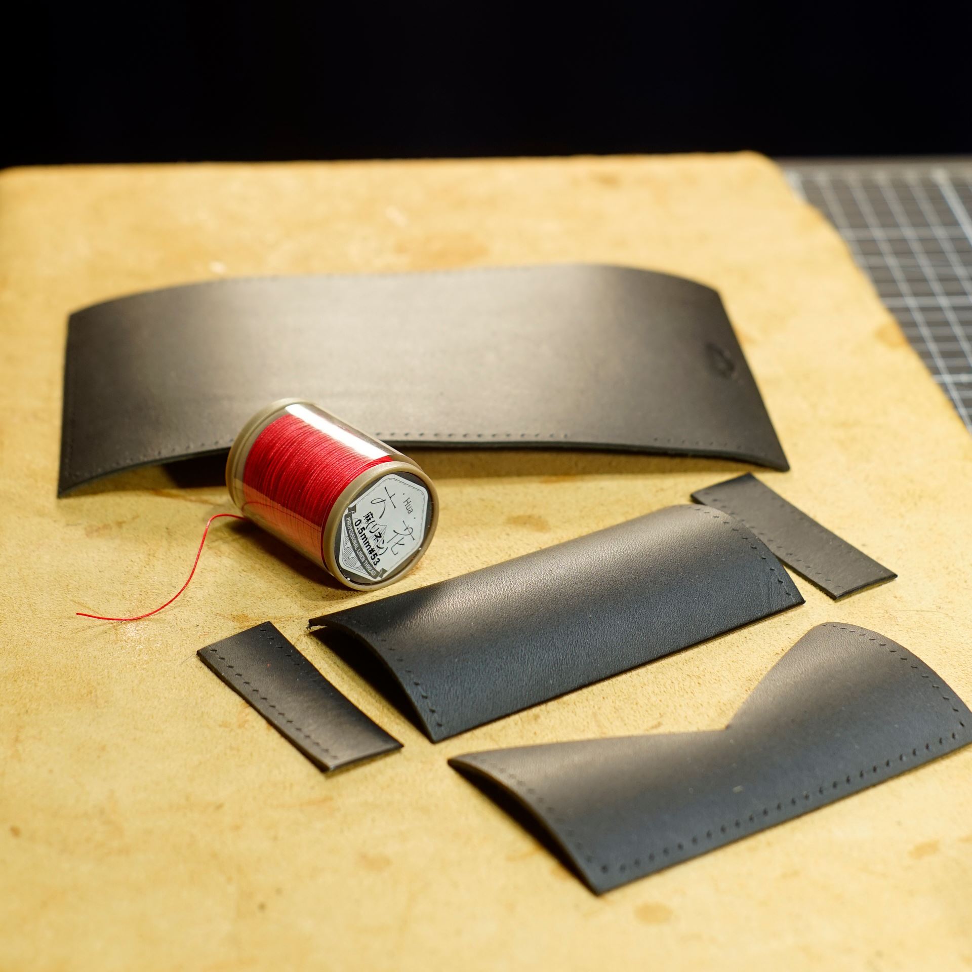 本日はイタリアンソフトのネロで制作となります。型紙から革をカットして打刻とコバ磨きを済ませておきます。