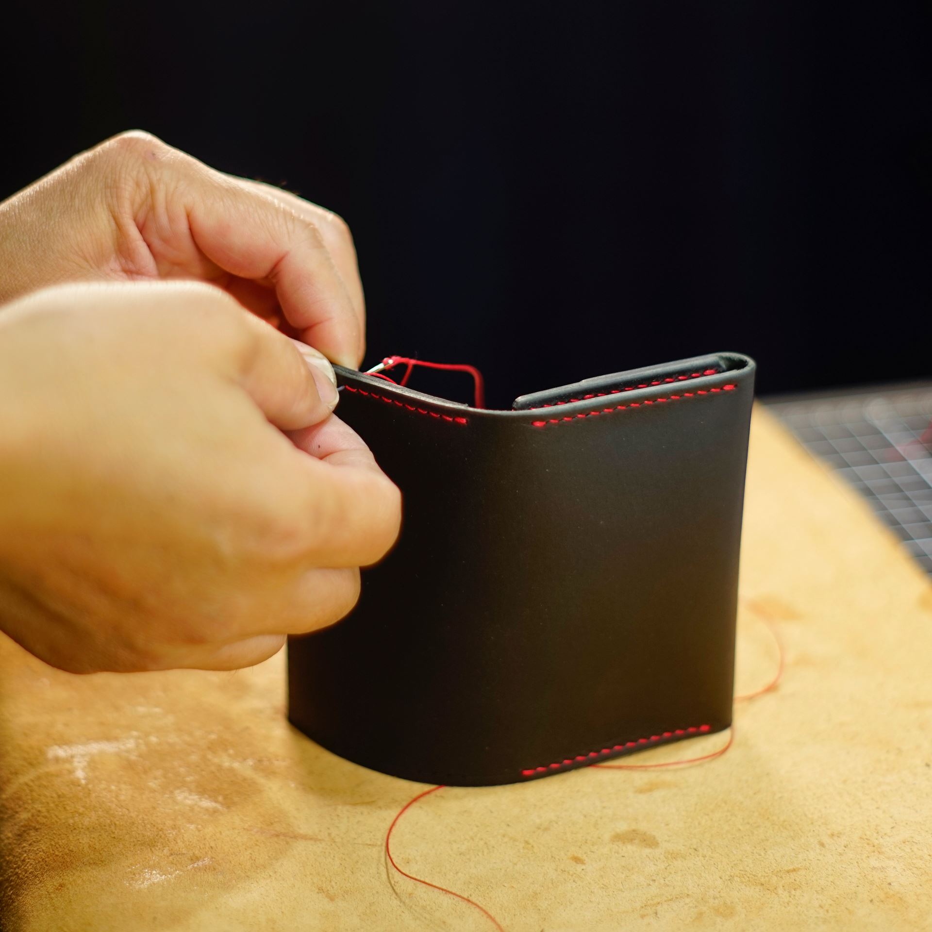 全てのステッチが終了しましたので、最後にコバ(革の断面)磨きで仕上げれば完成となります。