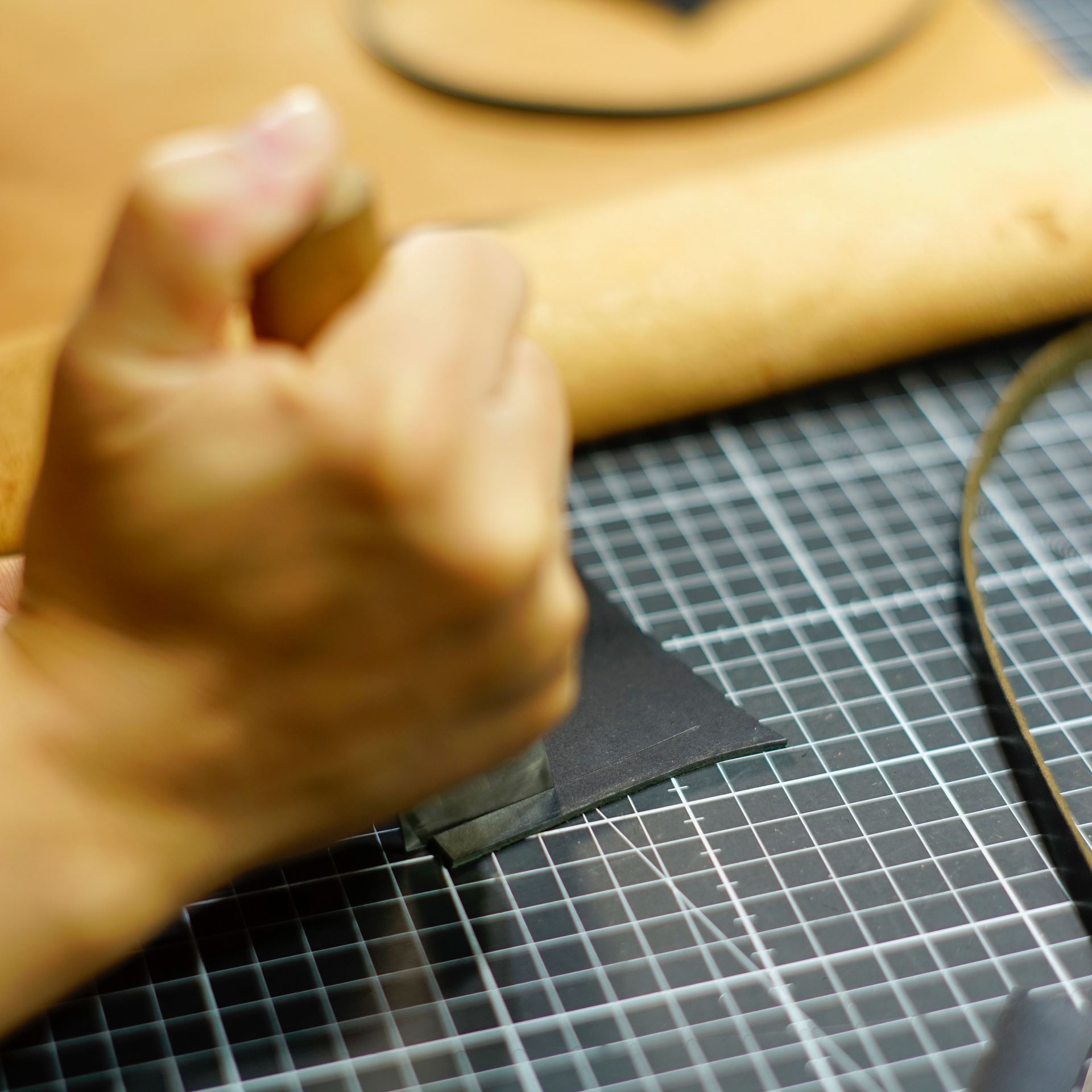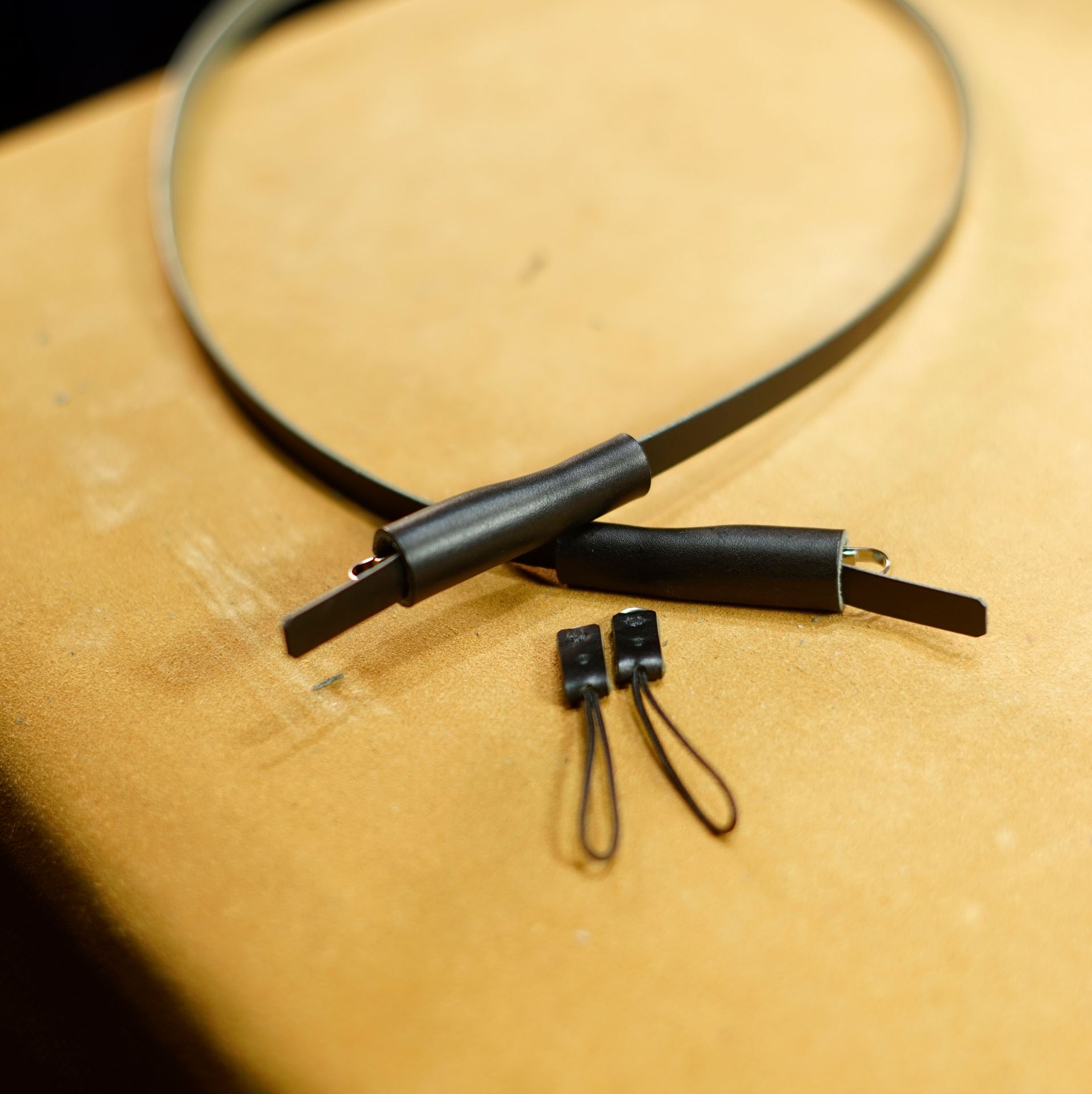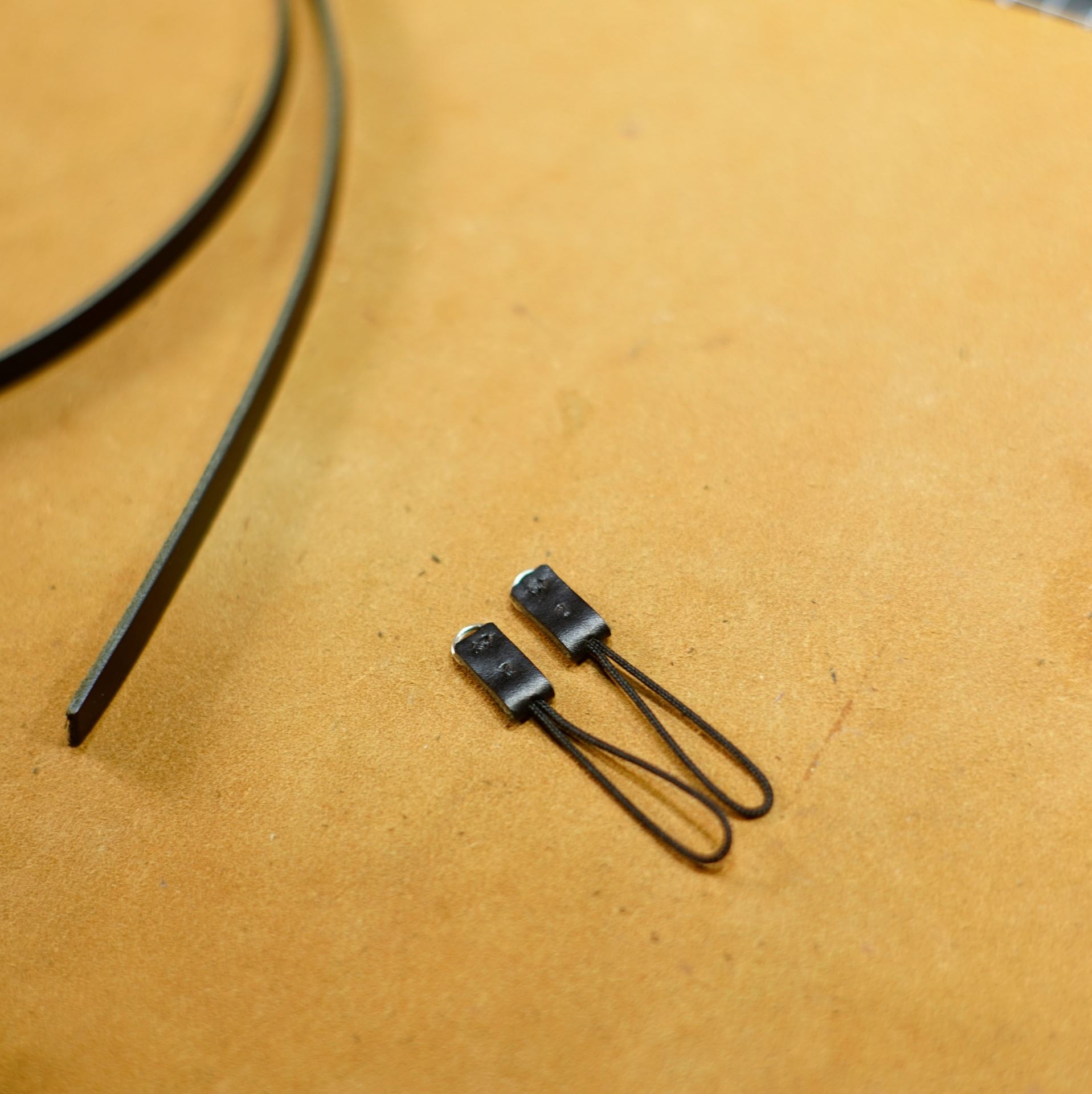 コネクターが出来上がったらストラップ本体の制作に取り掛かります。本製品はしっかりとしたコバ磨きはしておりません。軽くヘチマで擦って整える程度です。使っていくうちに自然と丸みが出てきます。