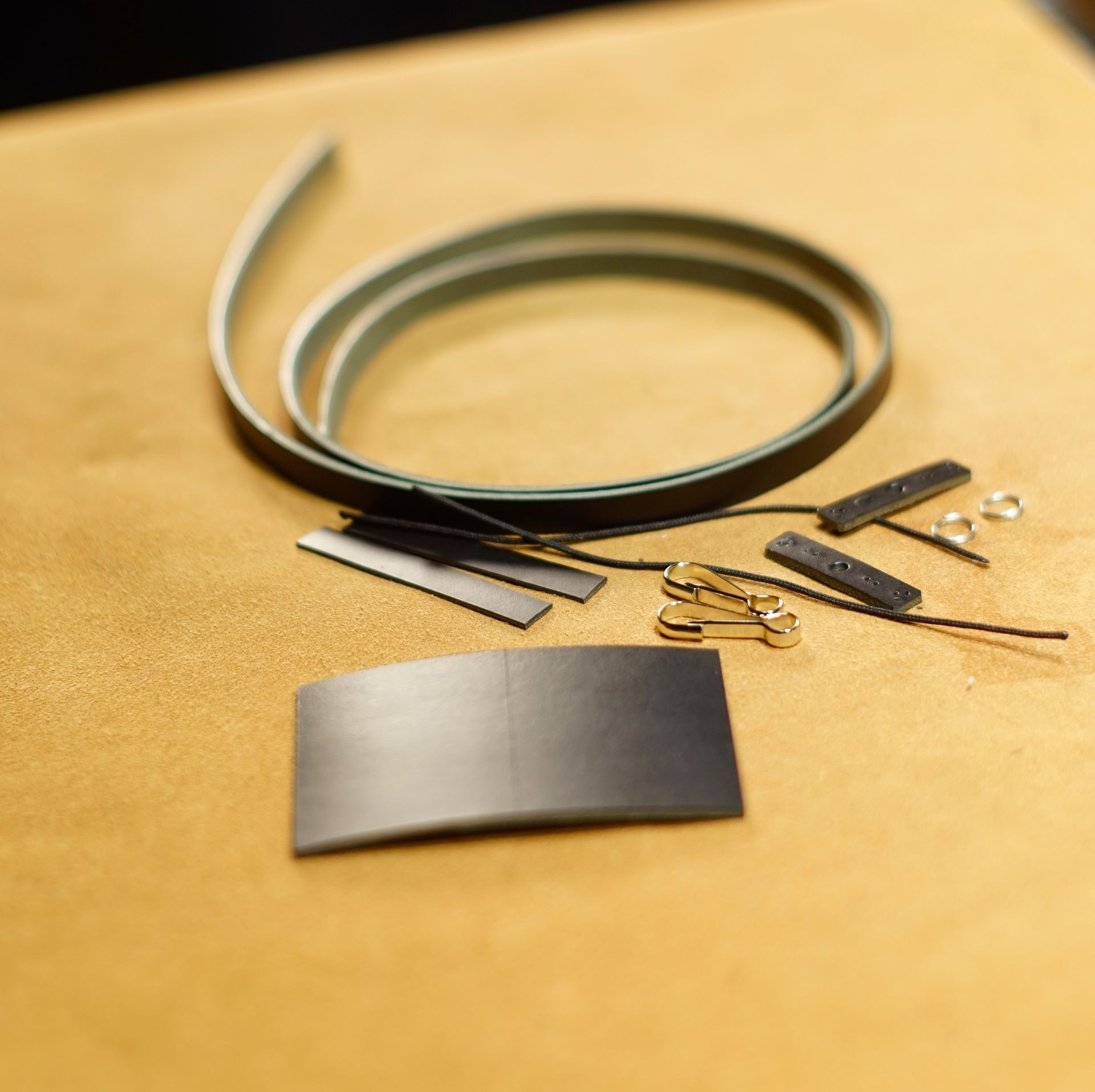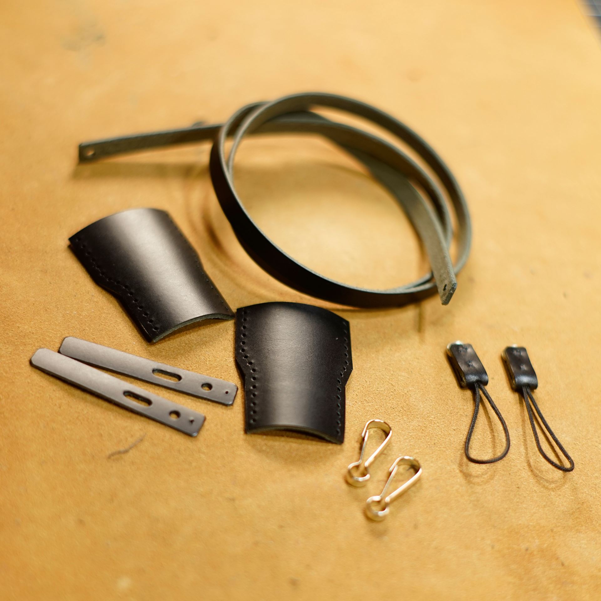 イタリアンハードの黒革からすべてのパーツを切り出します。写真ではコネクター1セット分ですが、一応2セット作っております。