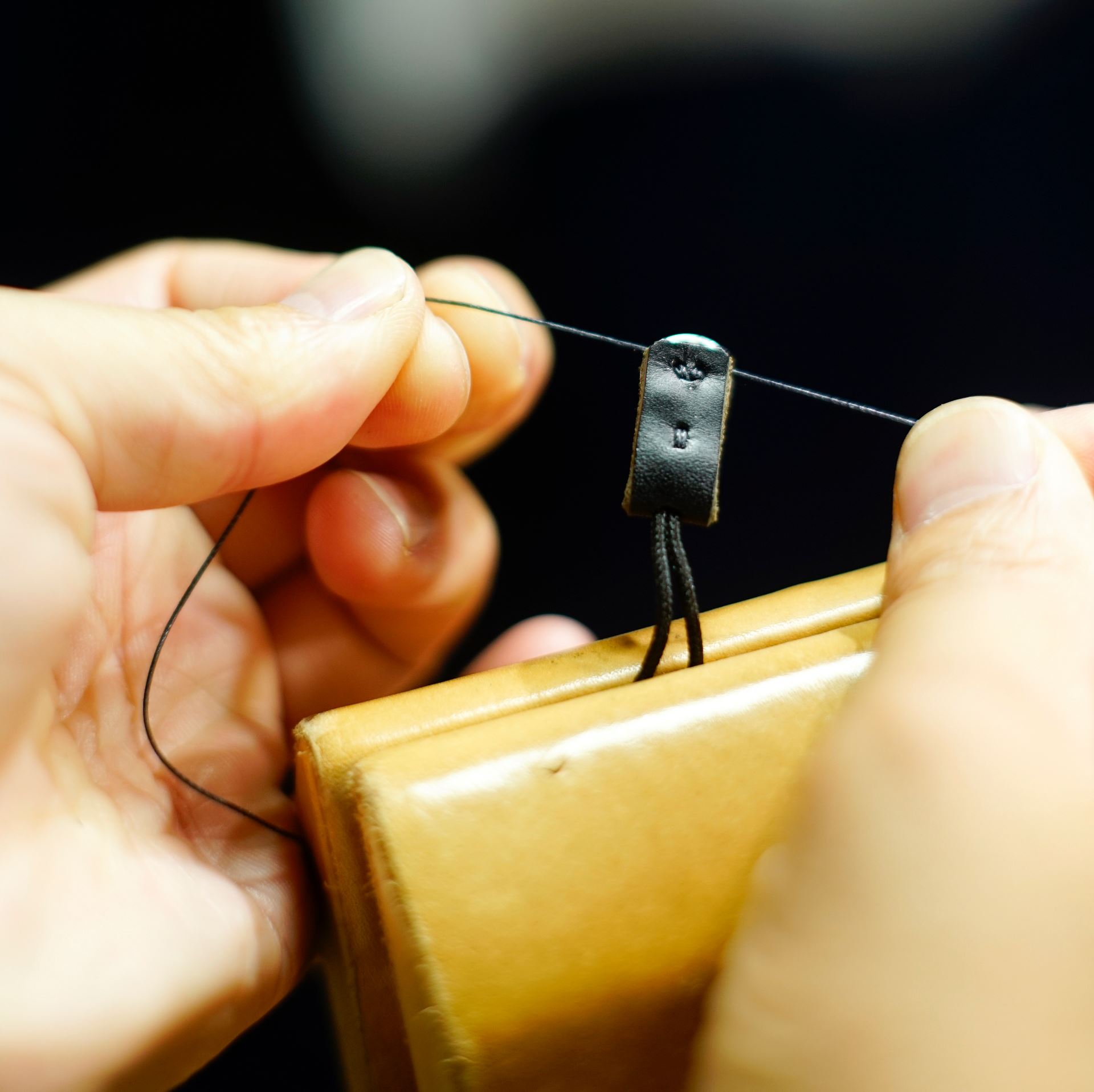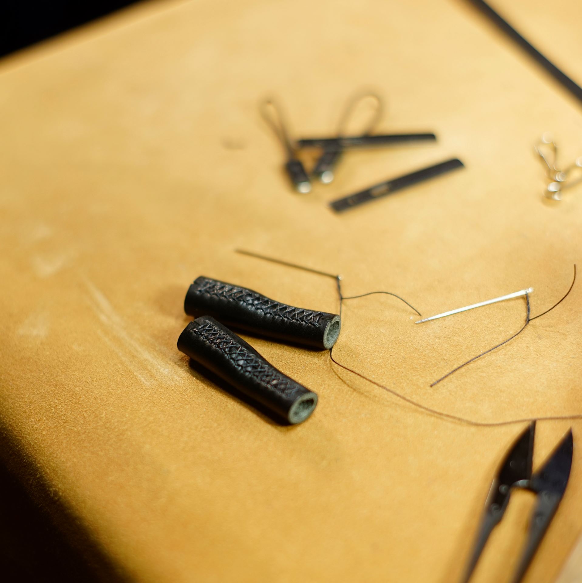 金具のソケット部分を縫います。こちらもすべて手縫いです。