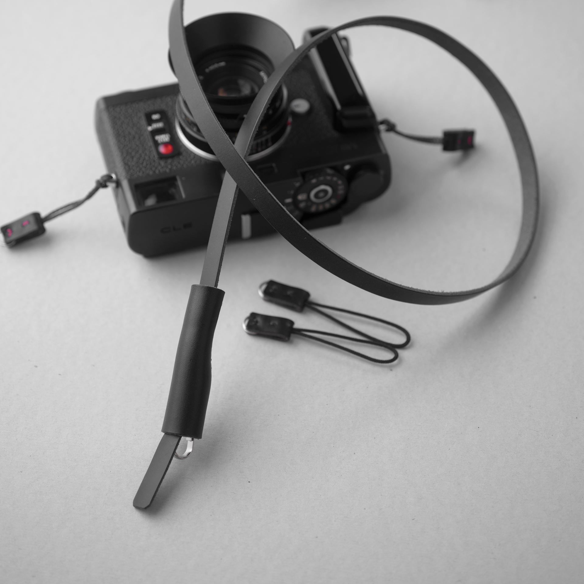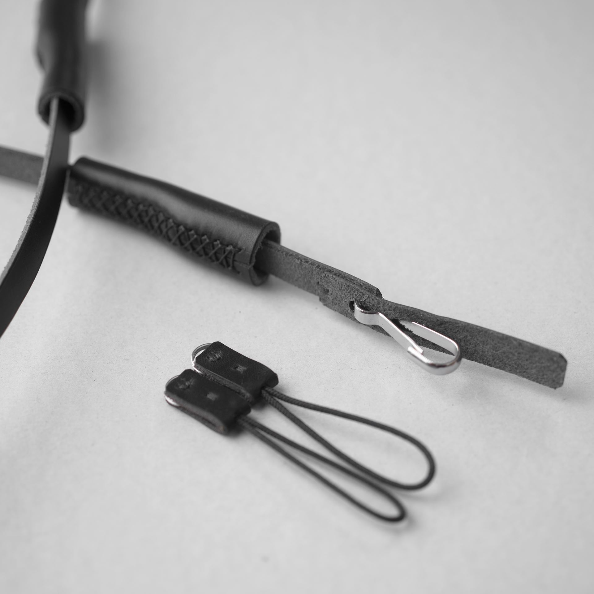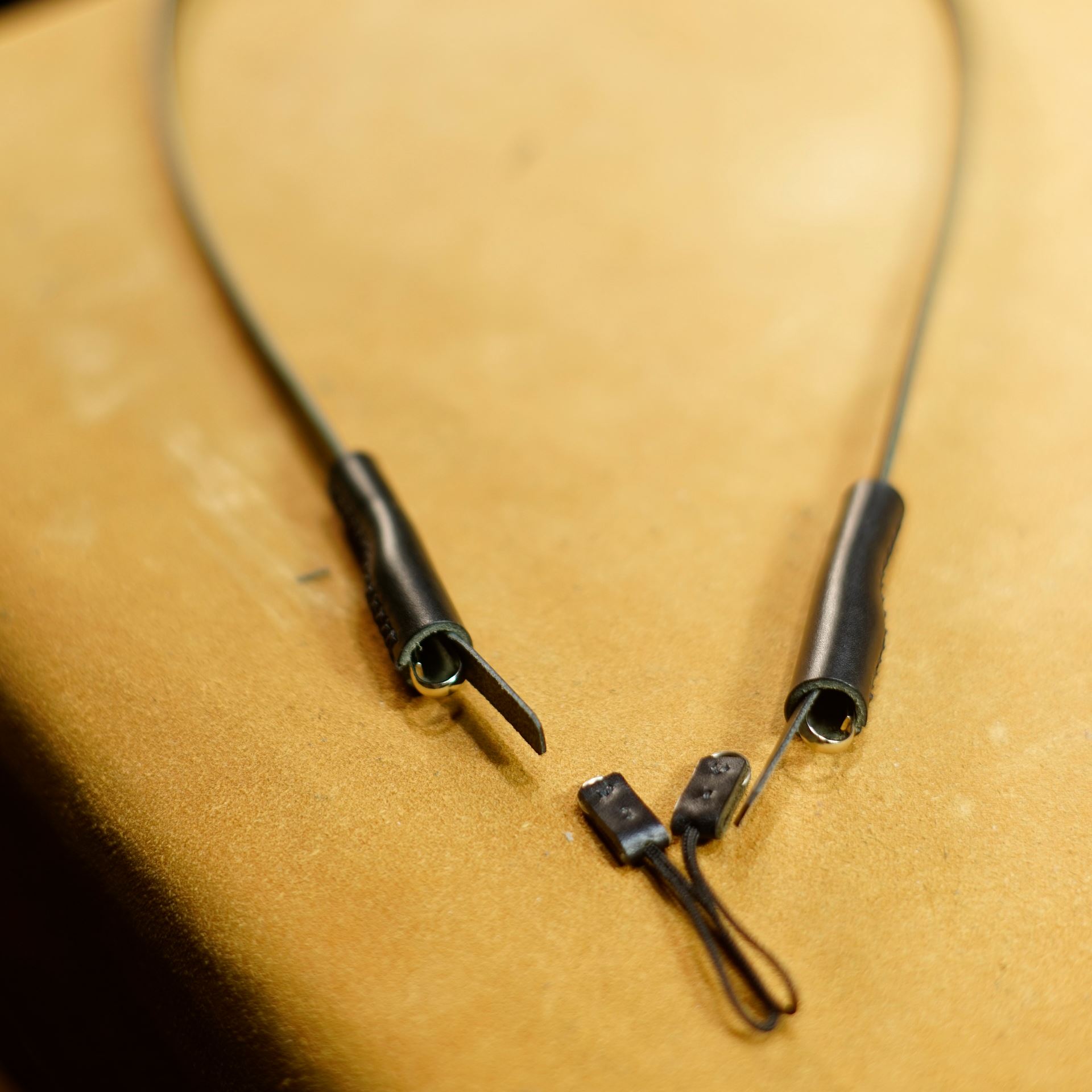 黒革に黒ステッチのカメラストラップ3型が完成しました。しつこいですが、写真ではコネクター1セットですが、実際は2セット制作しております。