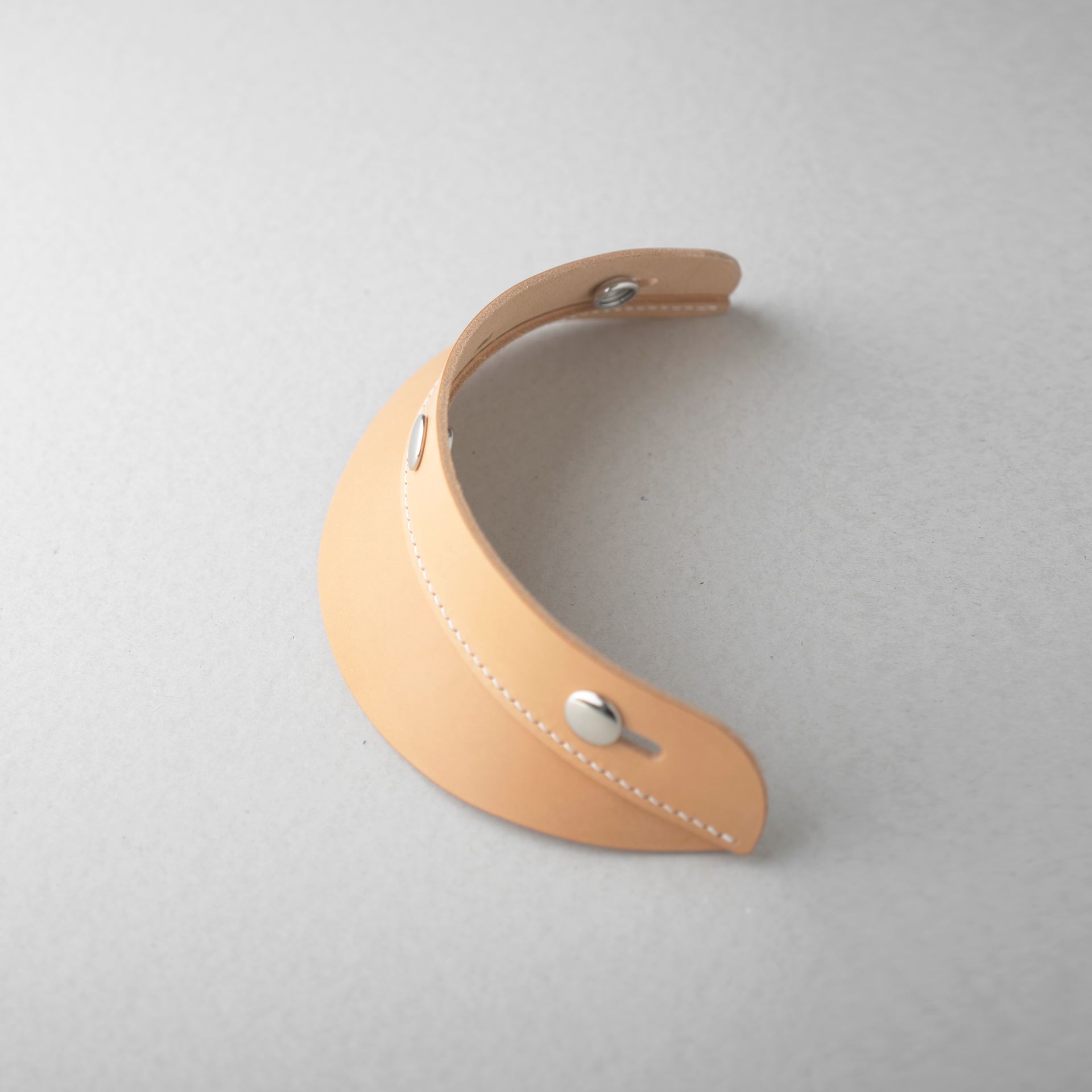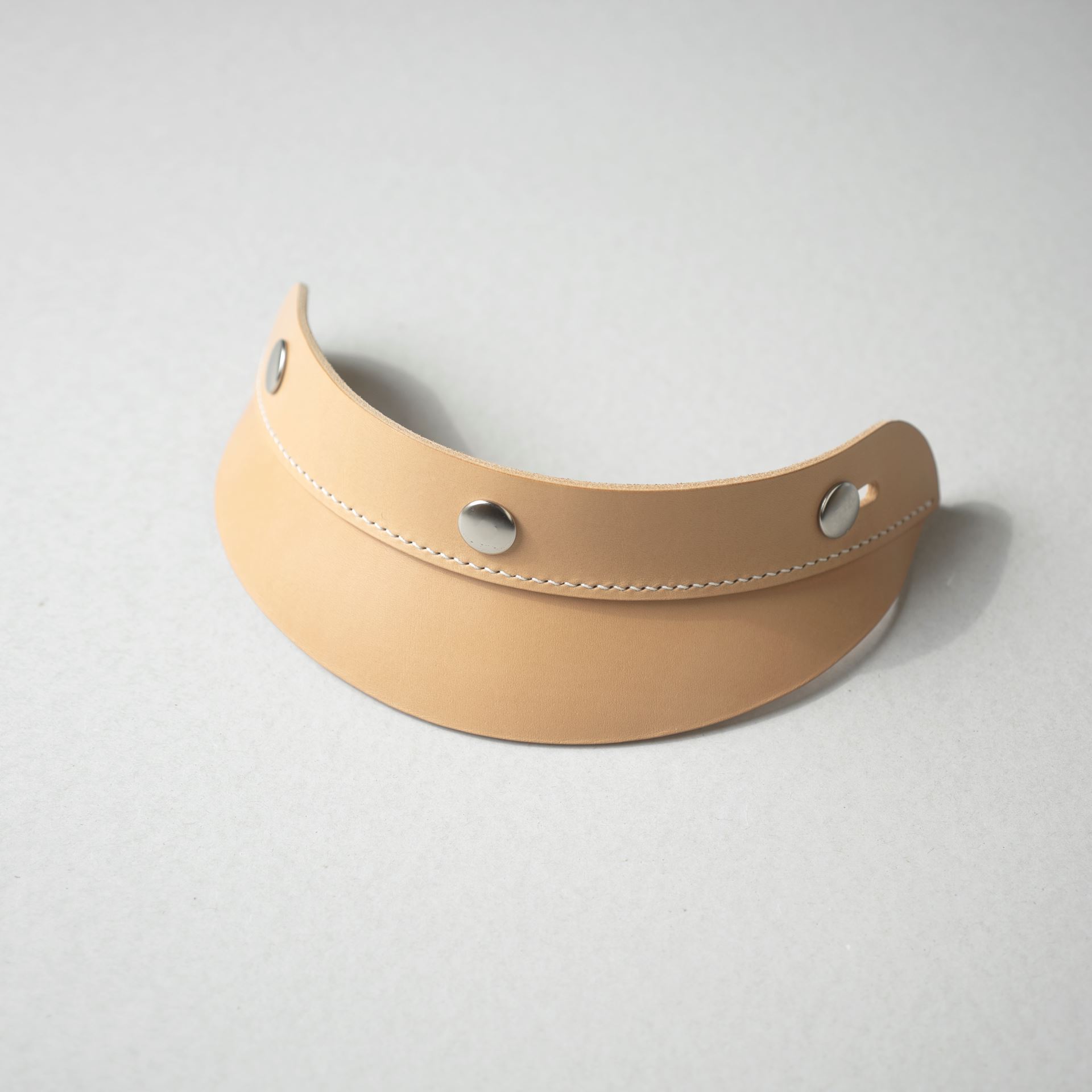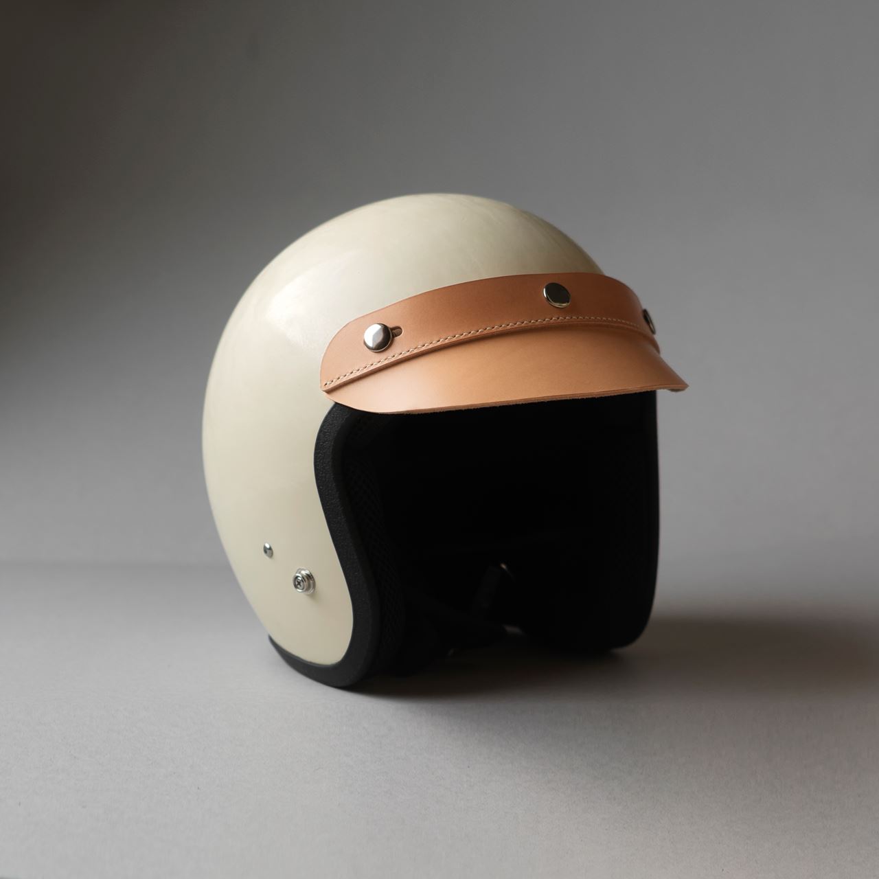 ジェットヘルメットなどに取り付けるタイプのバイザーです。漉きなしの厚みのあるヌメの1枚革を使用しています。ひさし部との連結は丈夫なリネン糸を手縫いで仕上げております。コバは切りっぱなしでエッジの立ったシャープな作りです。植物タンニン鞣し革の経年変化を楽しめると思います。両端のホックは可動しますので、大抵のヘルメットには取り付け可能です。