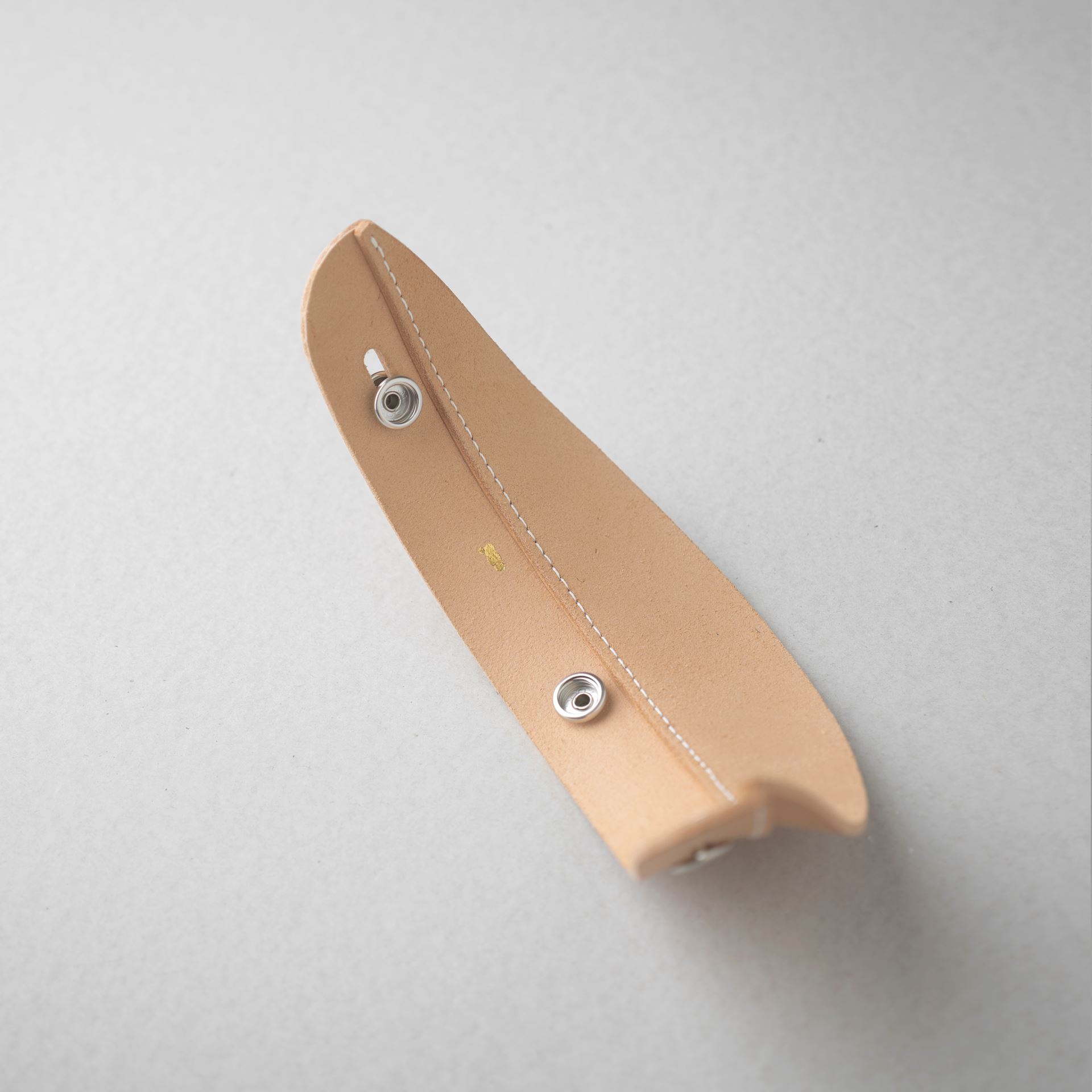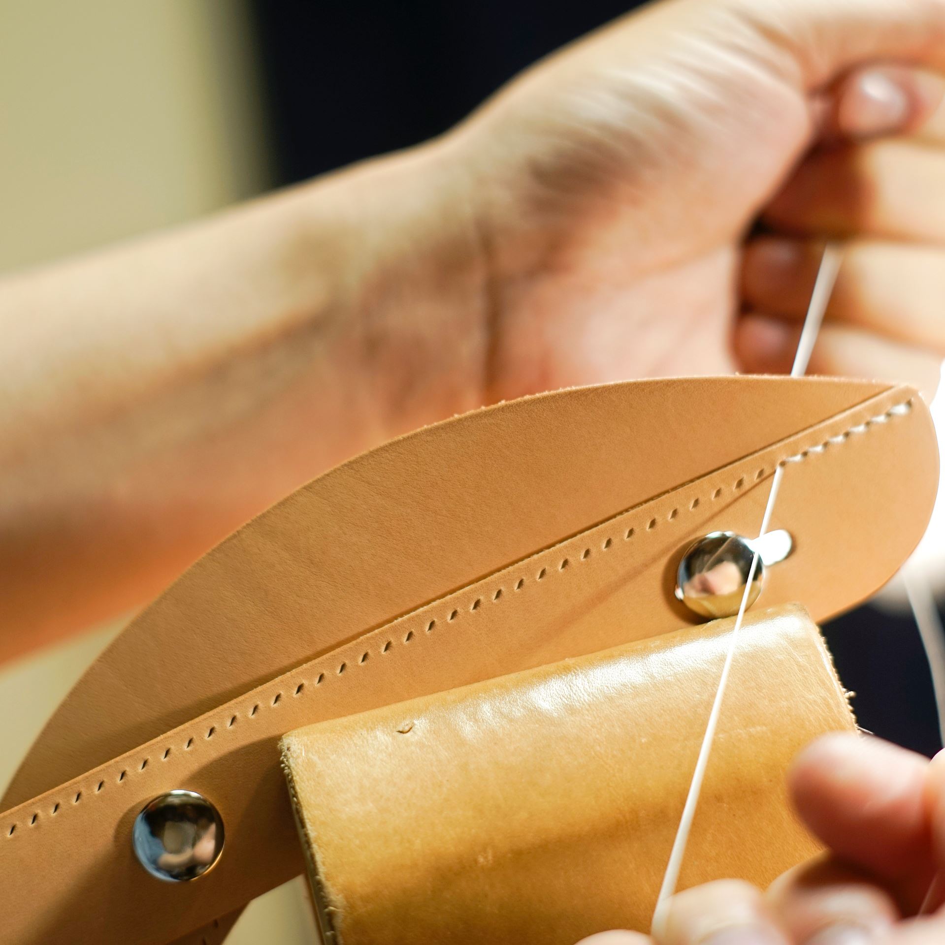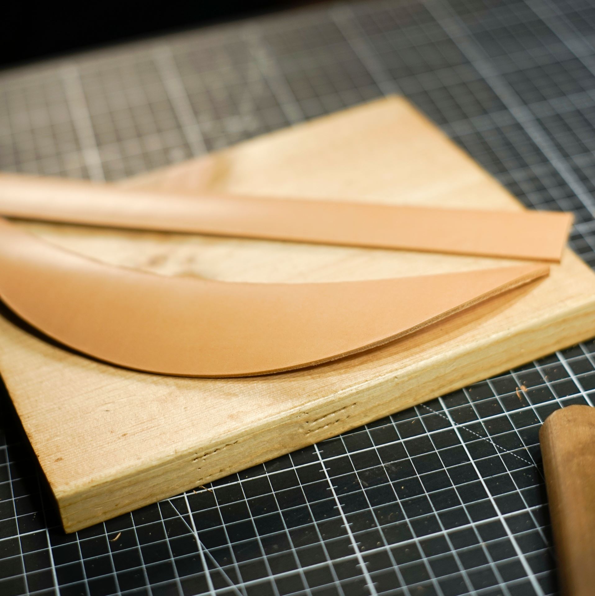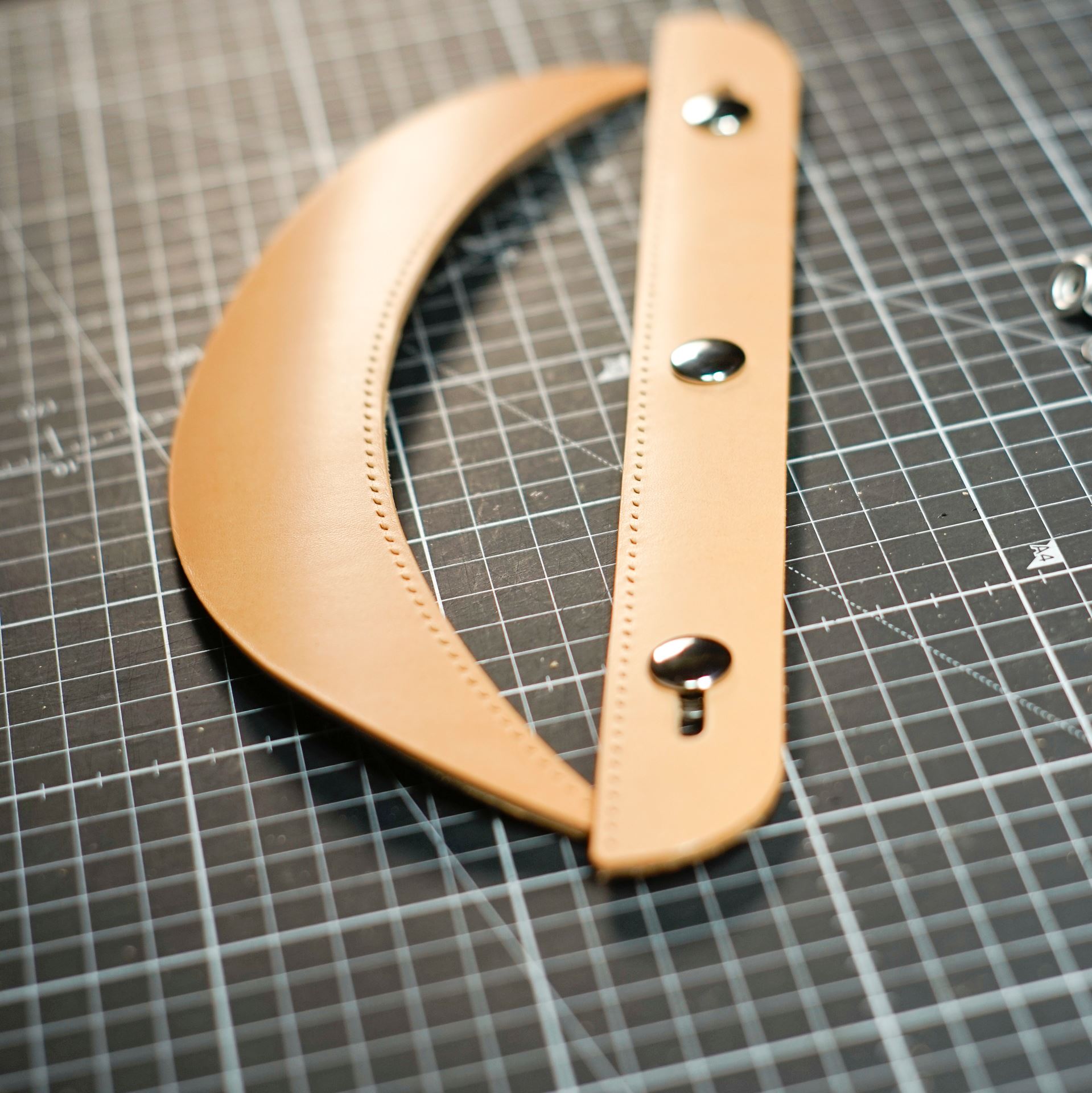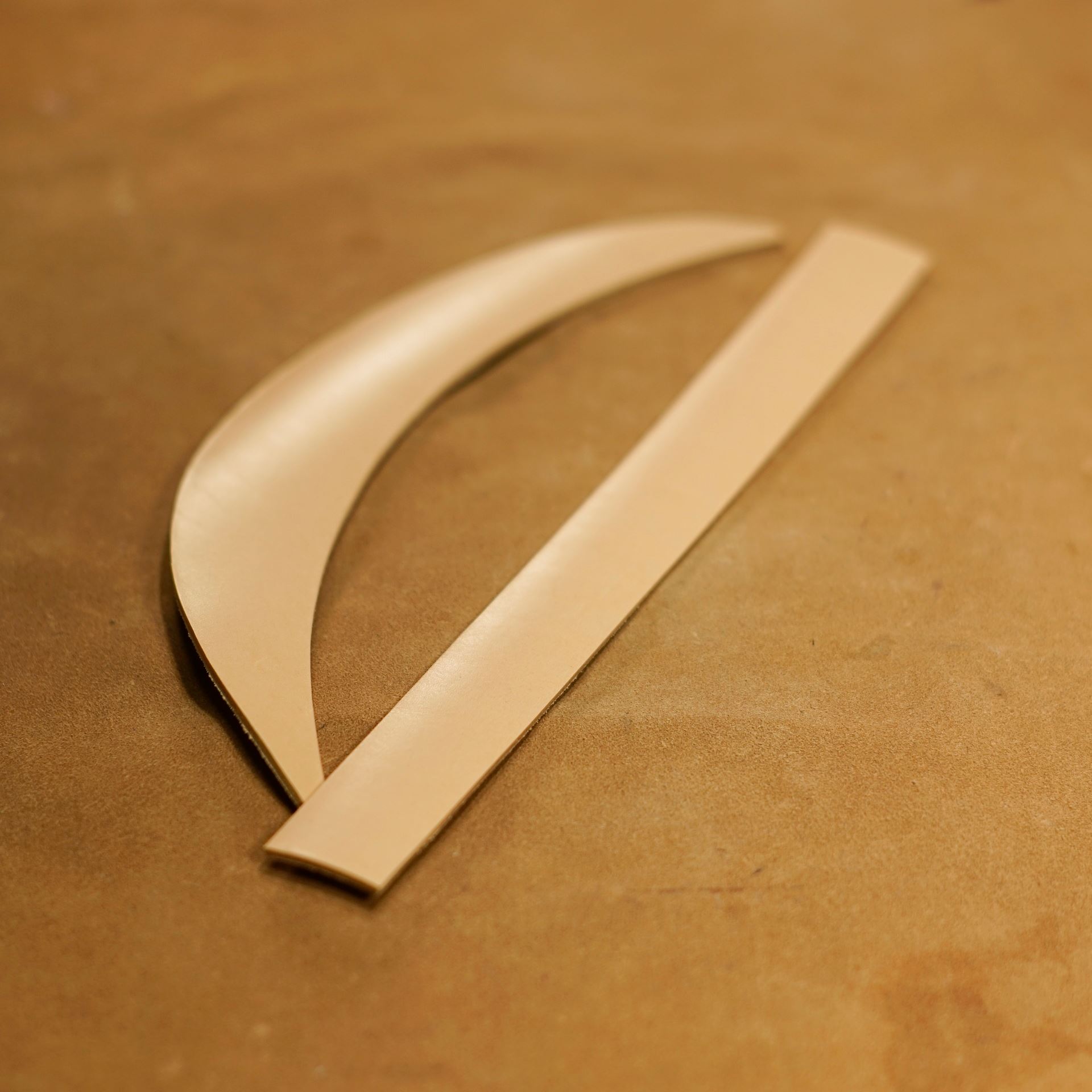 生成りのイタリアンハードをカットしてパーツを切り出します。穴あけ、目打ちとジャンパーホックを取り付けます。コバは切りっぱなしで軽くエッジを丸めておきます。