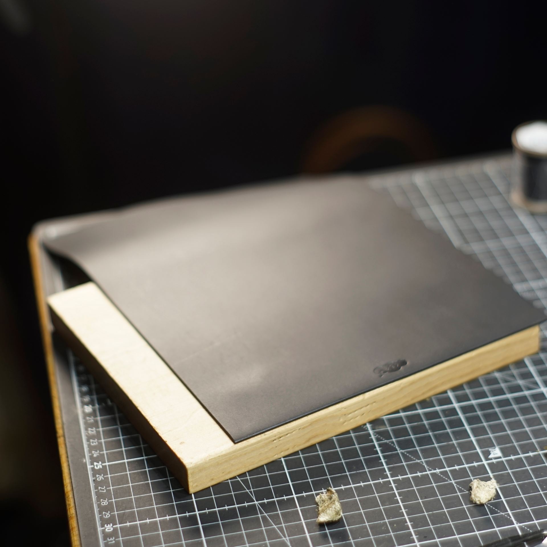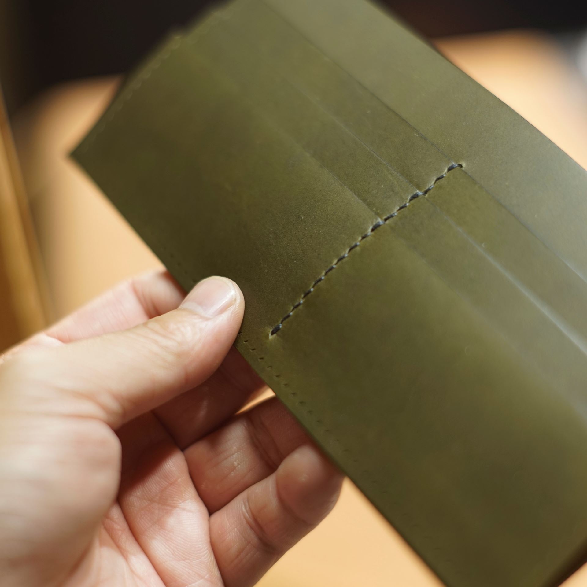 黒とオリーバのイタリアンソフトを使用して長財布を制作していきます。パーツは全て手作業で切り抜き、刻印を打刻して磨けるコバは磨いておきます。