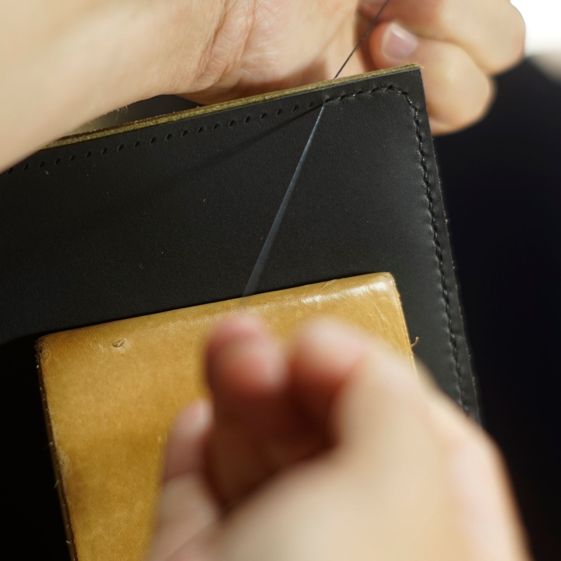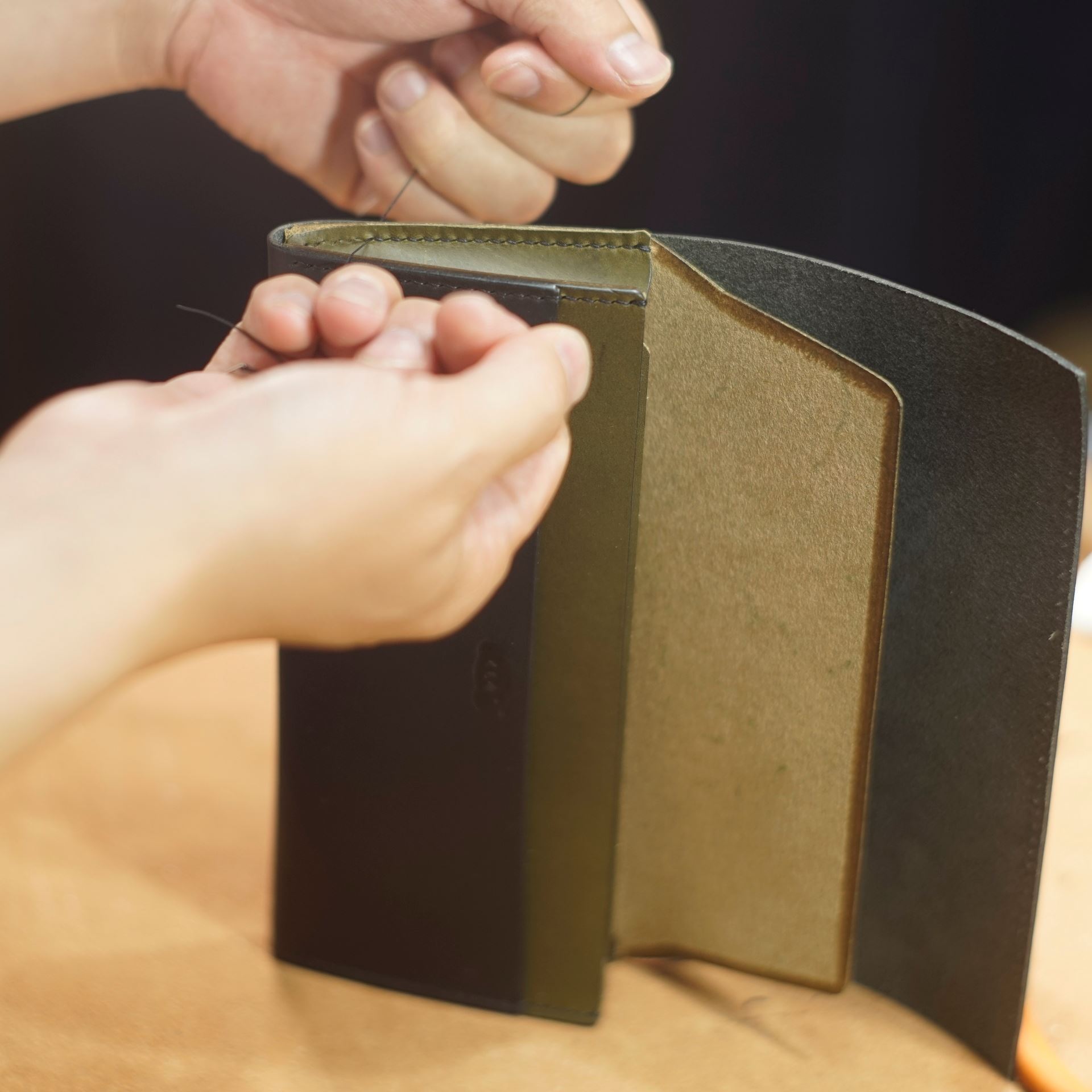 昨日からの続きです。各パーツを手縫いで組み上げていきます。まずはコインケース側の方から制作していきます。マチ、ふたを一緒にぐるりと縫います。