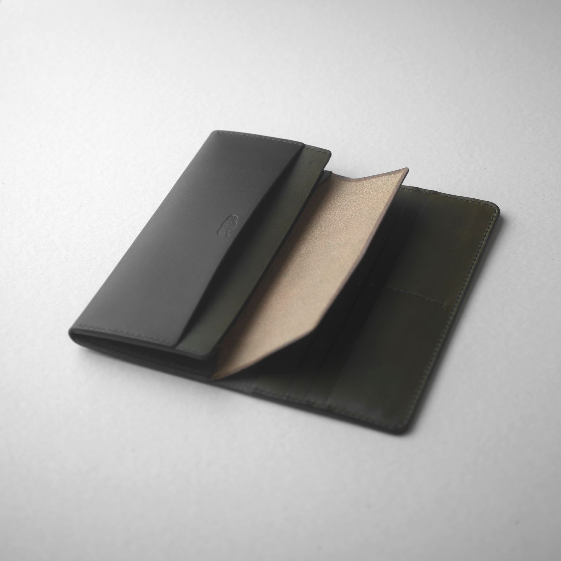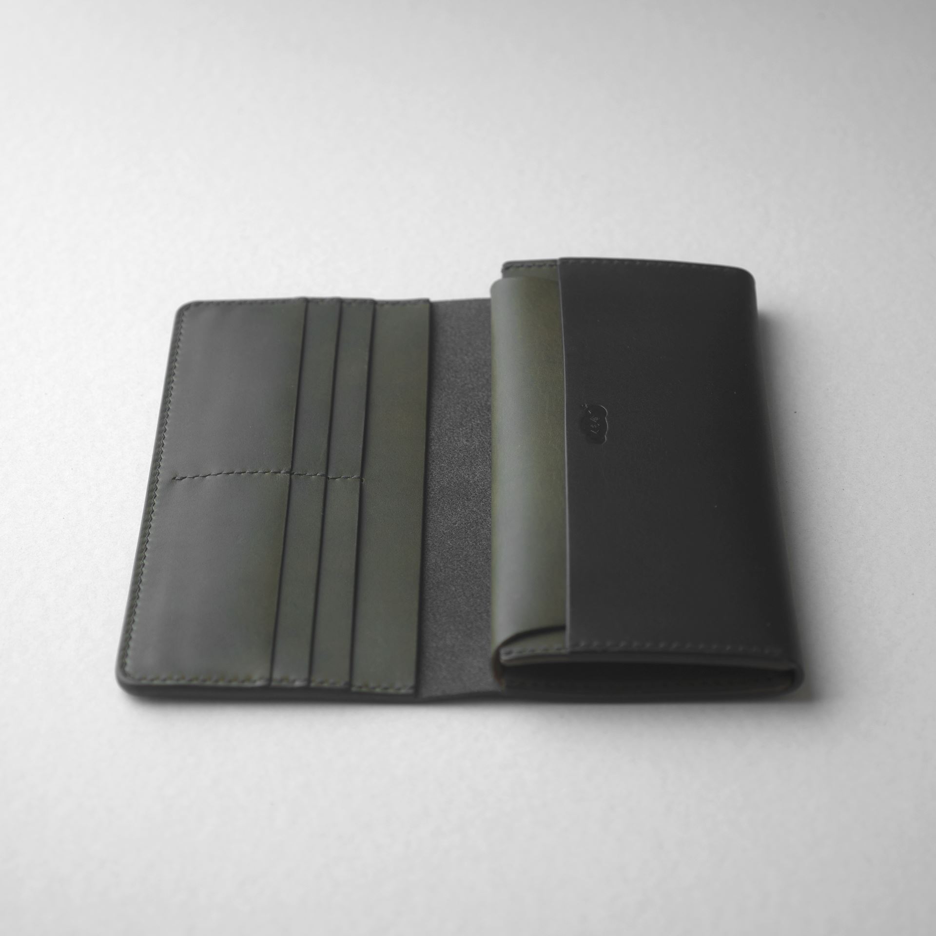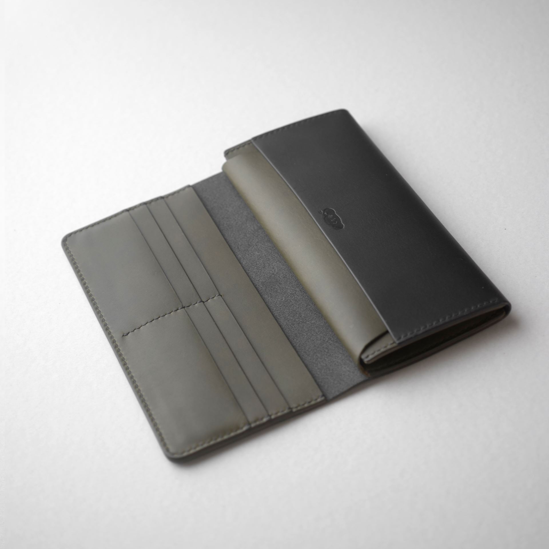 カードが6枚に、お札入が3か所、大き目のコインケース一か所のいたってシンプルな長財布です。コインを入れても広いコインケース内で広がってかさばりません。金具を一切使わず革の特性を利用した蓋でコインが落ちません。