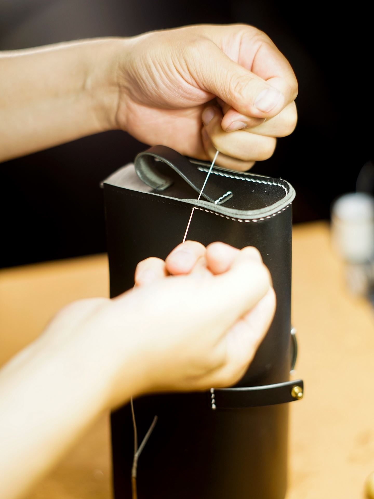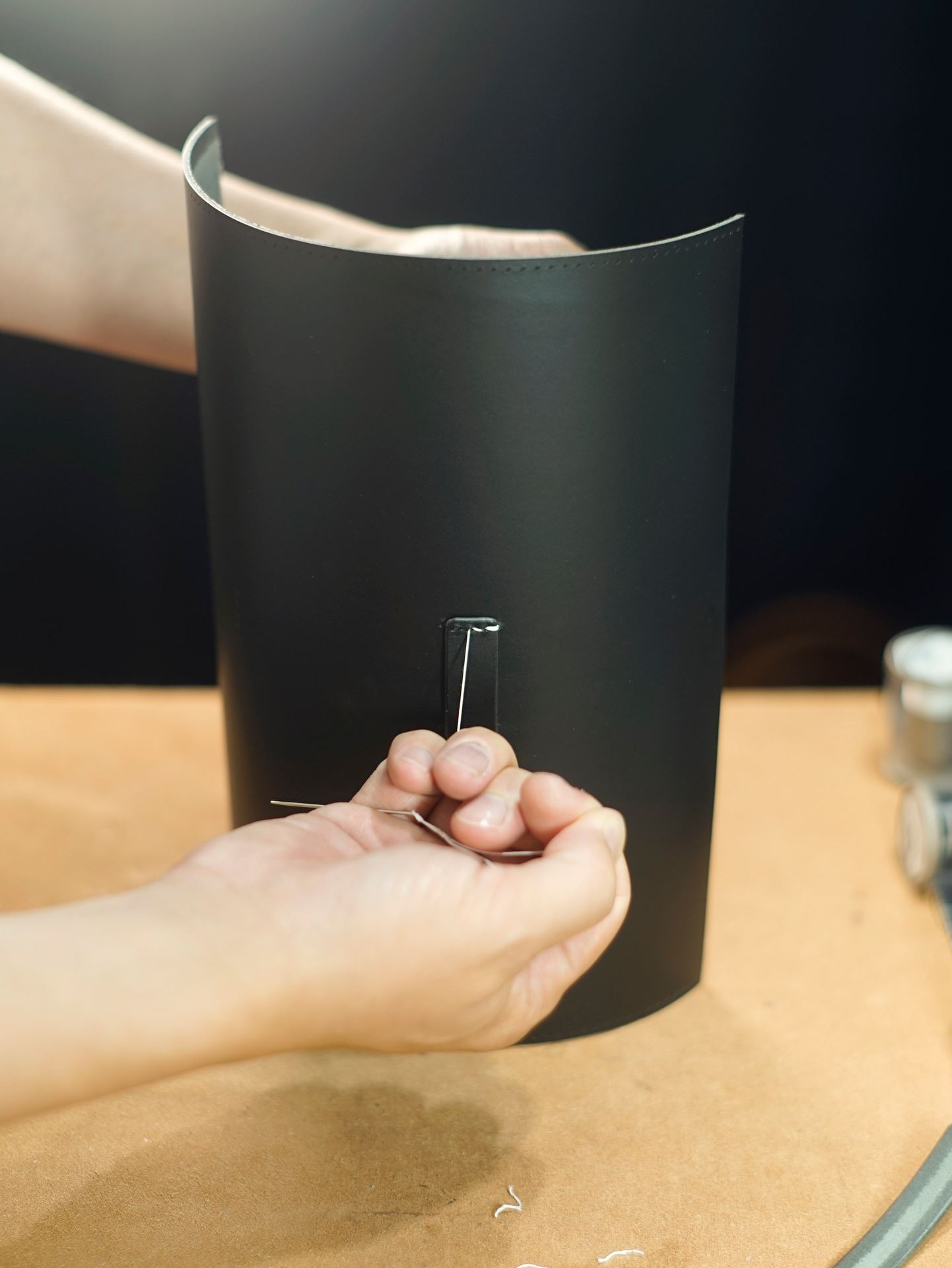 他のパーツもコバ磨きできる所は済ませておきます。だんだんとカバンの形が出来上がってきました。側面パーツの耳を手縫いしまして、今日のところはここまでとします。ステッチは六花リネン糸の07白で行います。