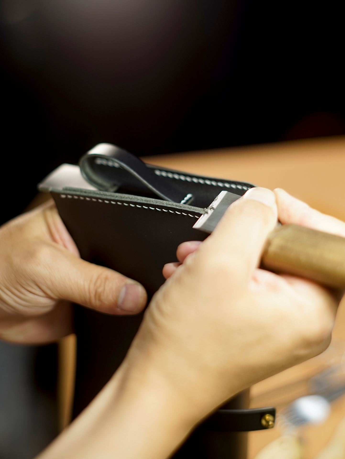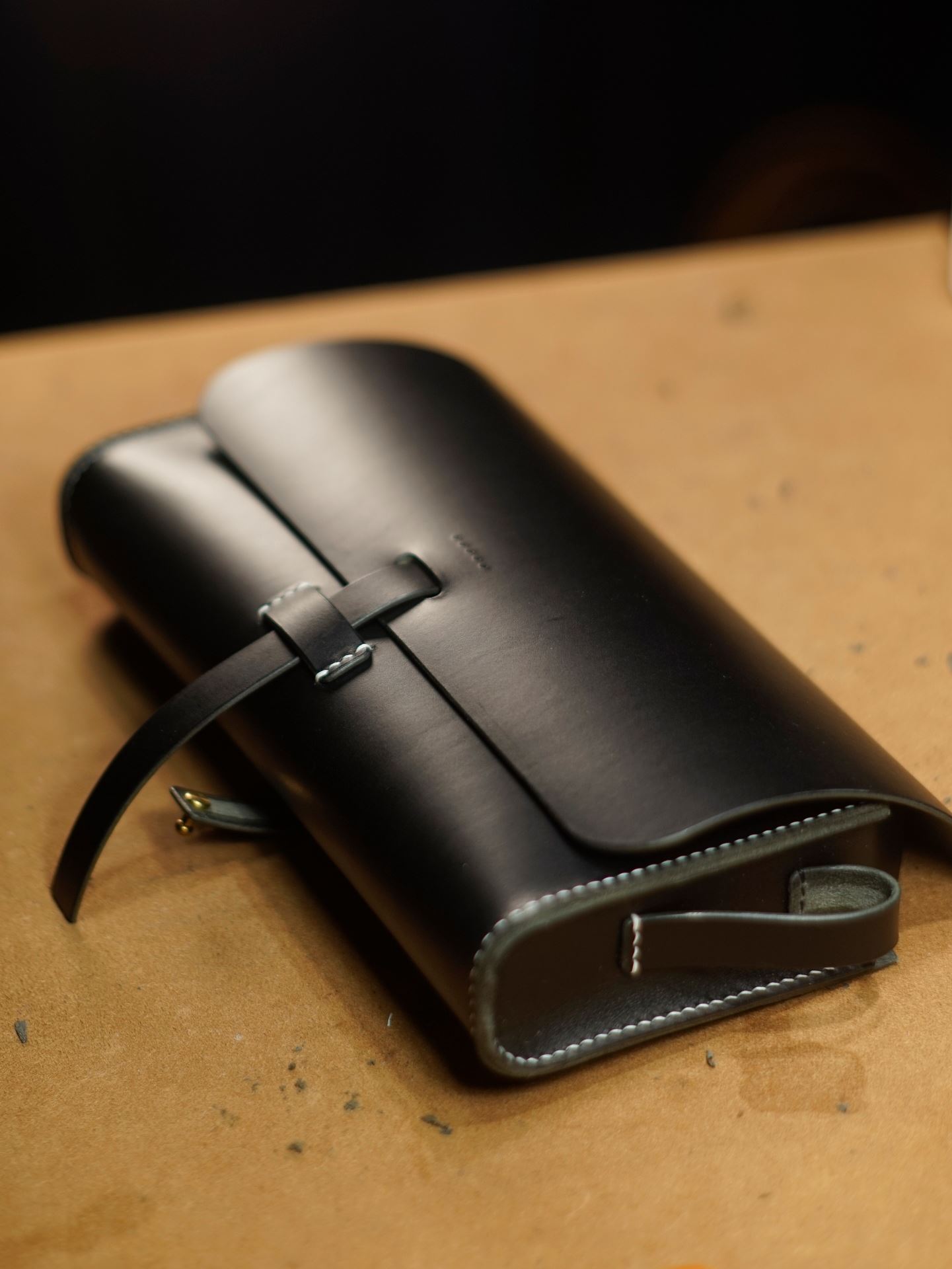 縫いあがったらコバ(革の断面)の合わせ面を綺麗に整えます。この後やすり掛けとヘチマ磨きを繰り返して滑らかに仕上げます。カバン本体にかぶせ蓋を合わせて形の確認です。少しずつ完成が近づいた感じがします。