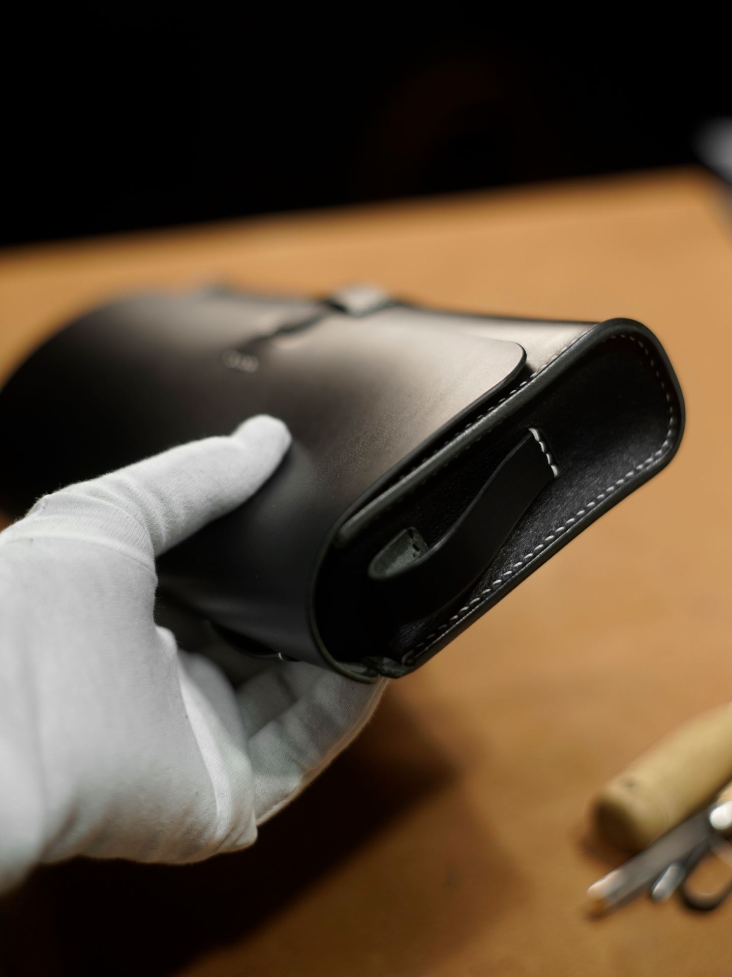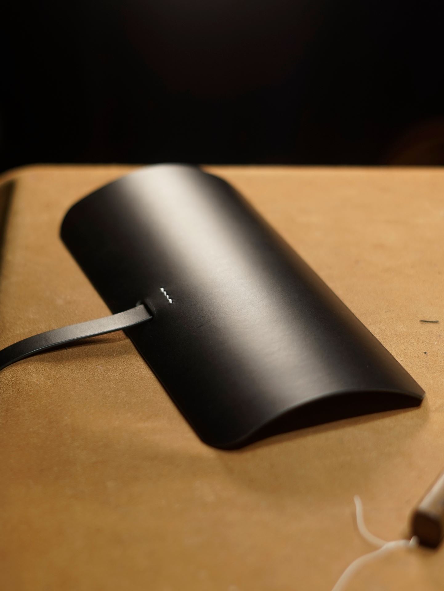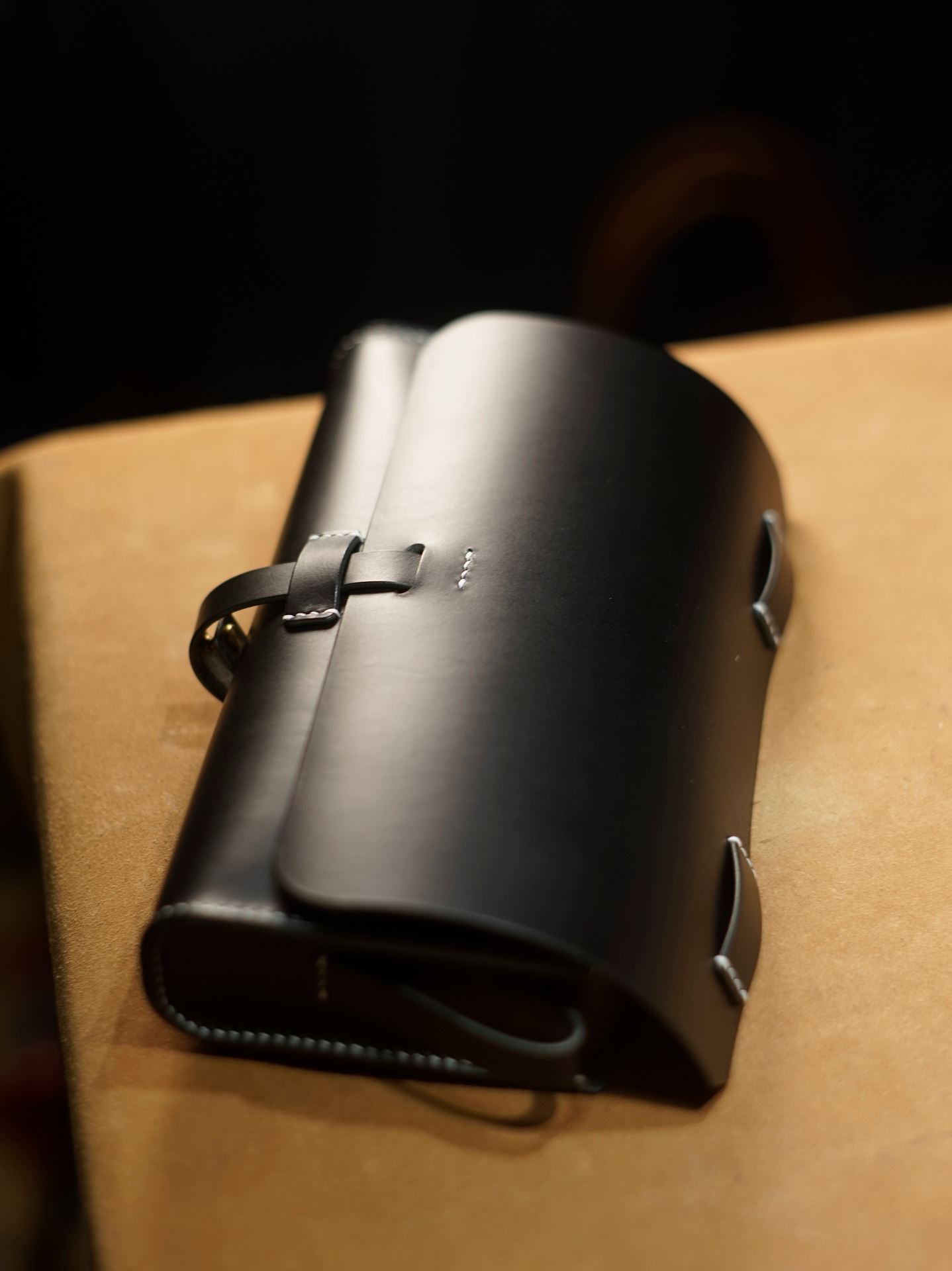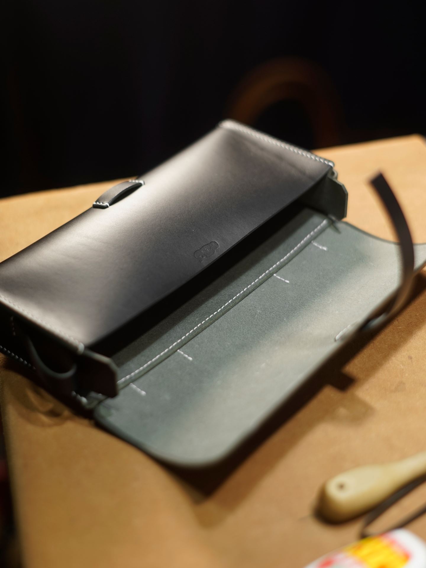 今日はかぶせ蓋の制作からスタートです。蓋にベルトを縫い付け、背面のベルトループを縫い付けるとかぶせ蓋は完成です。