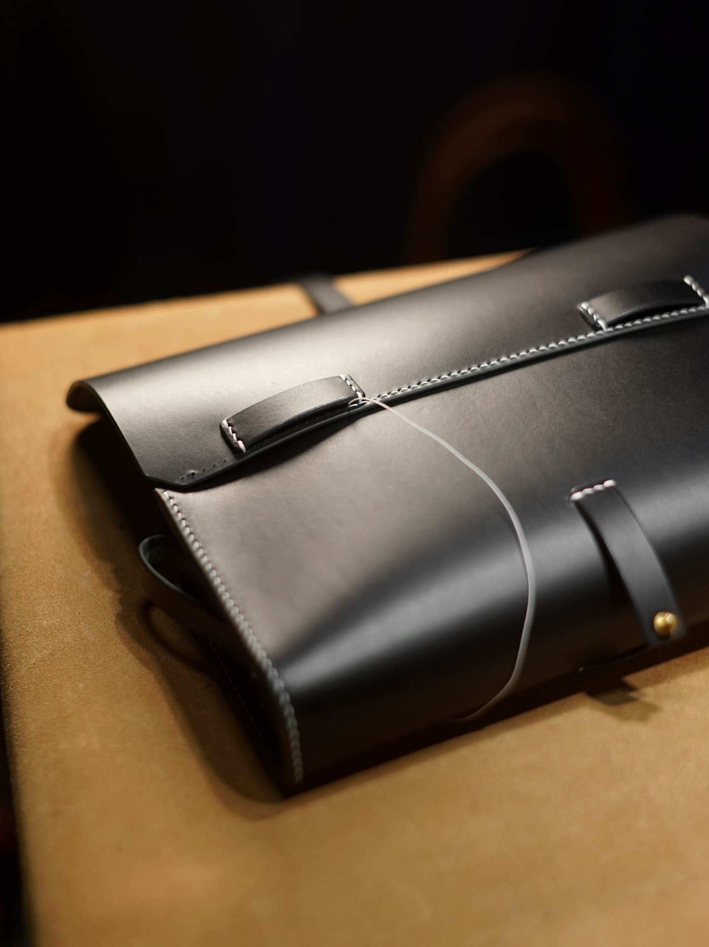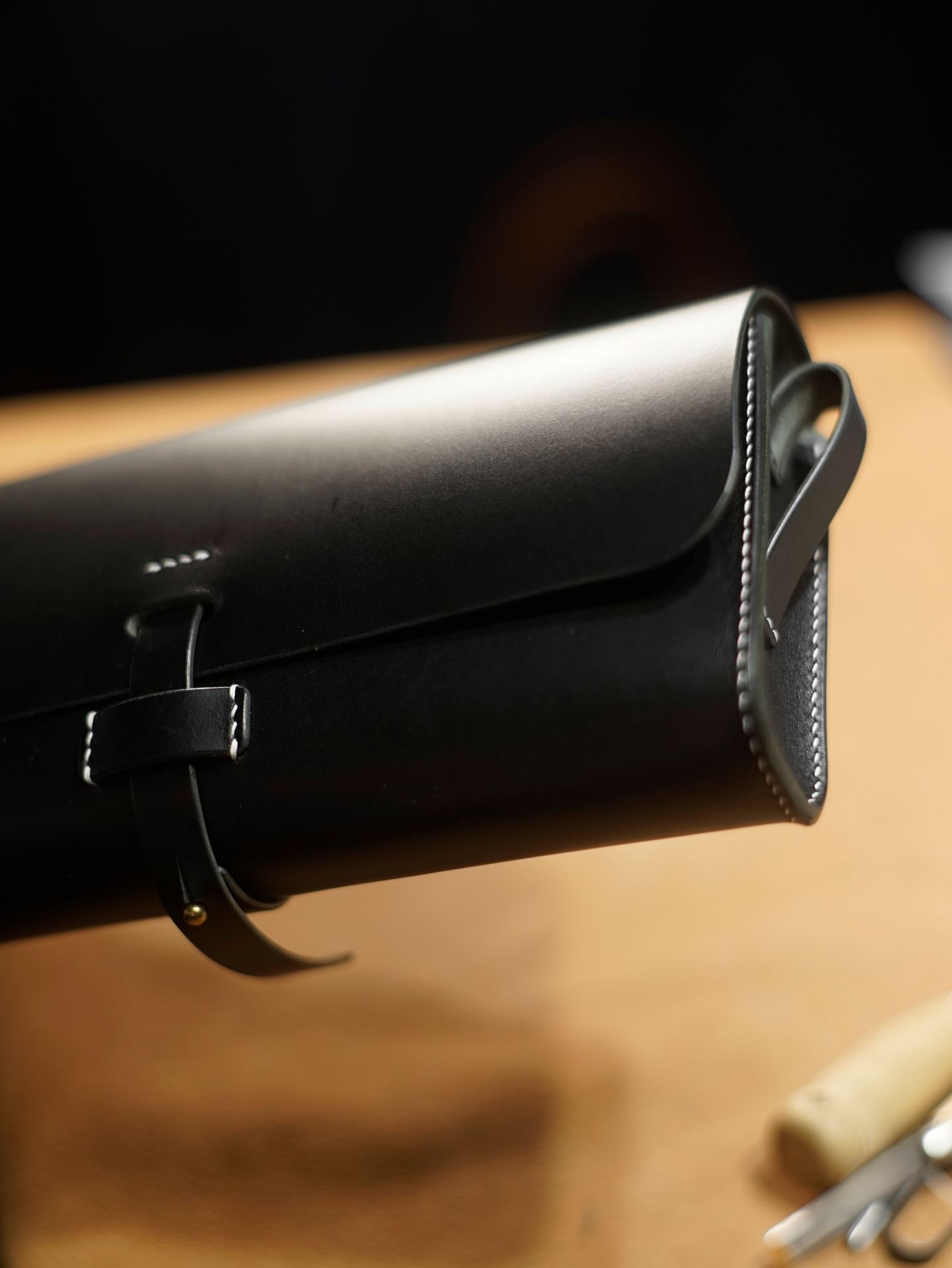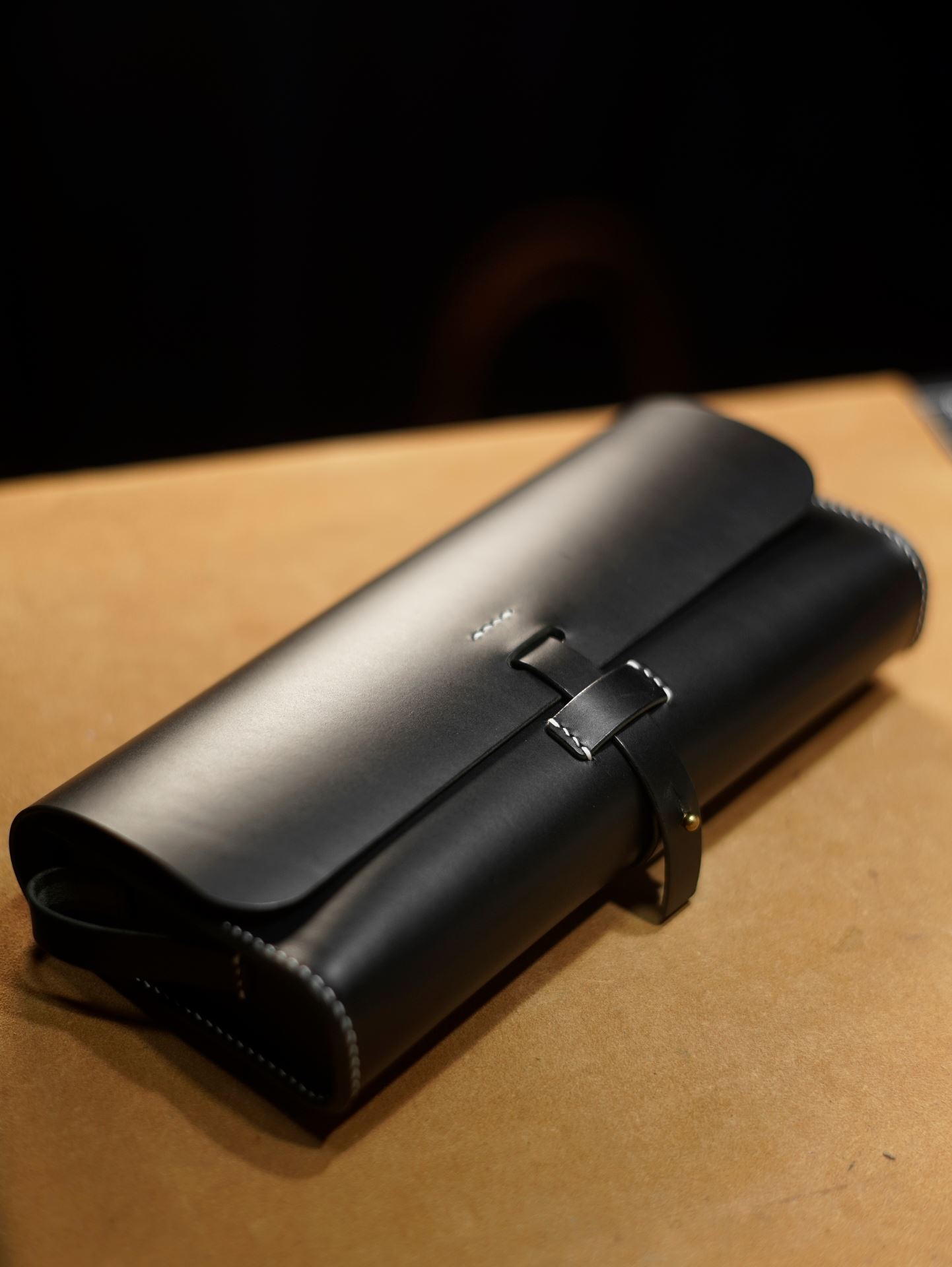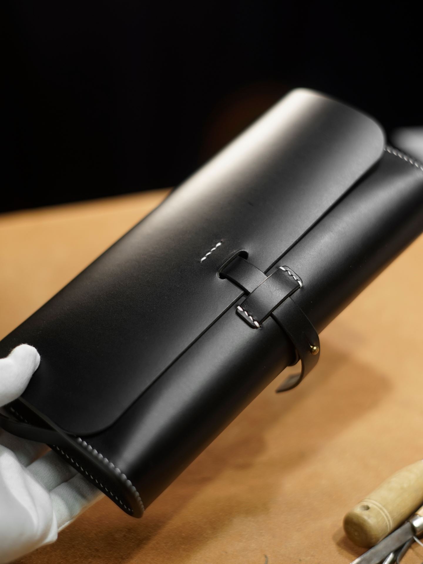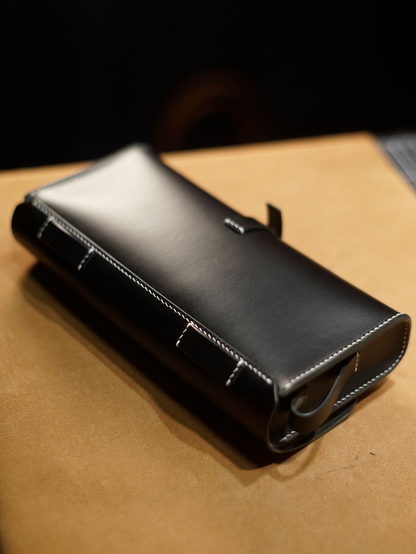 今日はかぶせ蓋の制作からスタートです。蓋にベルトを縫い付け、背面のベルトループを縫い付けるとかぶせ蓋は完成です。
