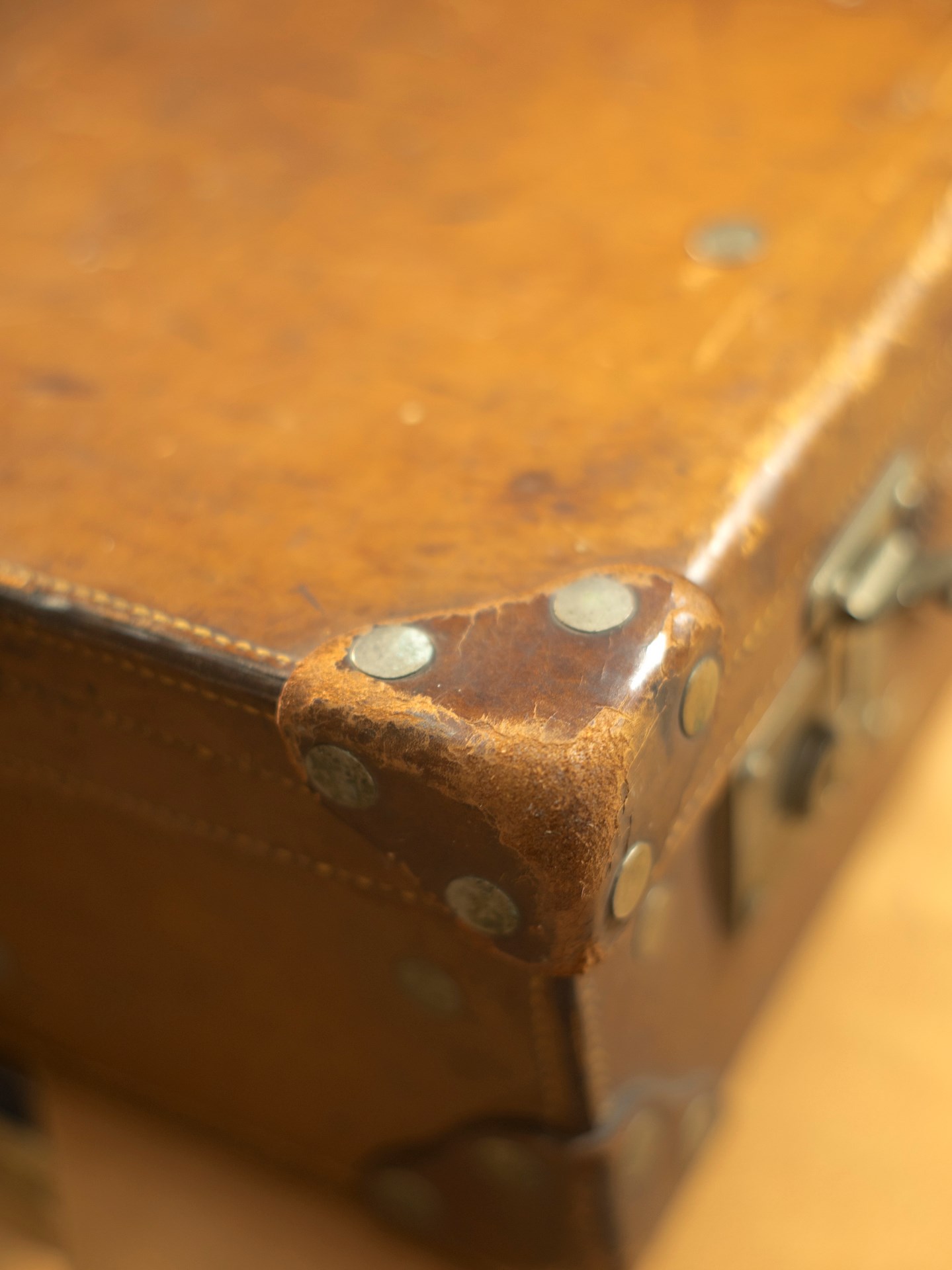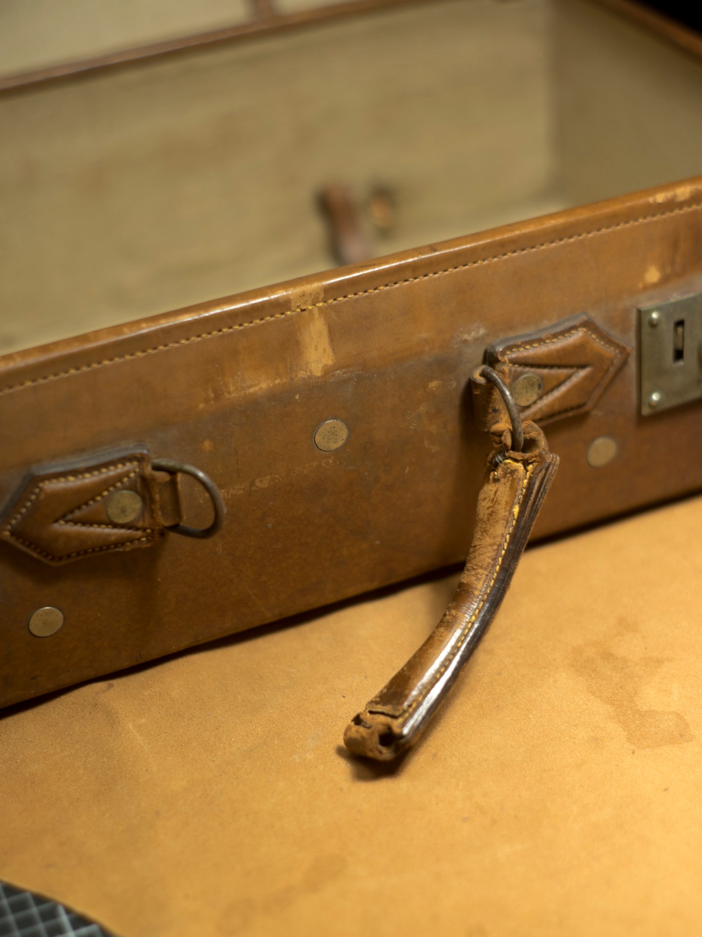 カサカサに乾燥した革、沢山の傷やひび割れ、千切れた持手など90年の歴史を物語ります。