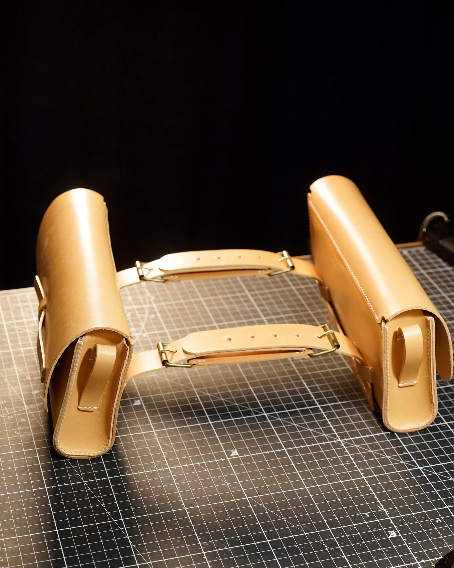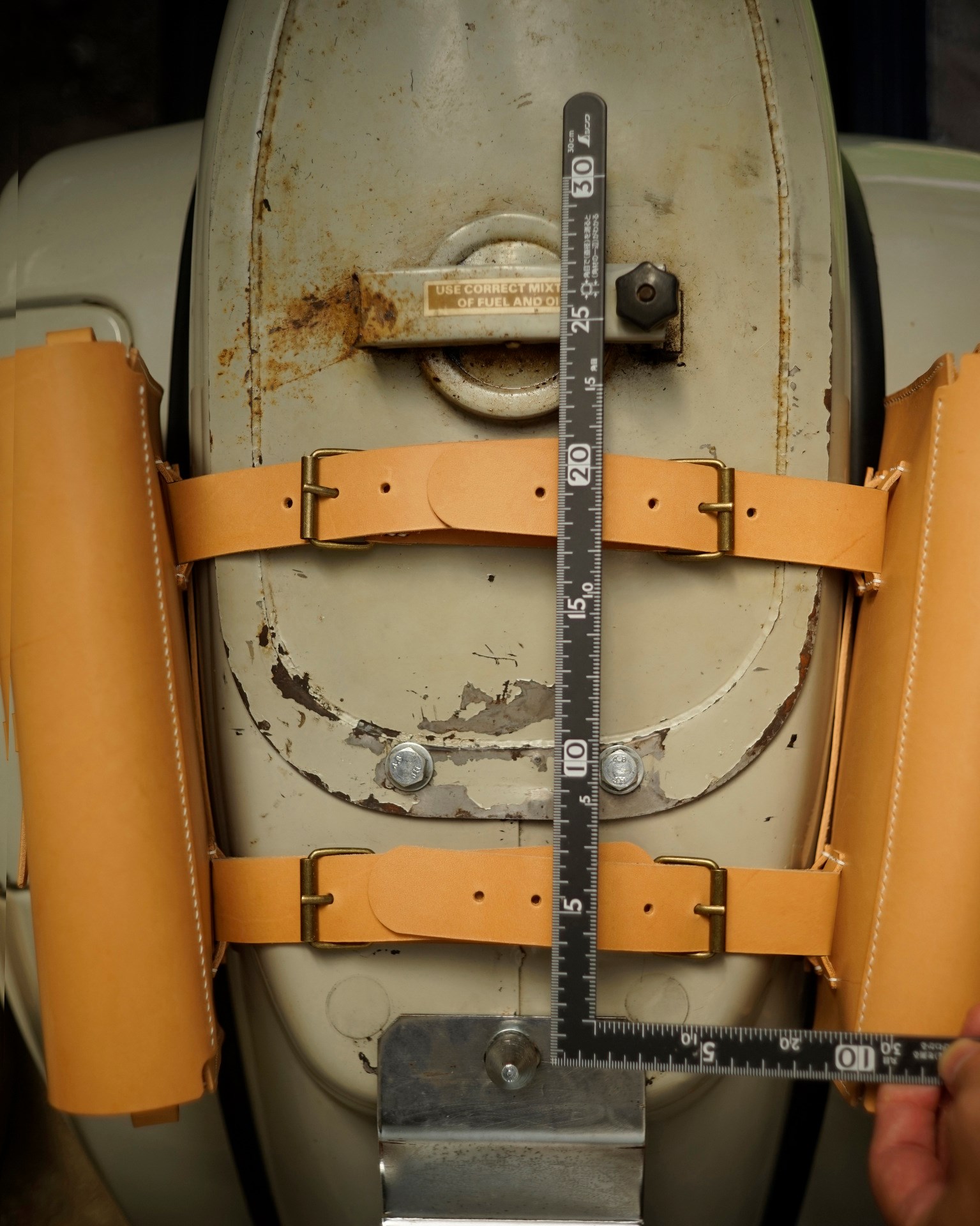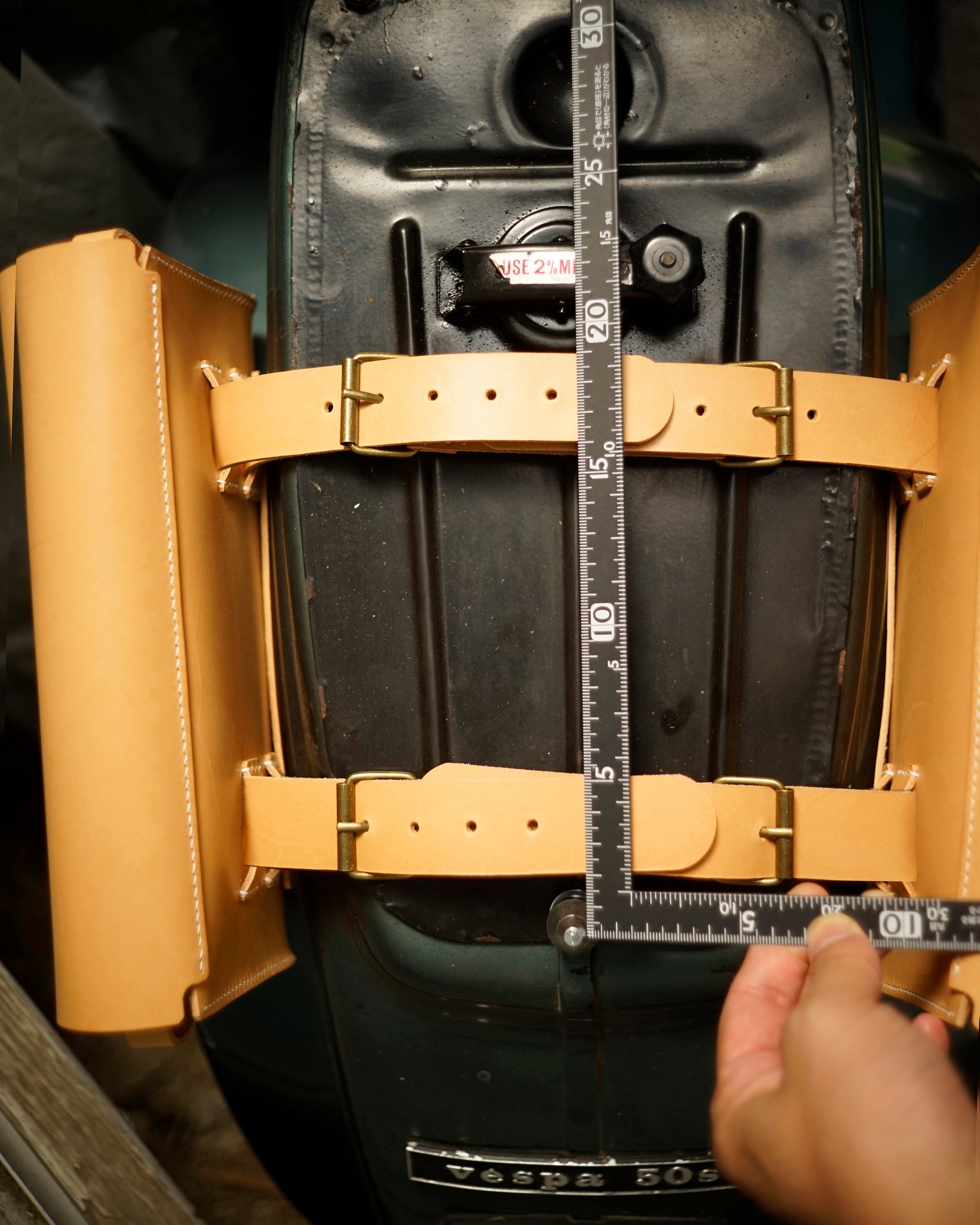 ベルトを仮付けしてベスパへの取り付けチェックを行いました。大体計算通りのサイズで、ラージフレーム、スモールフレームのどちらのベスパにも取り付けられました。