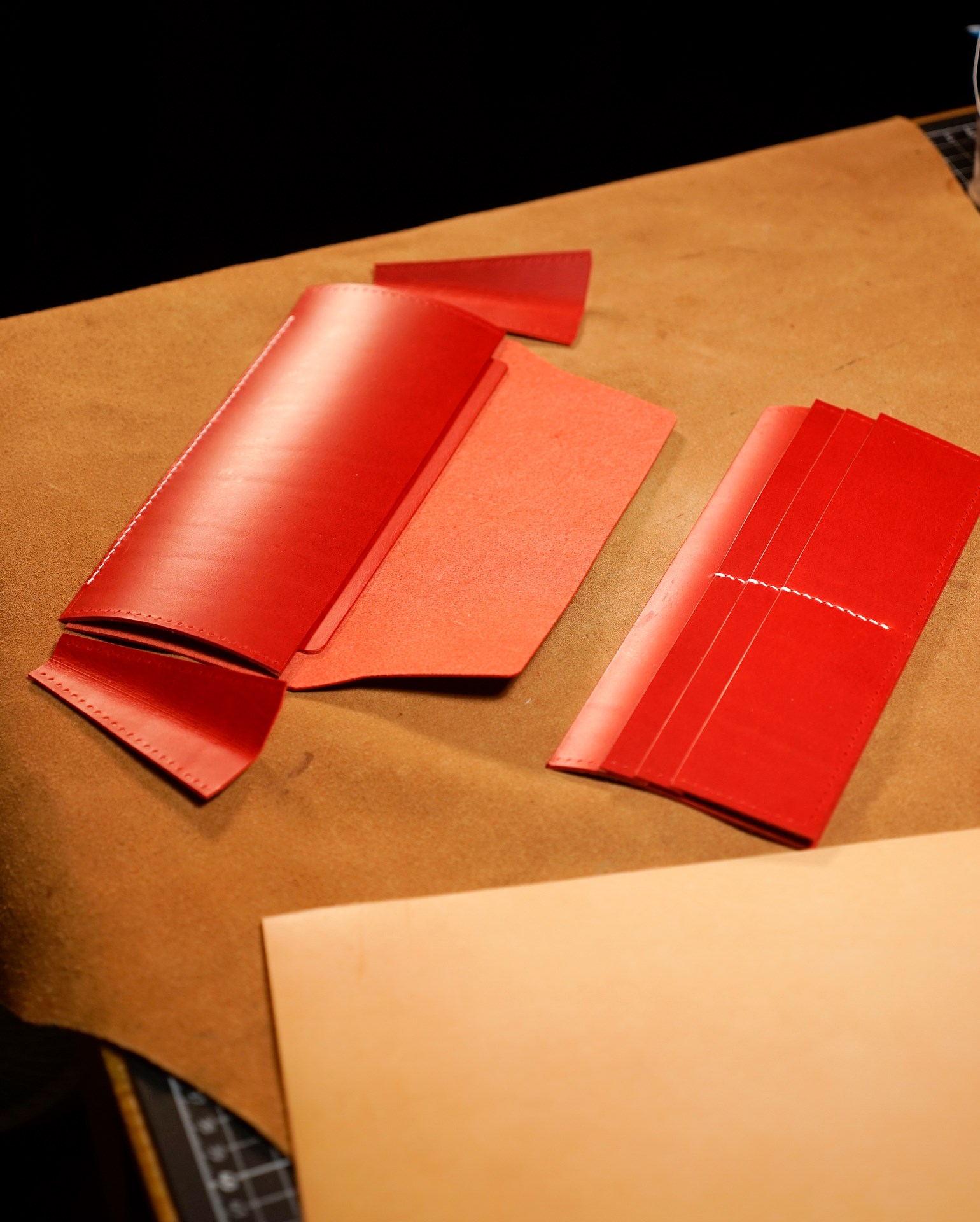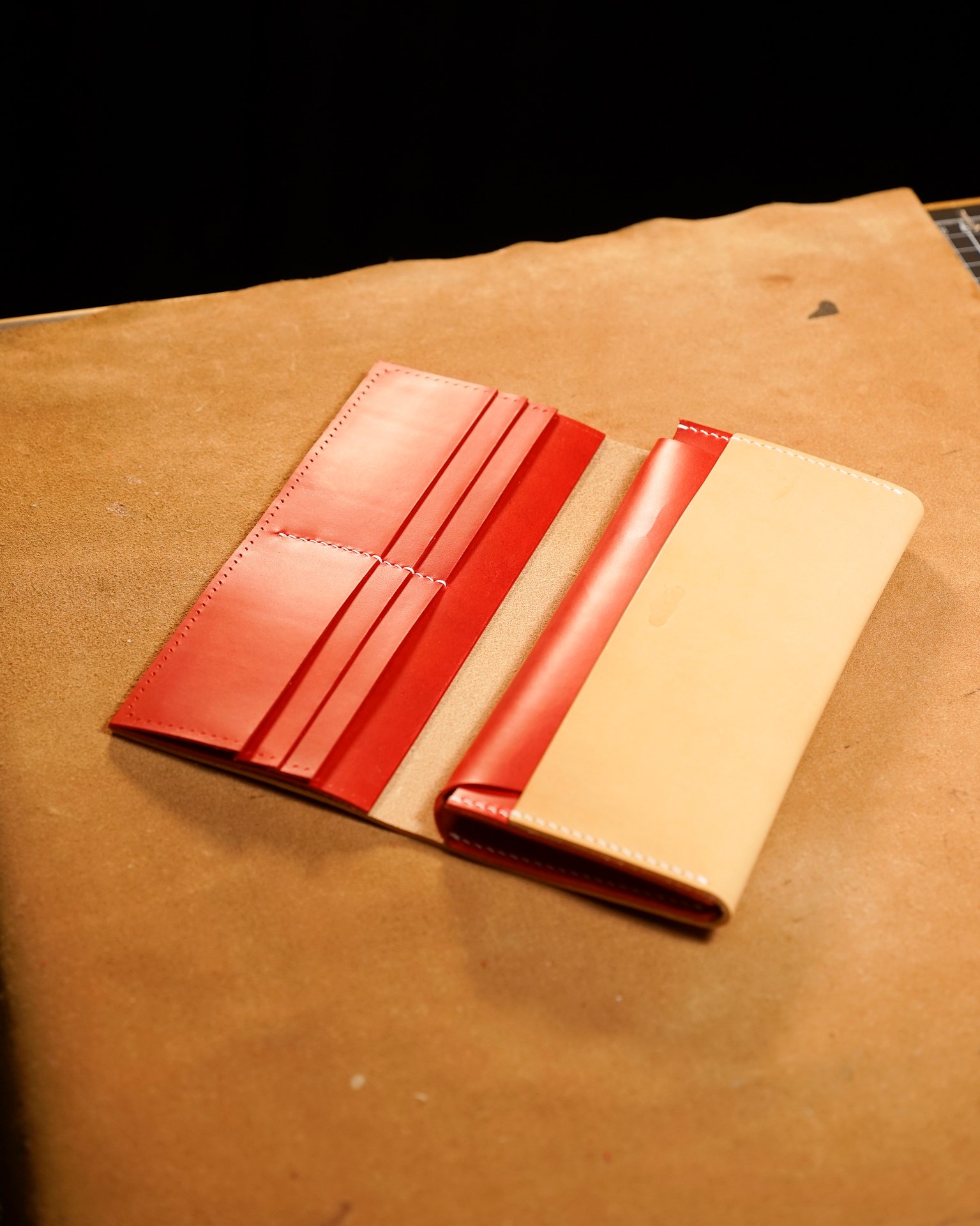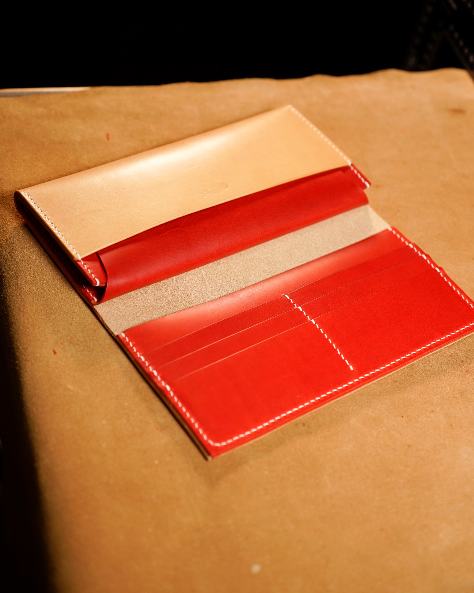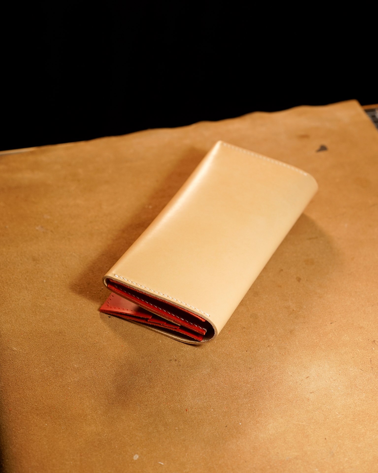 We are producing a long wallet type02 in natural and red custom colors. The stitching is 07 white in Rikka linen thread. The edges of the leather have been polished and each part has been finished.
