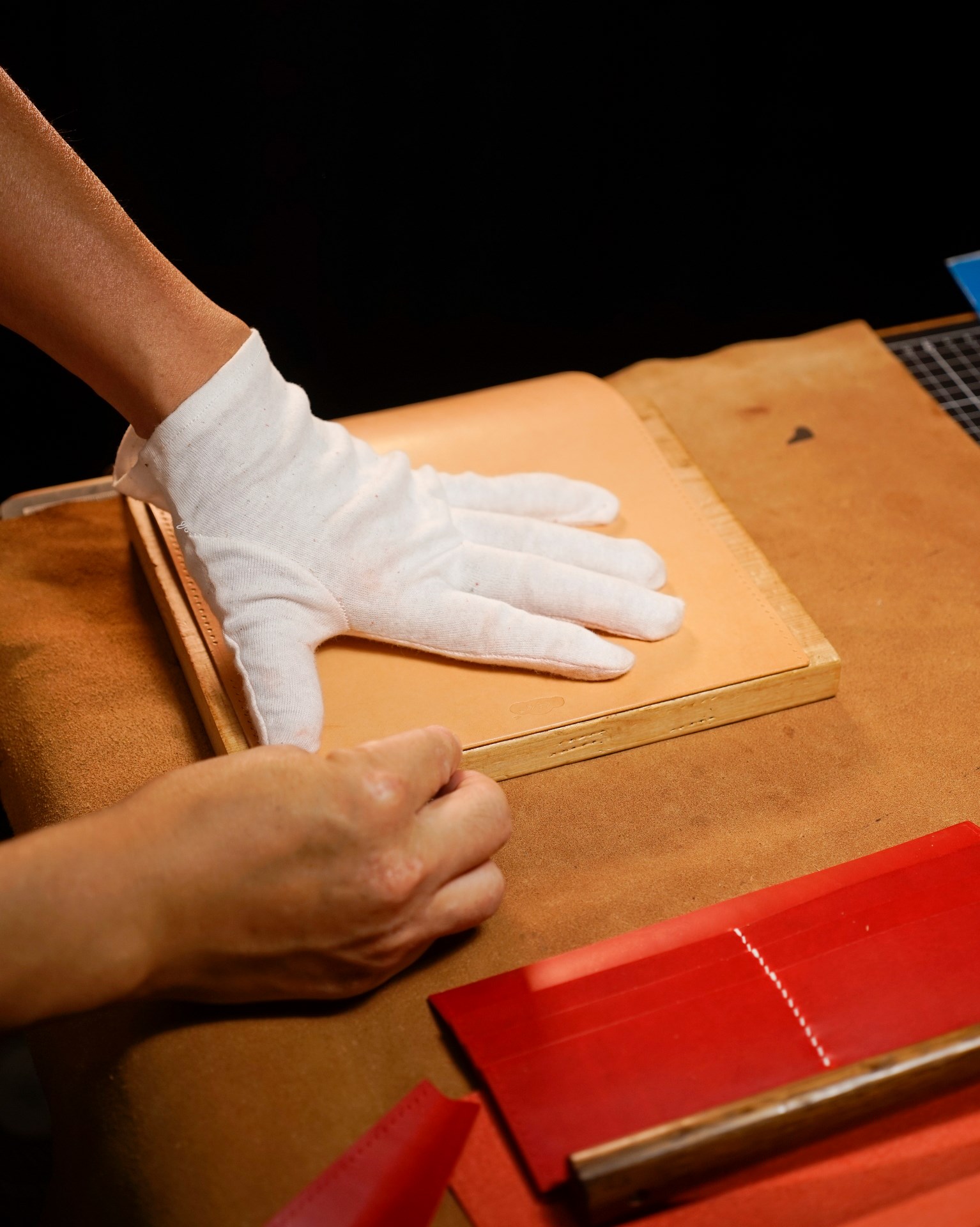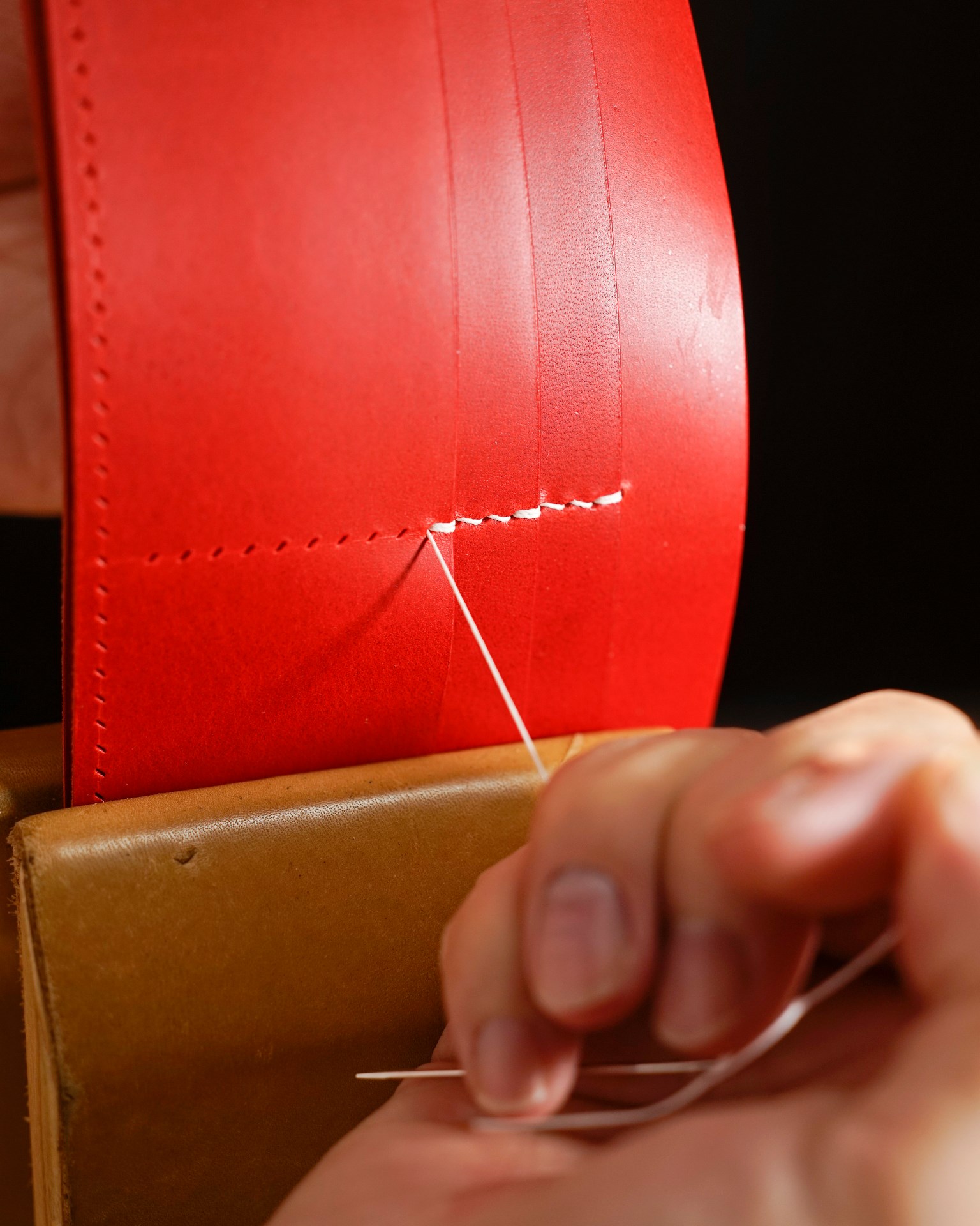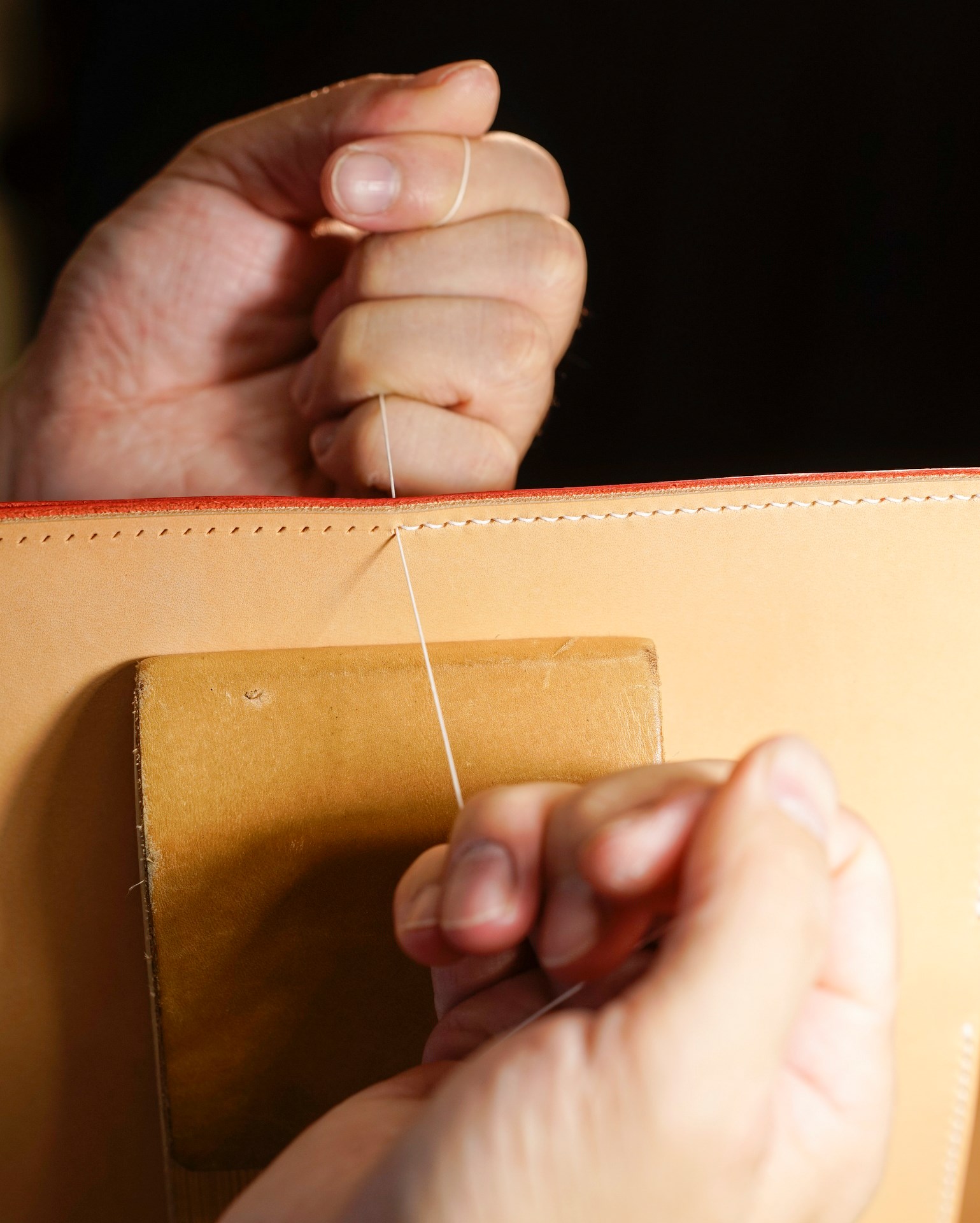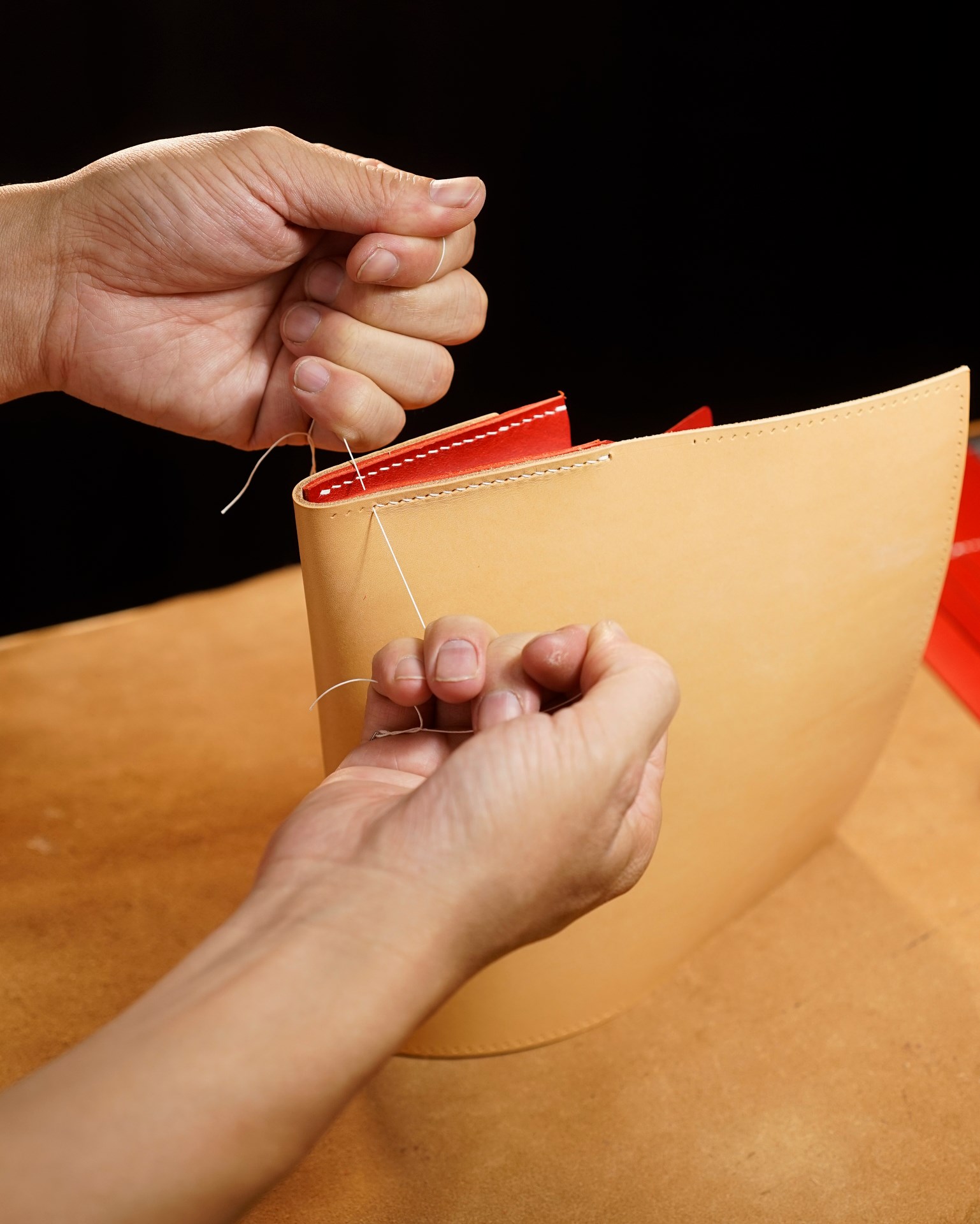 We are producing a long wallet type02 in natural and red custom colors. The stitching is 07 white in Rikka linen thread. The edges of the leather have been polished and each part has been finished.