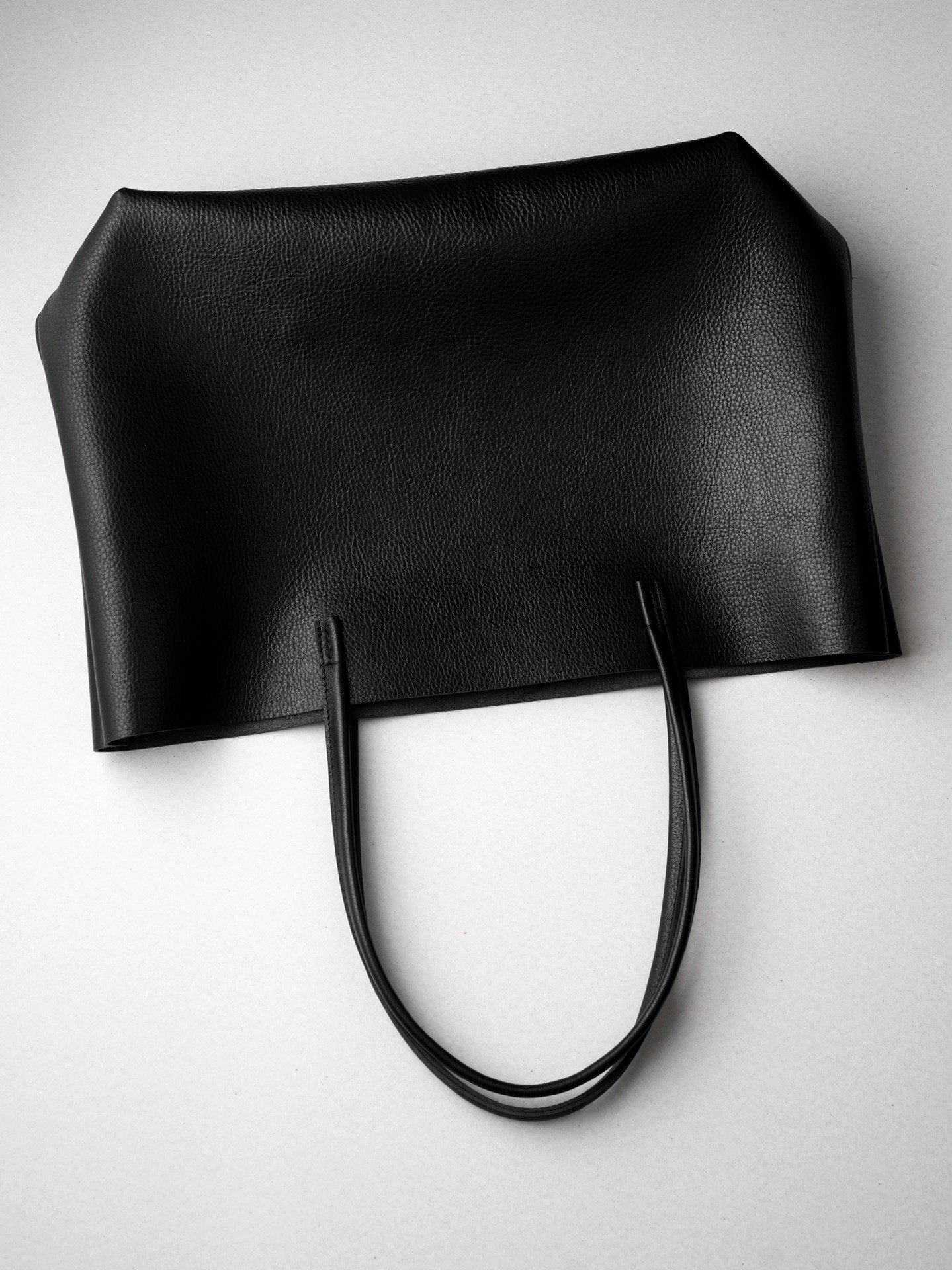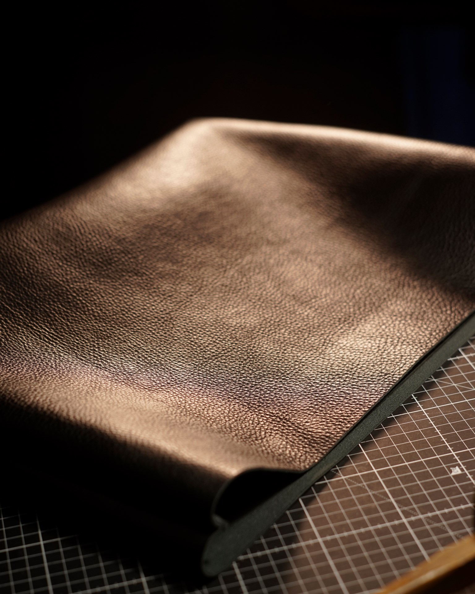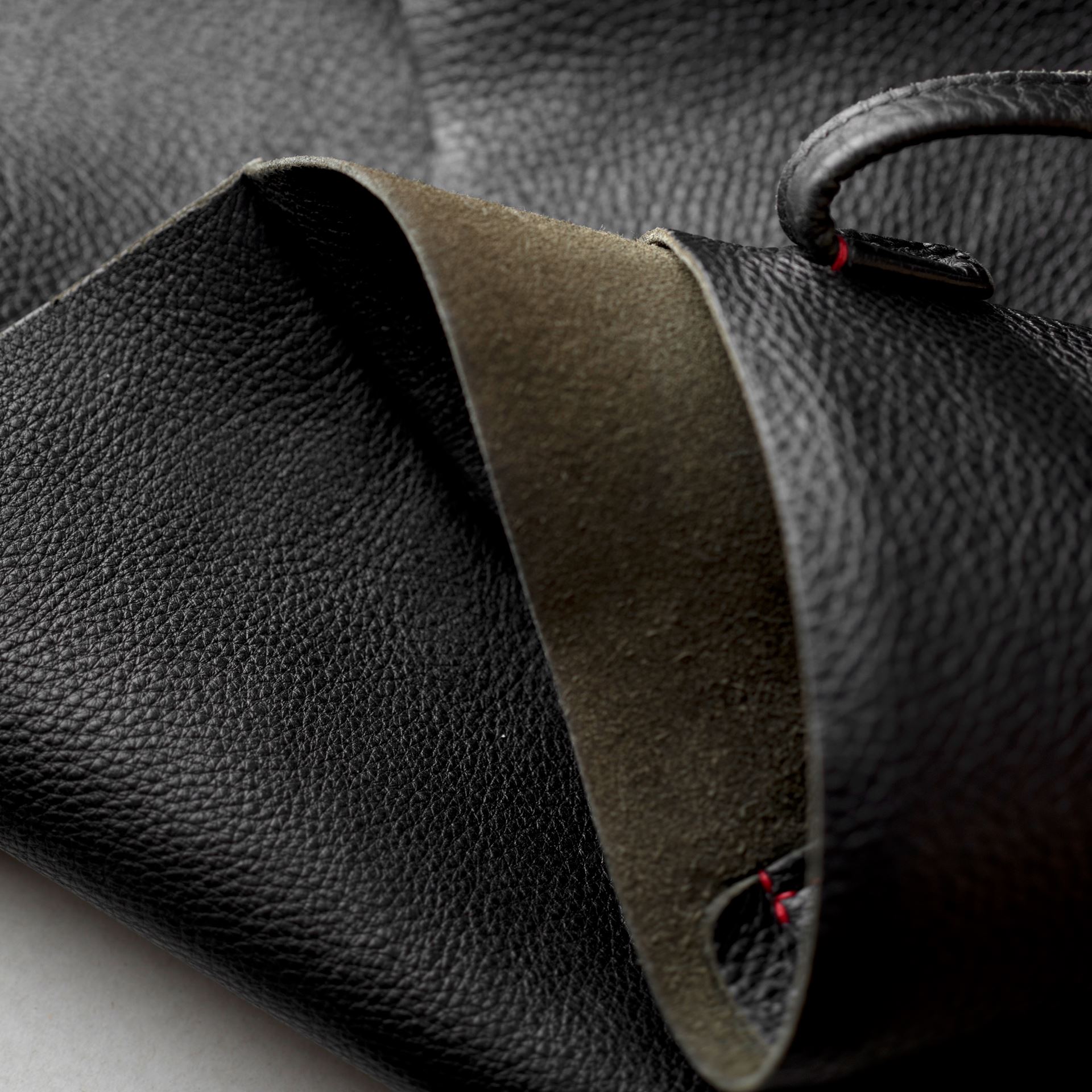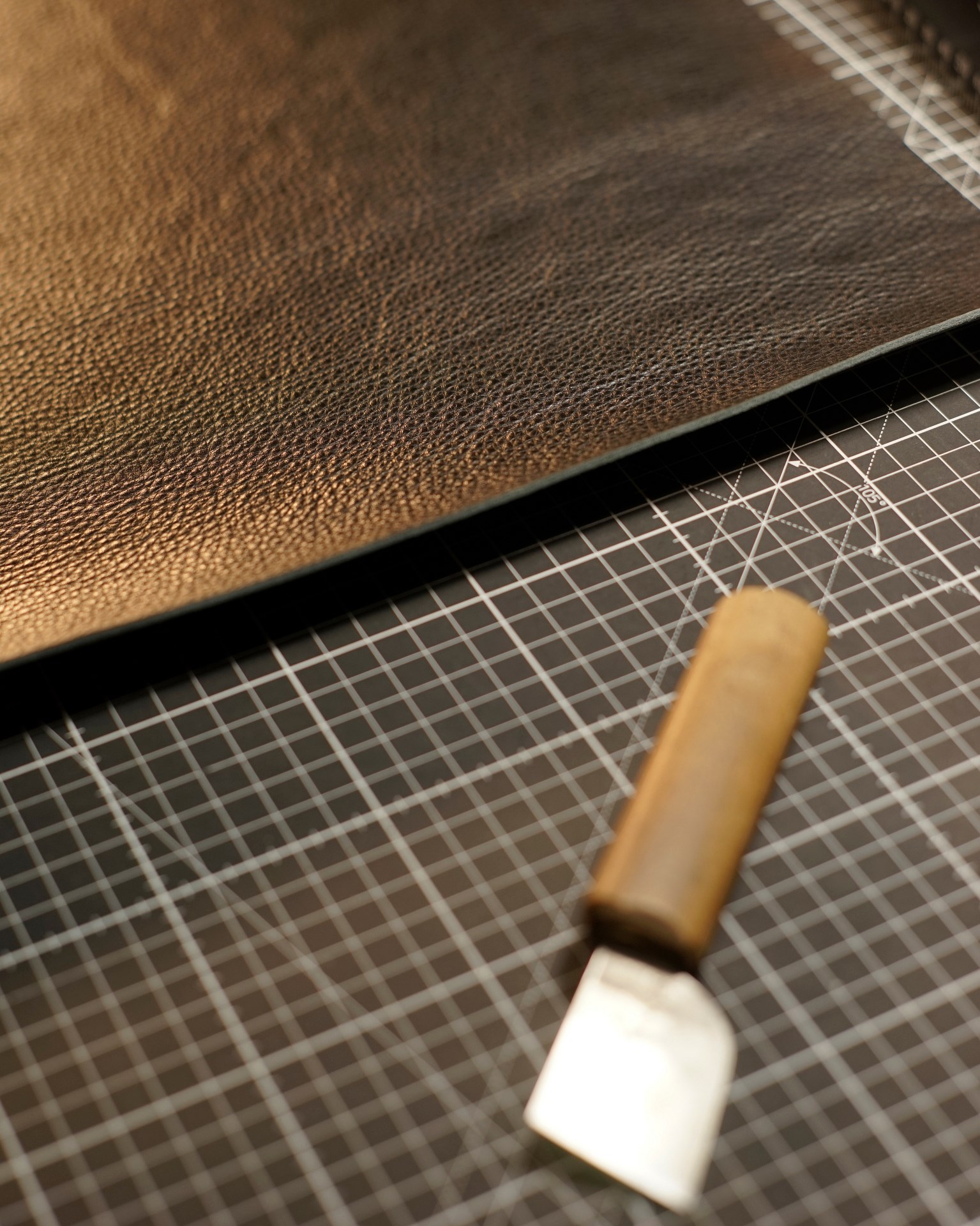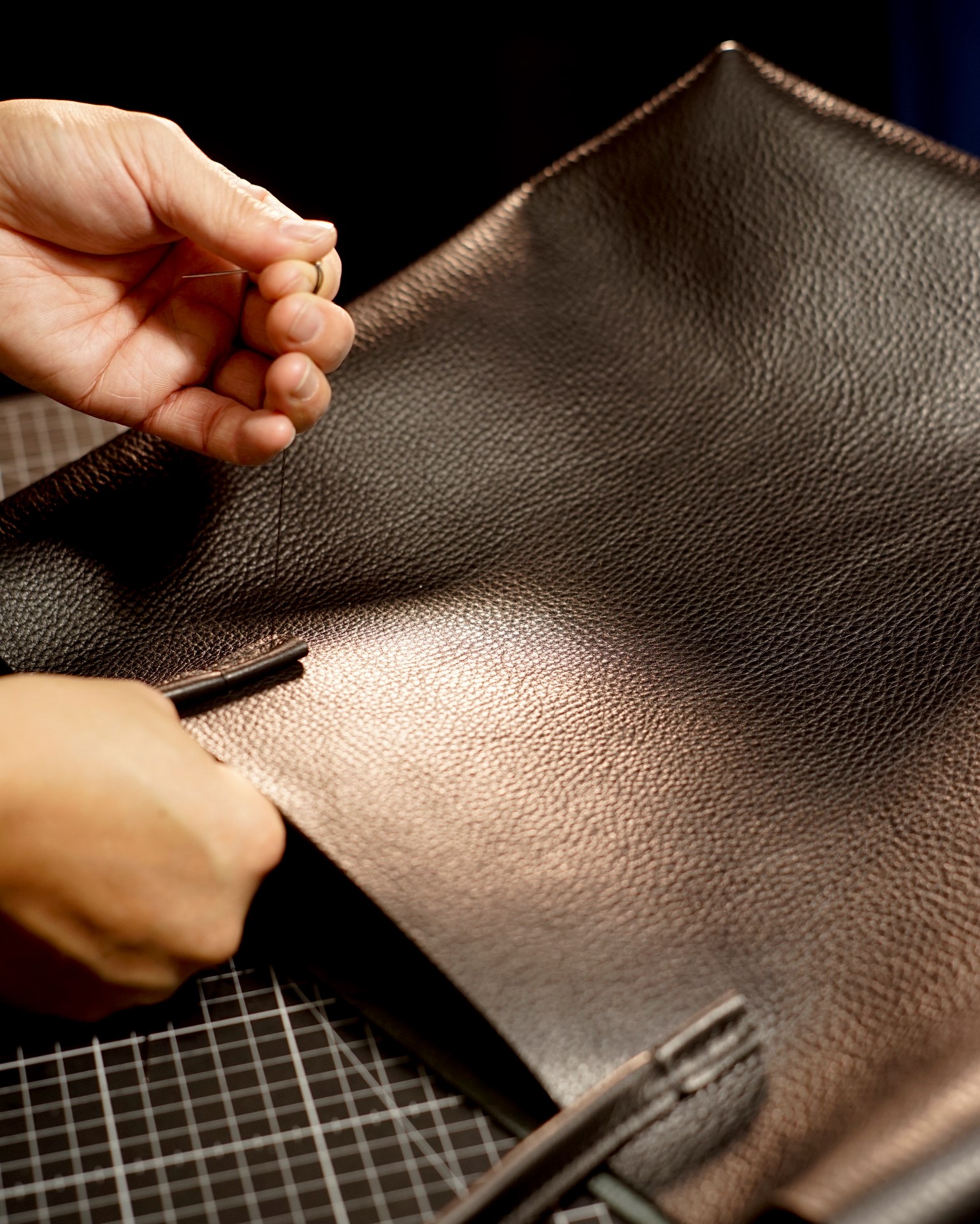 黒いシボ革をカットして持手やカバン本体、内ポケットなどのパーツを作っていきます。カバン本体は持ち手の付け根とマチの底と縁の部分のみ手縫いで、後は古いジャノメの職業用ミシンで縫い上げています。底の部分は二重縫いです。マチの底部分は六花リネン糸で手縫いしています。すべてを縫い上げたら革を裏返しますとカバン本体の出来上がります。