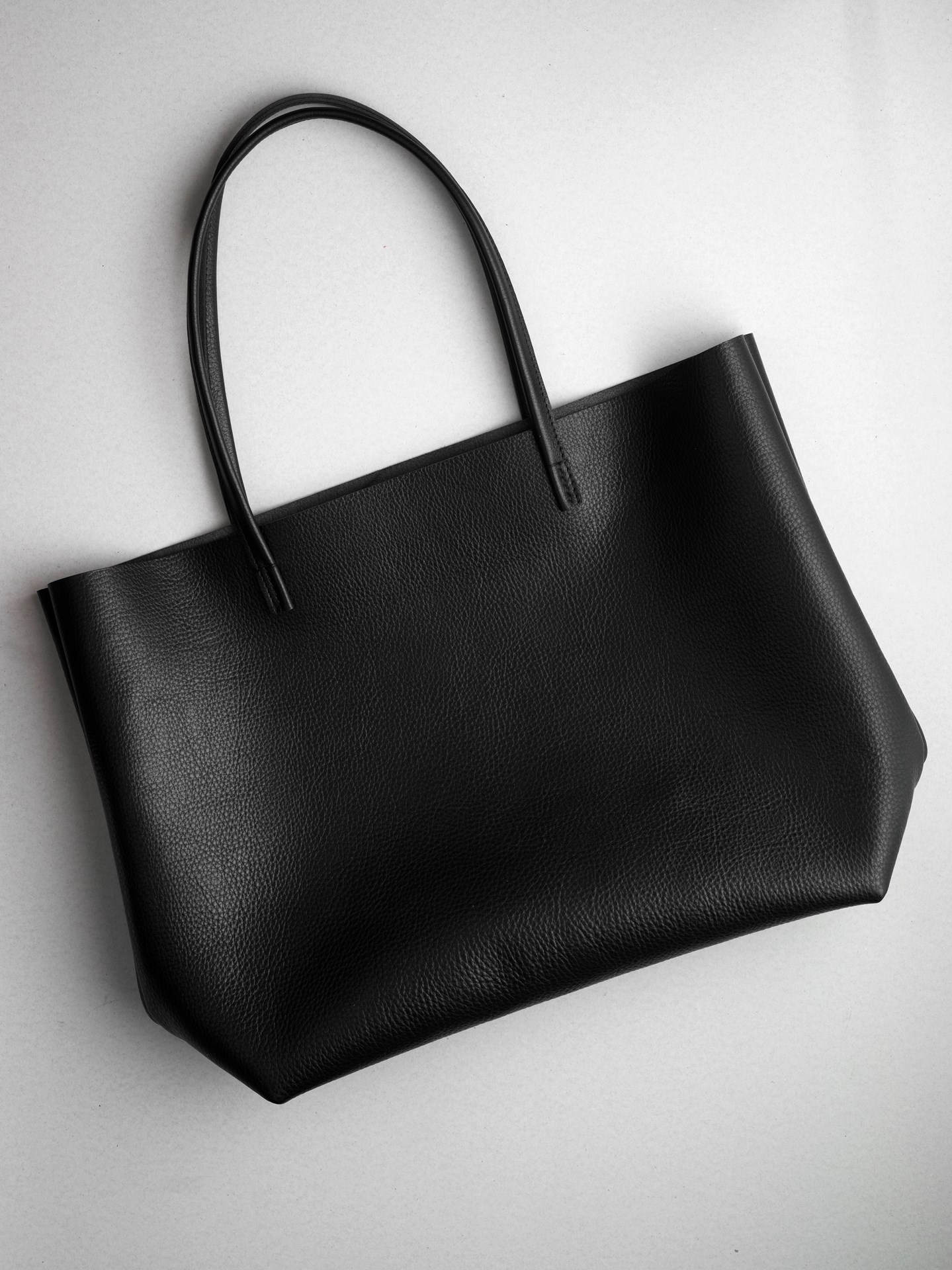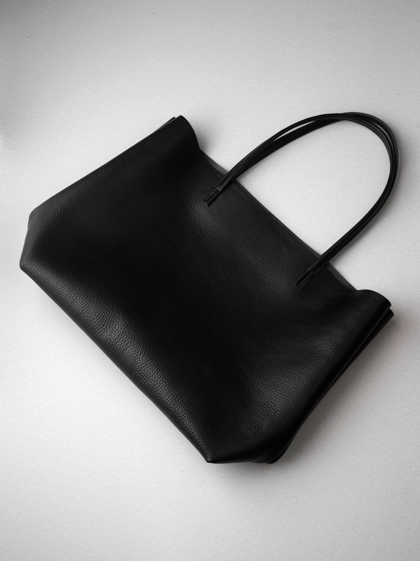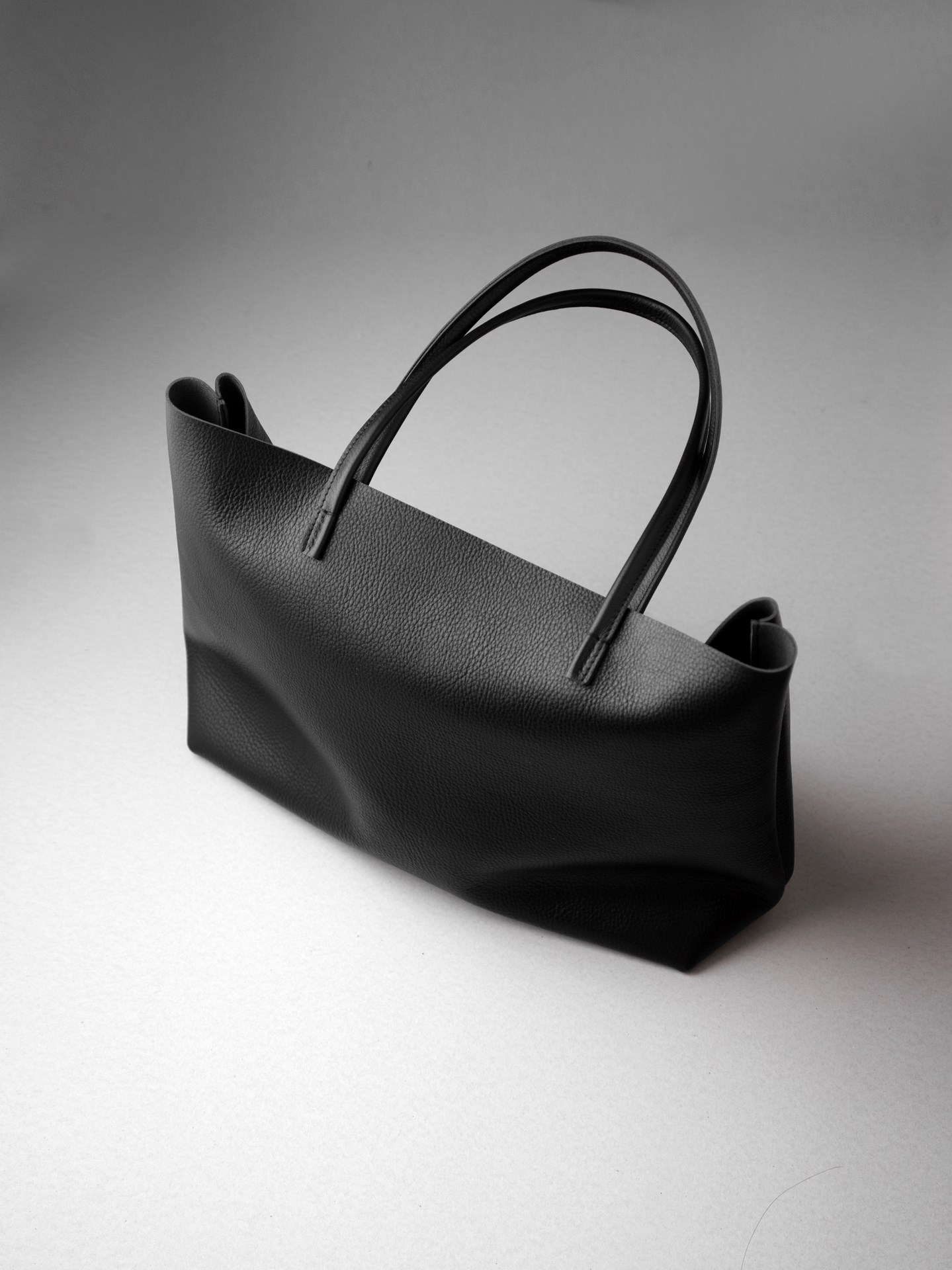 トートバッグ業務型SLは、タフな扱いにも耐えられるよう、水・汚れ・傷に強くて柔らかい、クローム鞣しのシボ革を使用したシンプルなトートバッグです。沢山の道具を放り込めるようマチも大きく、B4ファイルが横にすっぽり入る大きさになっています。