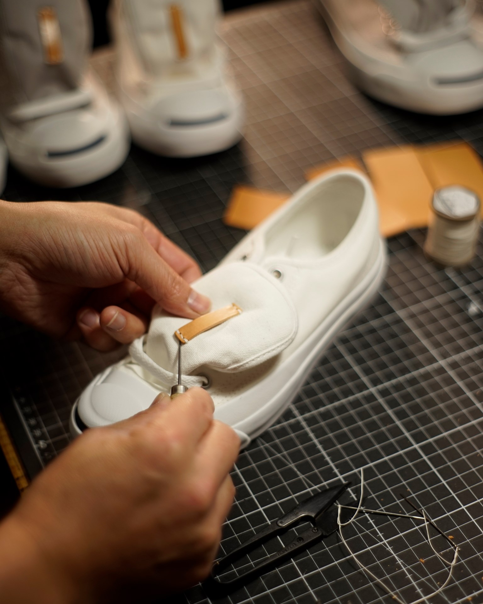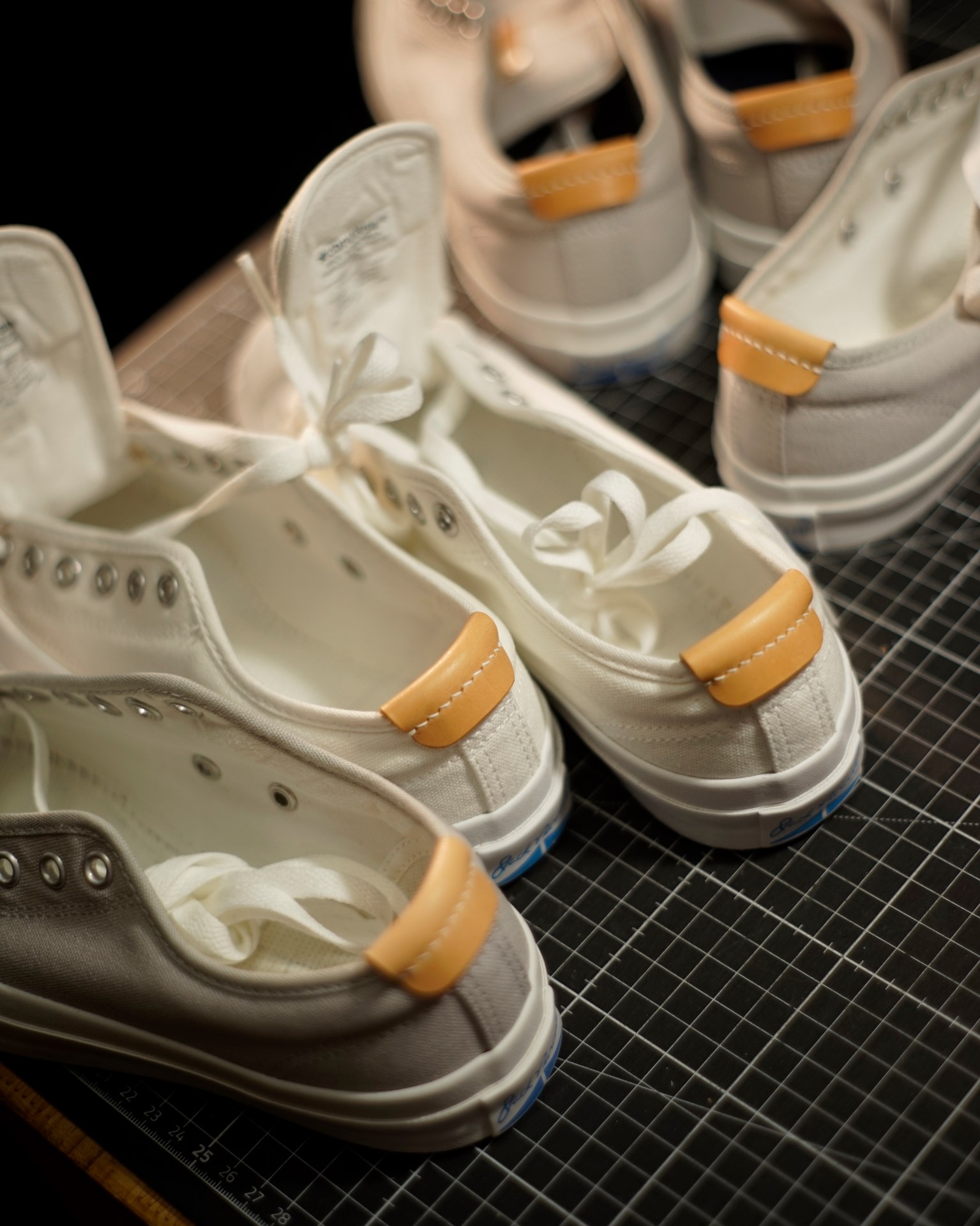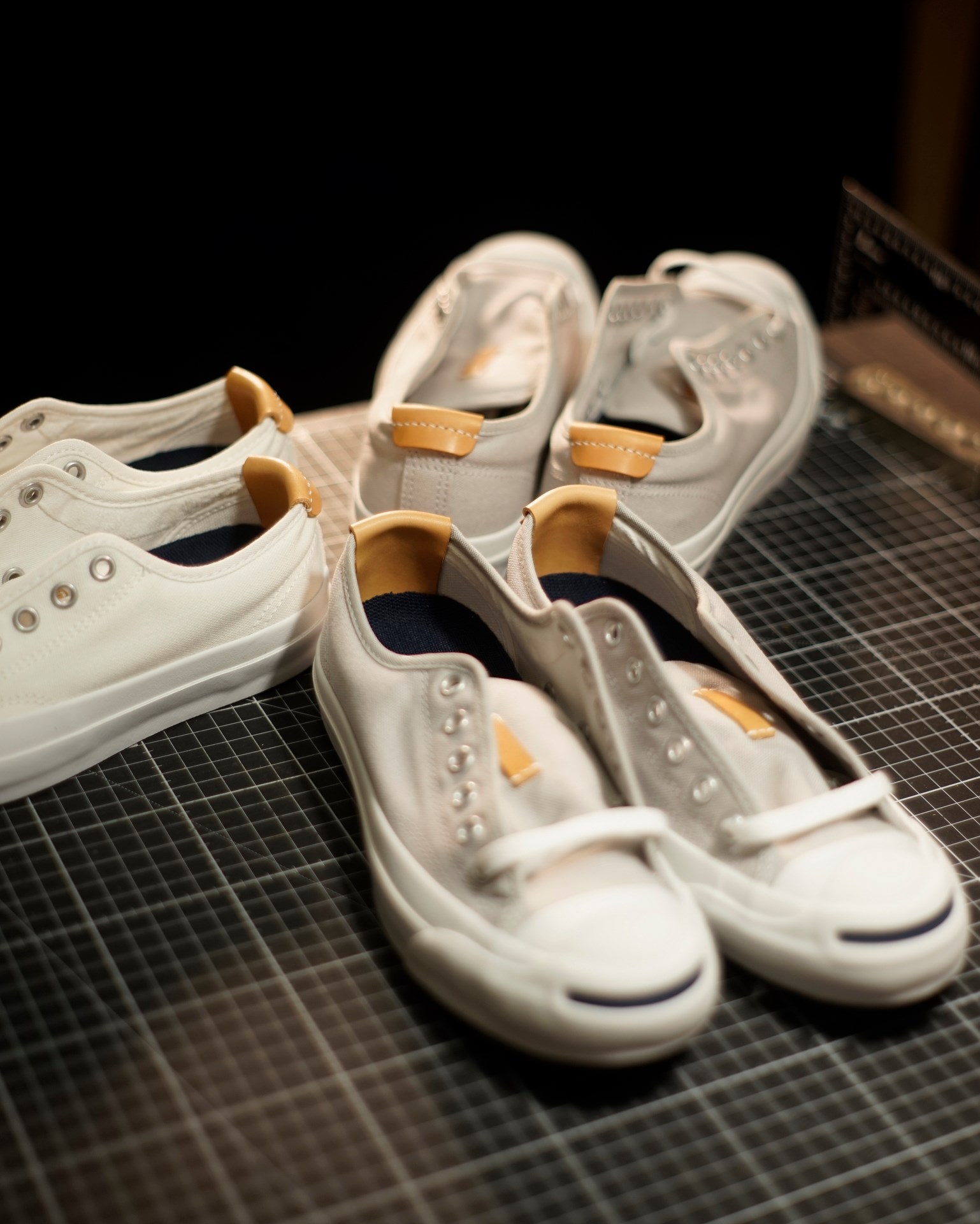 Aohige-kai is a special version of the standard canvas sneaker “Aohige” with leather parts for ease of use and reinforcement to compensate for the weak points of the standard “Aohige” (1) tear in the heel part and (2) drop in the tongue part.
