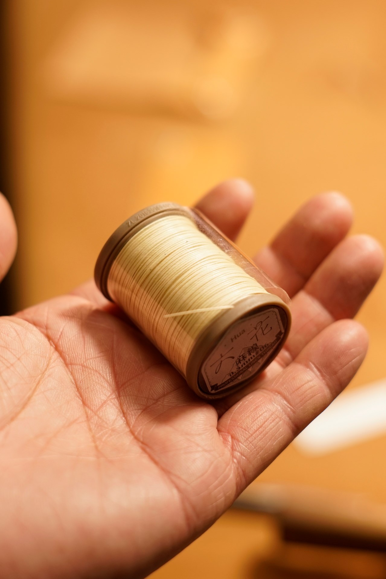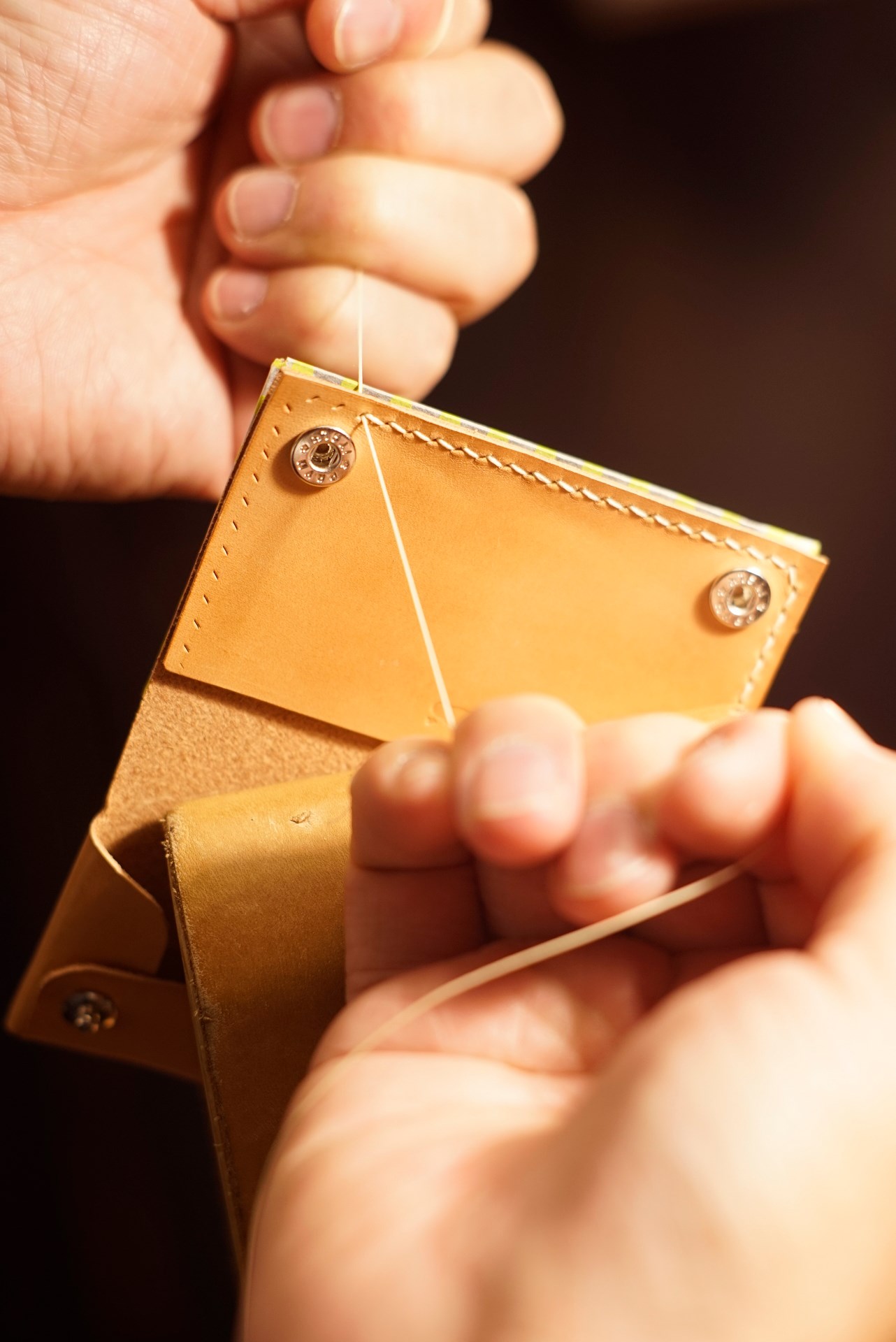 This time we are making a minimalist wallet using vintage leather. We have already finished cutting out the parts, eyeletting, and stamping. Rikka linen thread is used this time. The hook is the usual standard PRYM hook. It is a hook with a pleasant clicky feel.