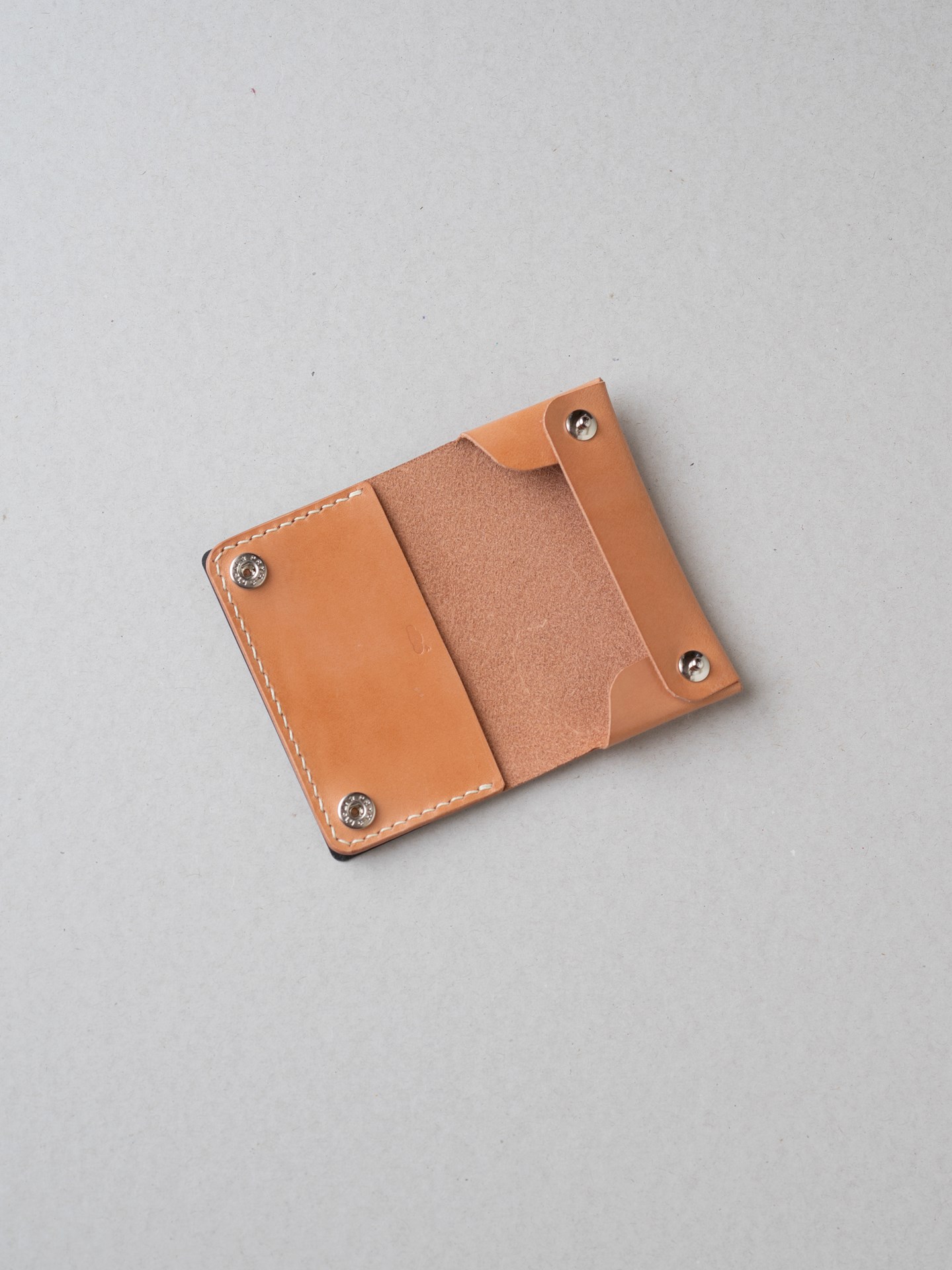 今回制作するのは生成りヴィンテージを使用したミニマリスト財布です。パーツ切出しと目打ち、打刻を終えております。今回使用するのは六花リネン糸の06白米です。ホックはいつもの定番プリムの挽物ホック。プレスホックではありませんのでカチッとした感触が気持ち良いホックです。