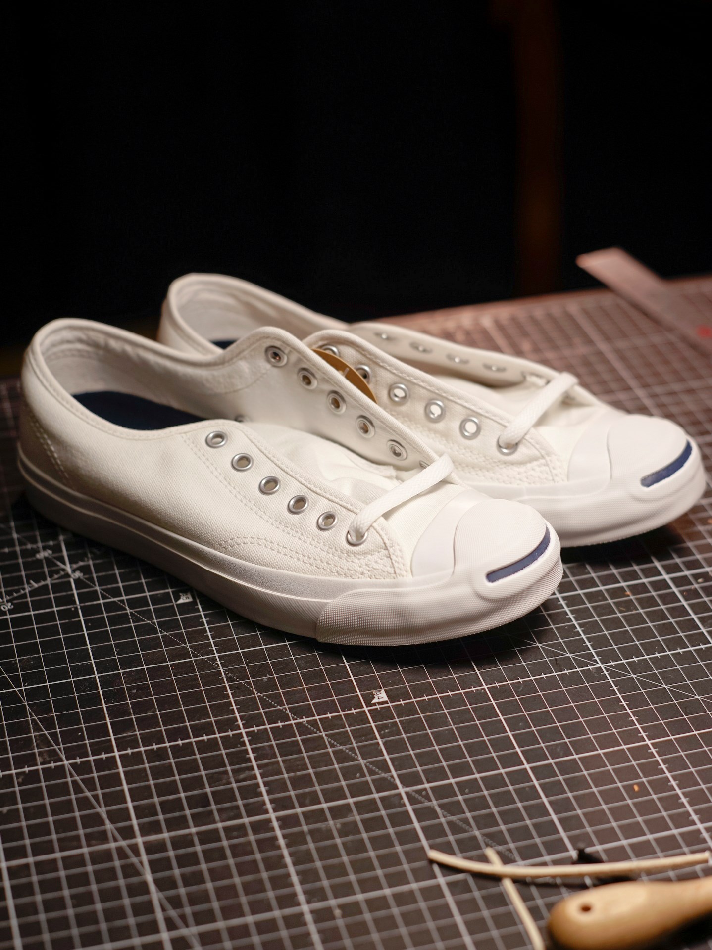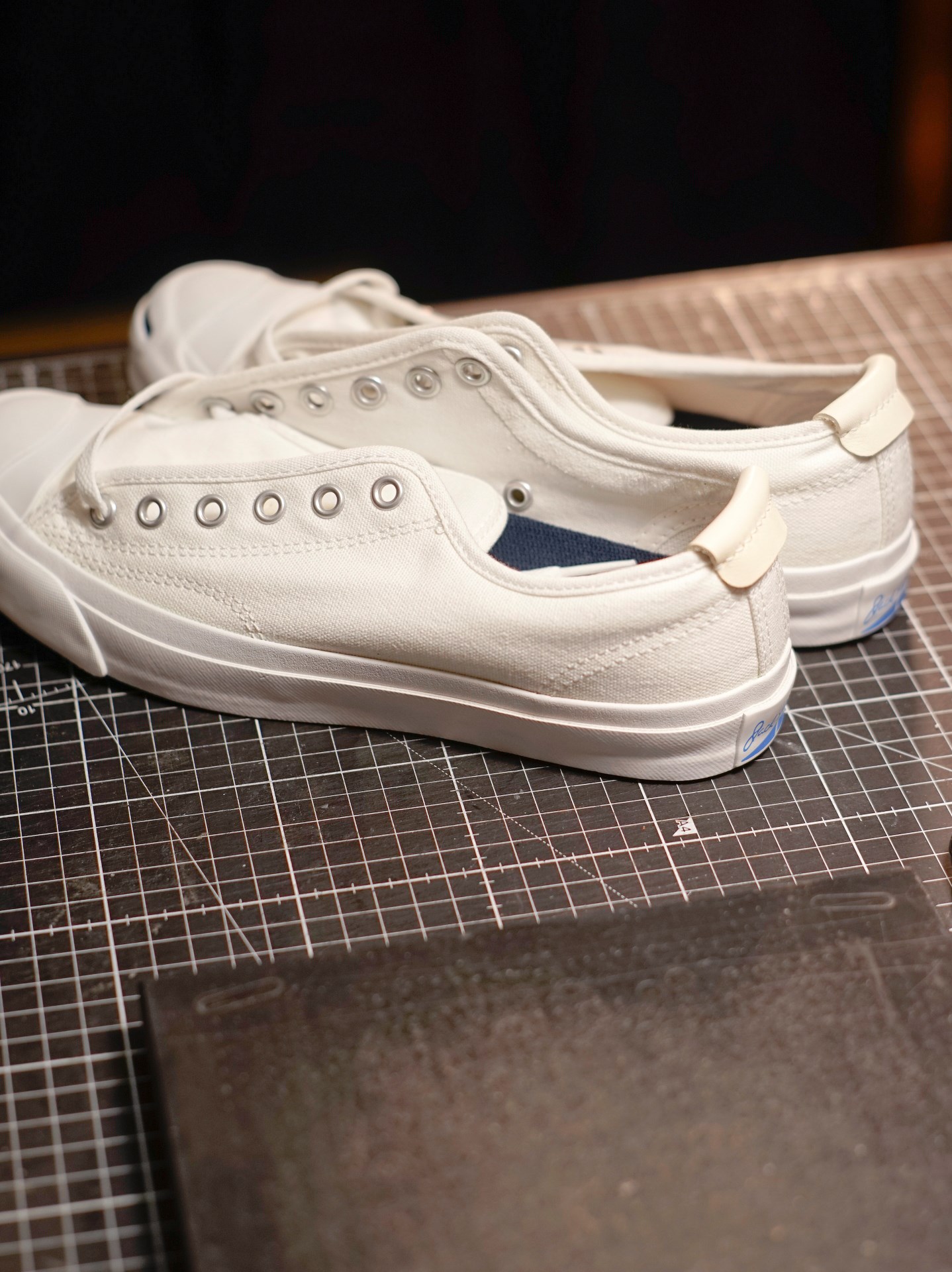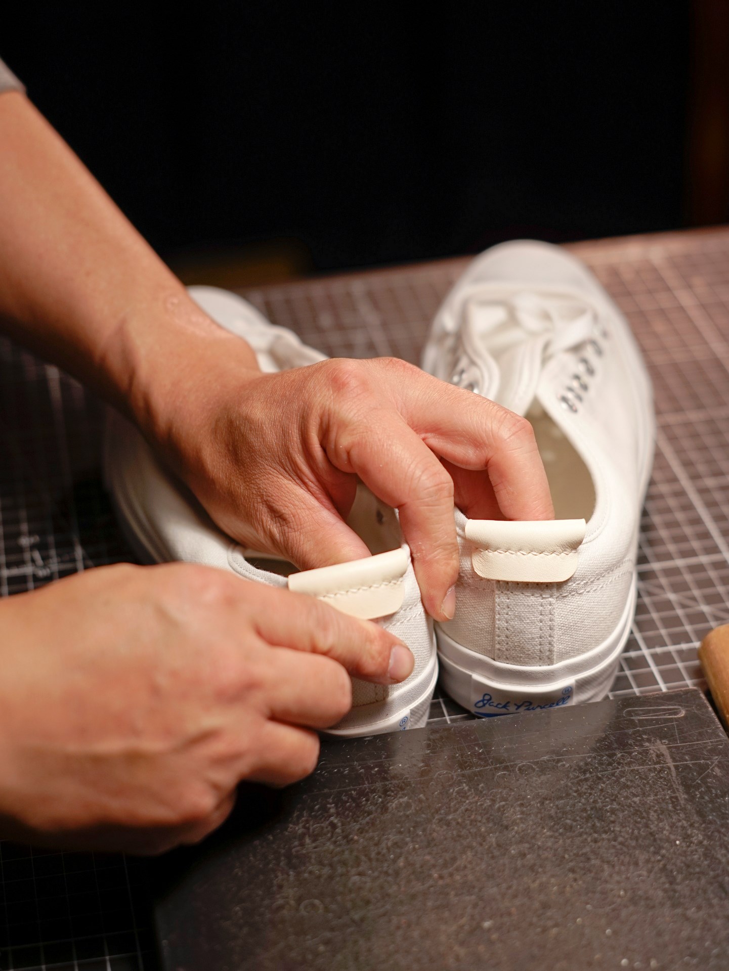 Aohige-kai is a special version of the standard canvas sneaker “Aohige” with leather parts for ease of use and reinforcement to compensate for the weak points of the standard “Aohige” (1) tear in the heel part and (2) drop in the tongue part.