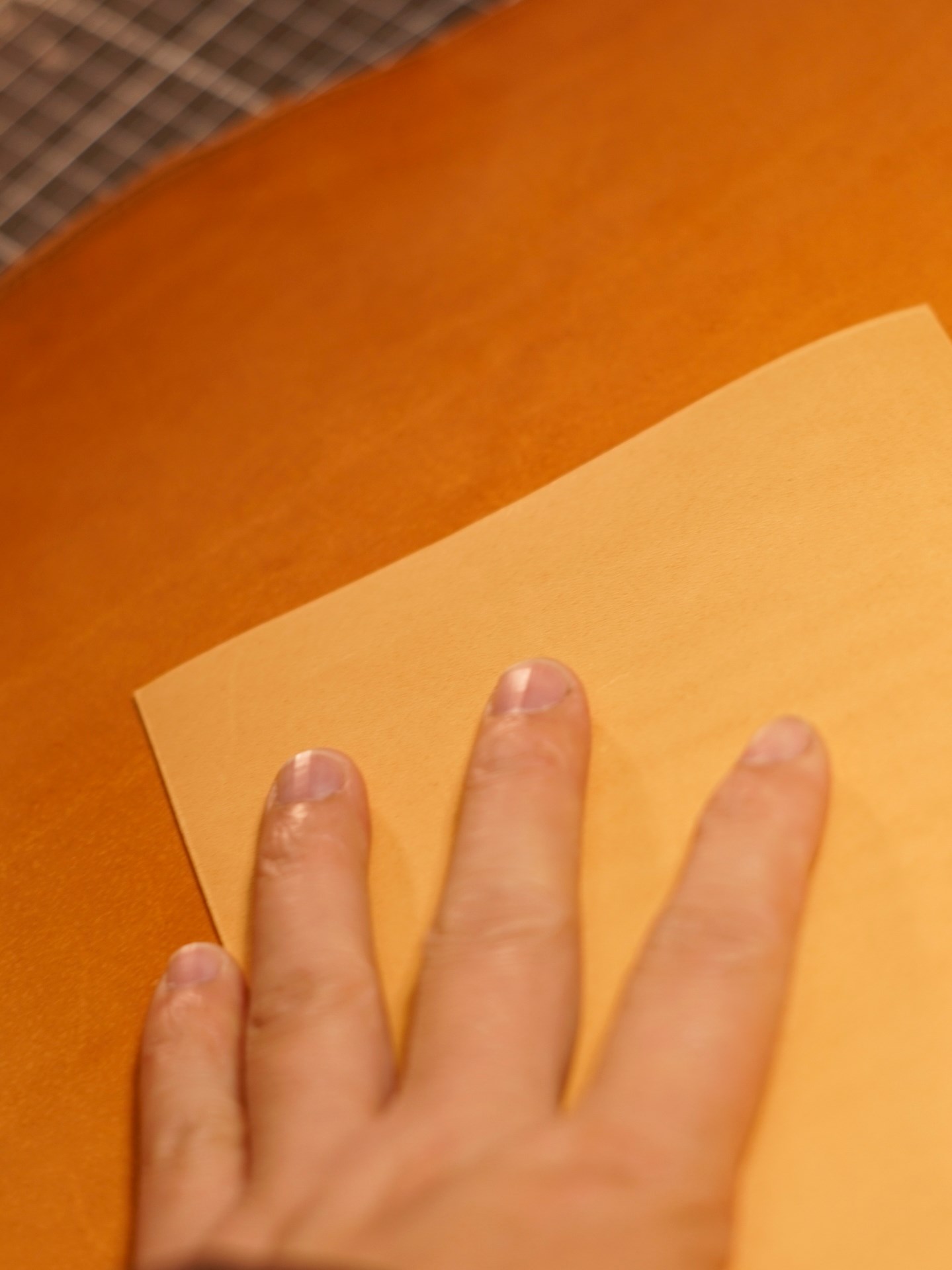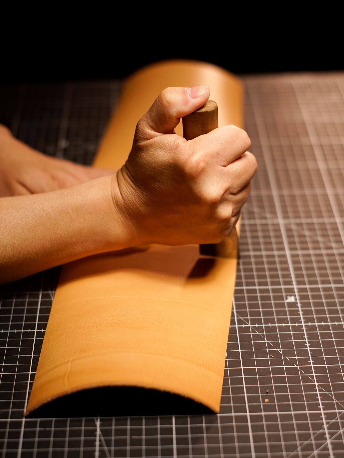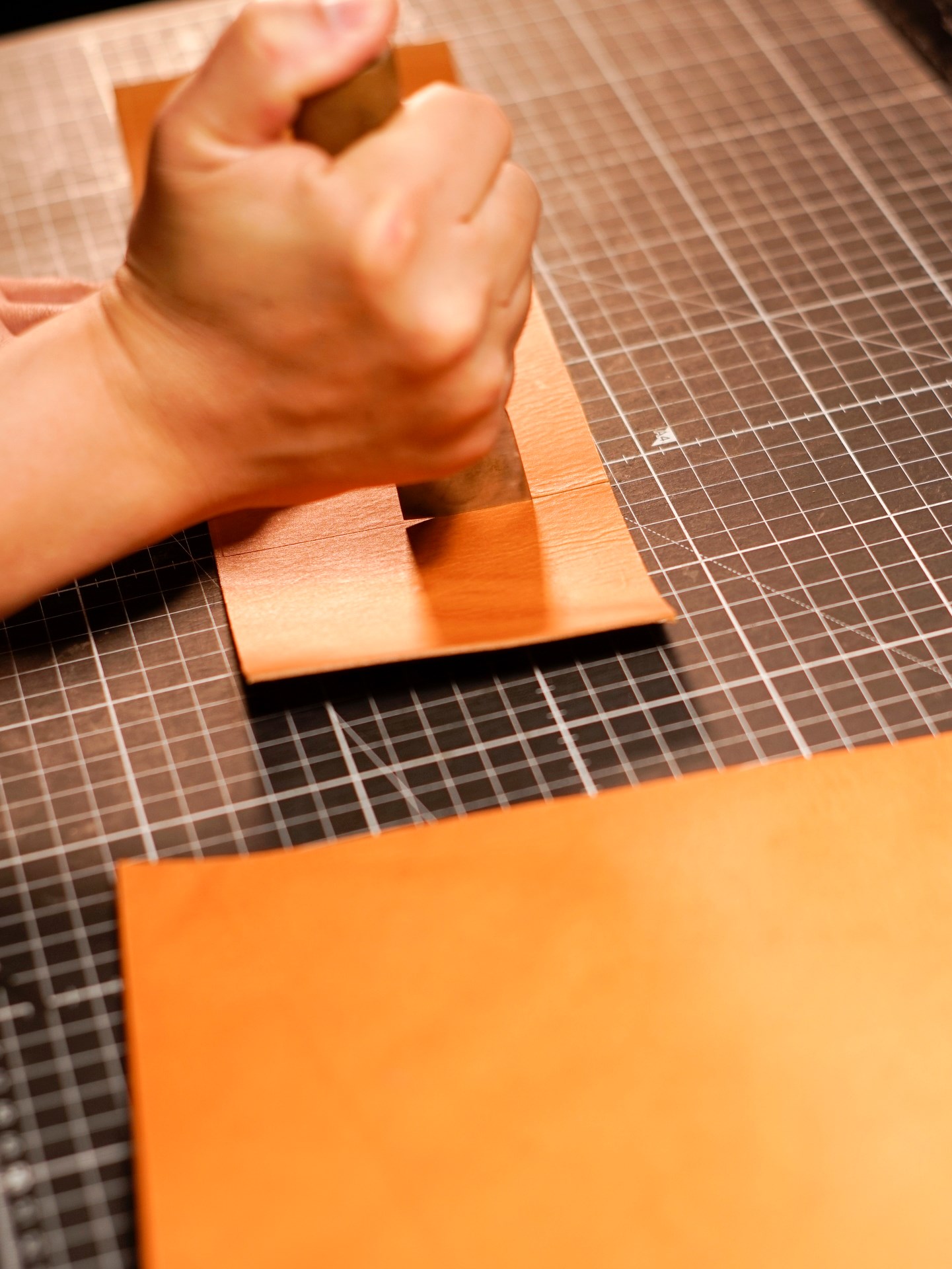 今回は生成りと生成りヴィンテージで制作します。革をカットして目打ちとロゴを刻印します。