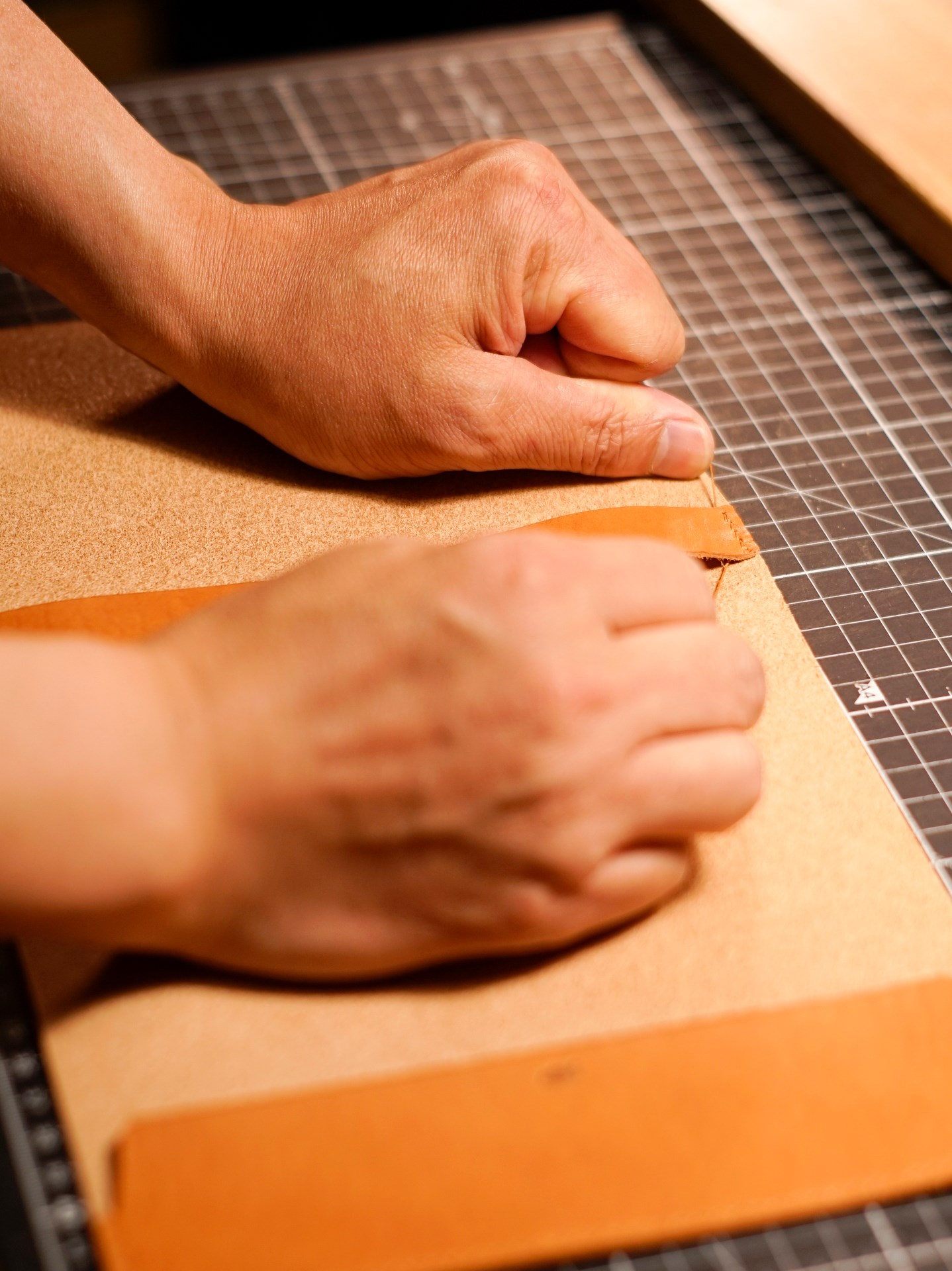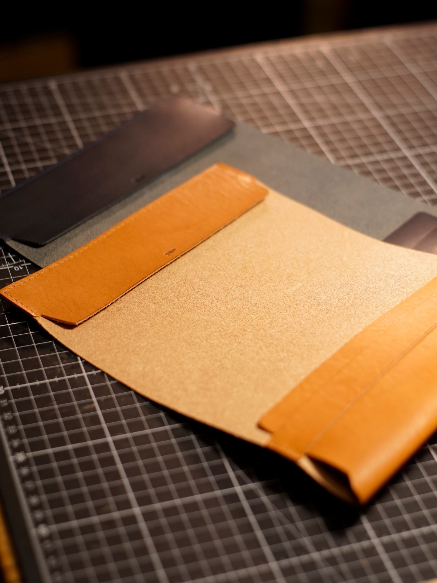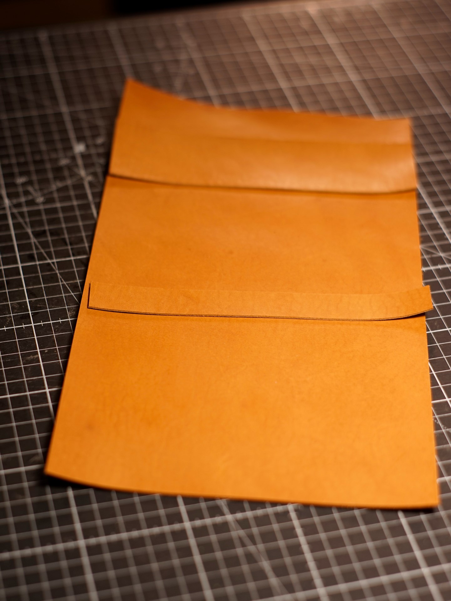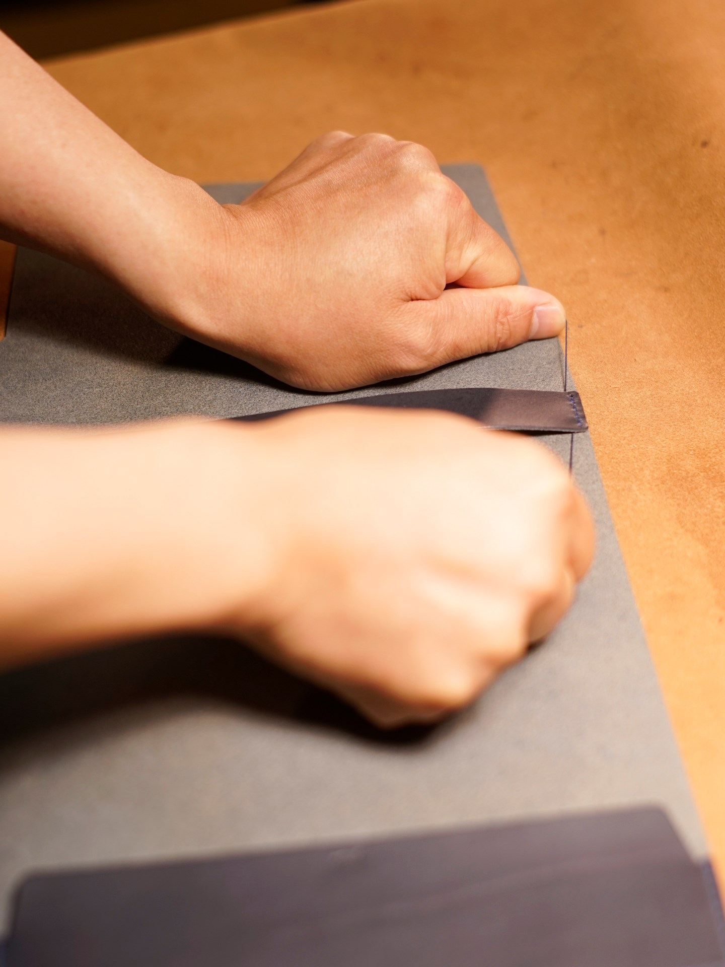 イタリアンソフトの生成りヴィンテージ、紺をカットして、くも舎刻印、目打ち、軽いコバ磨きを済ませます。