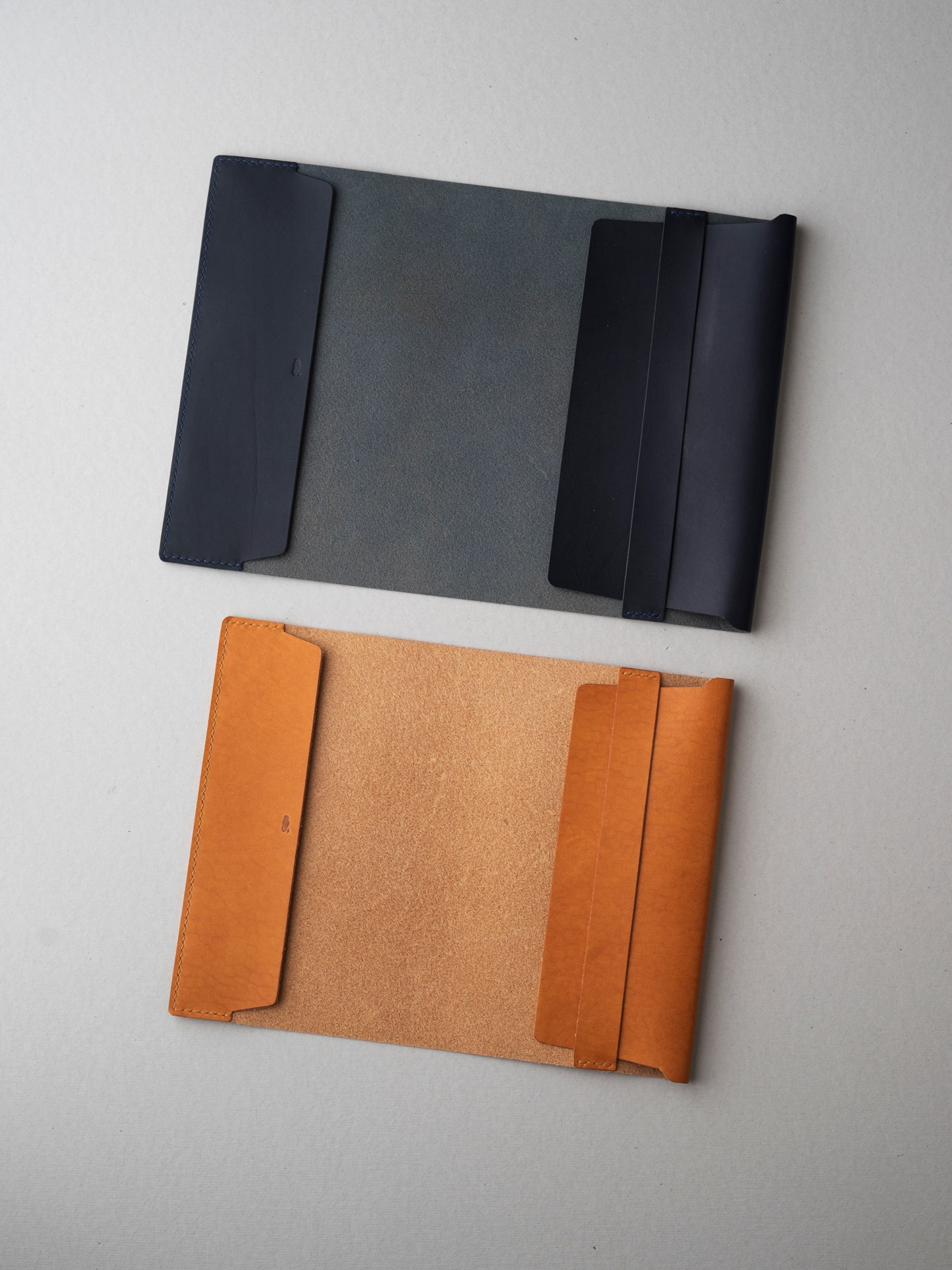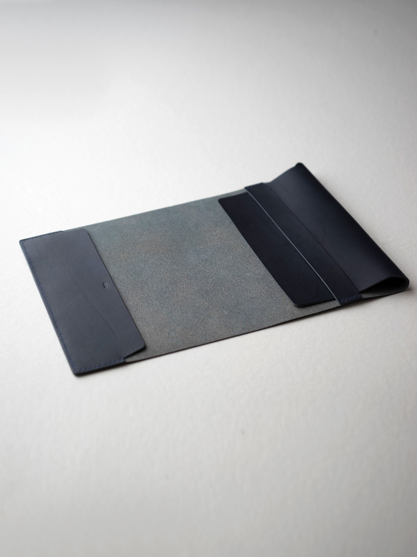 Cut Italian soft natural vintage and navy blue colors, Kumosha engraving, graining, and light edge polishing.
