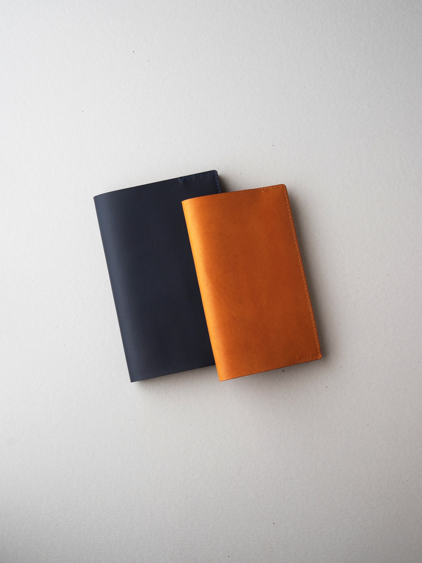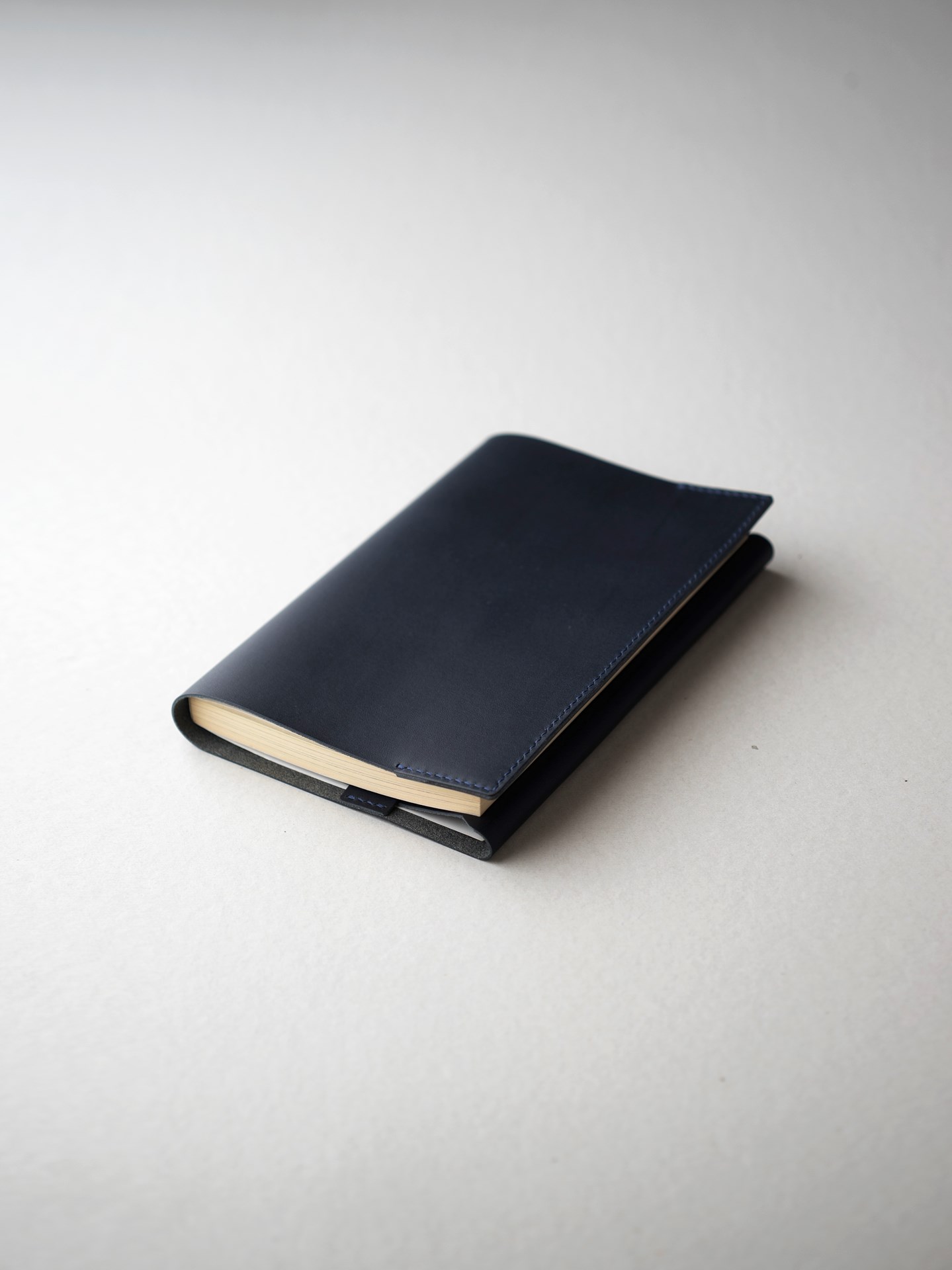 植物タンニン鞣し革に麻糸で手縫いを施したシンプルなつくりです。差込部にステッチを入れることで、ブックカバー1型をよりスマートに、本を読みやすく進化させました。