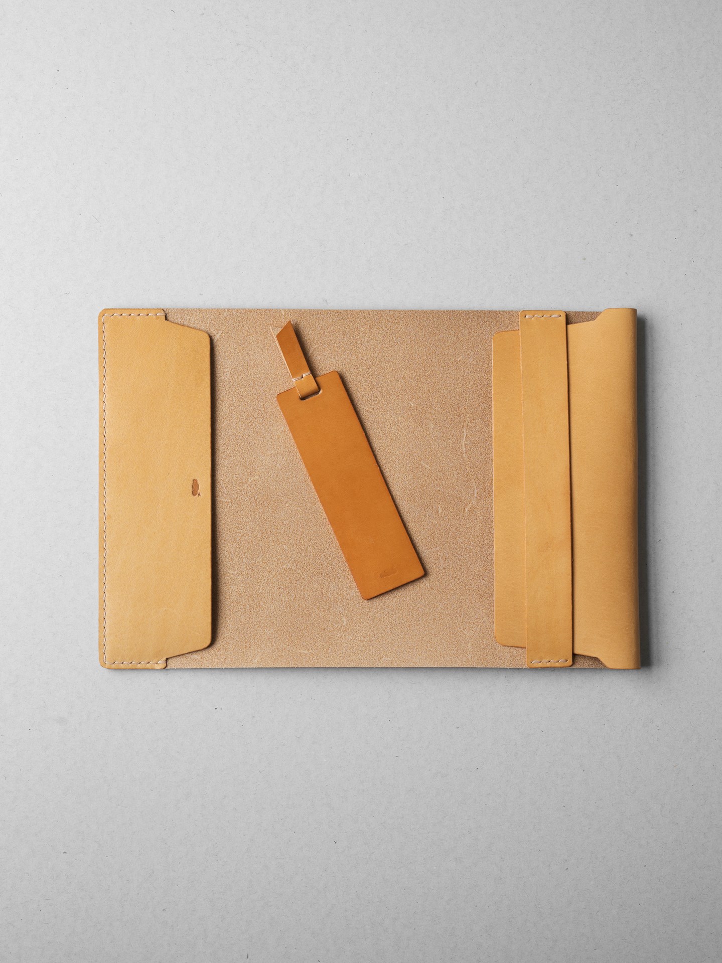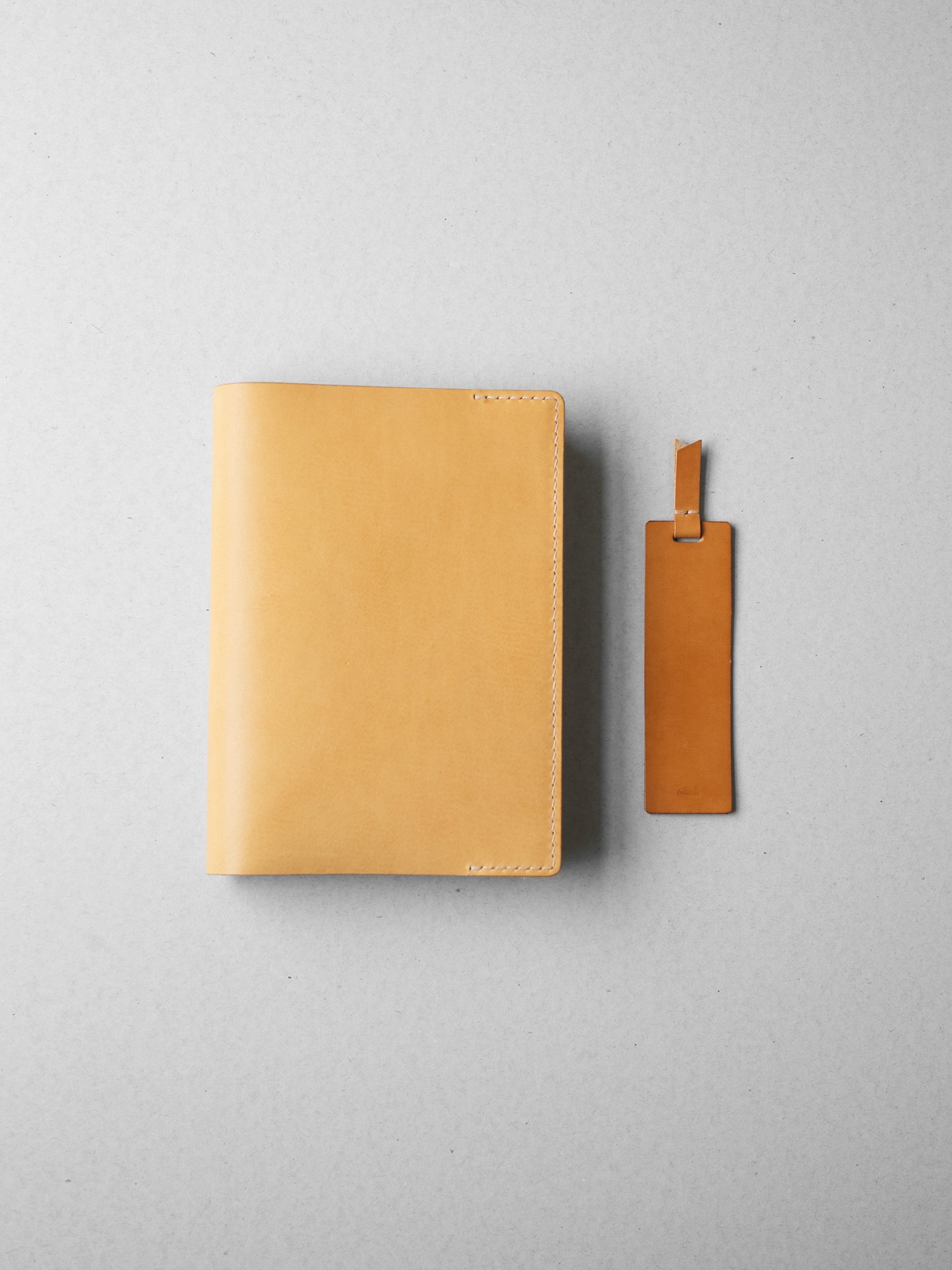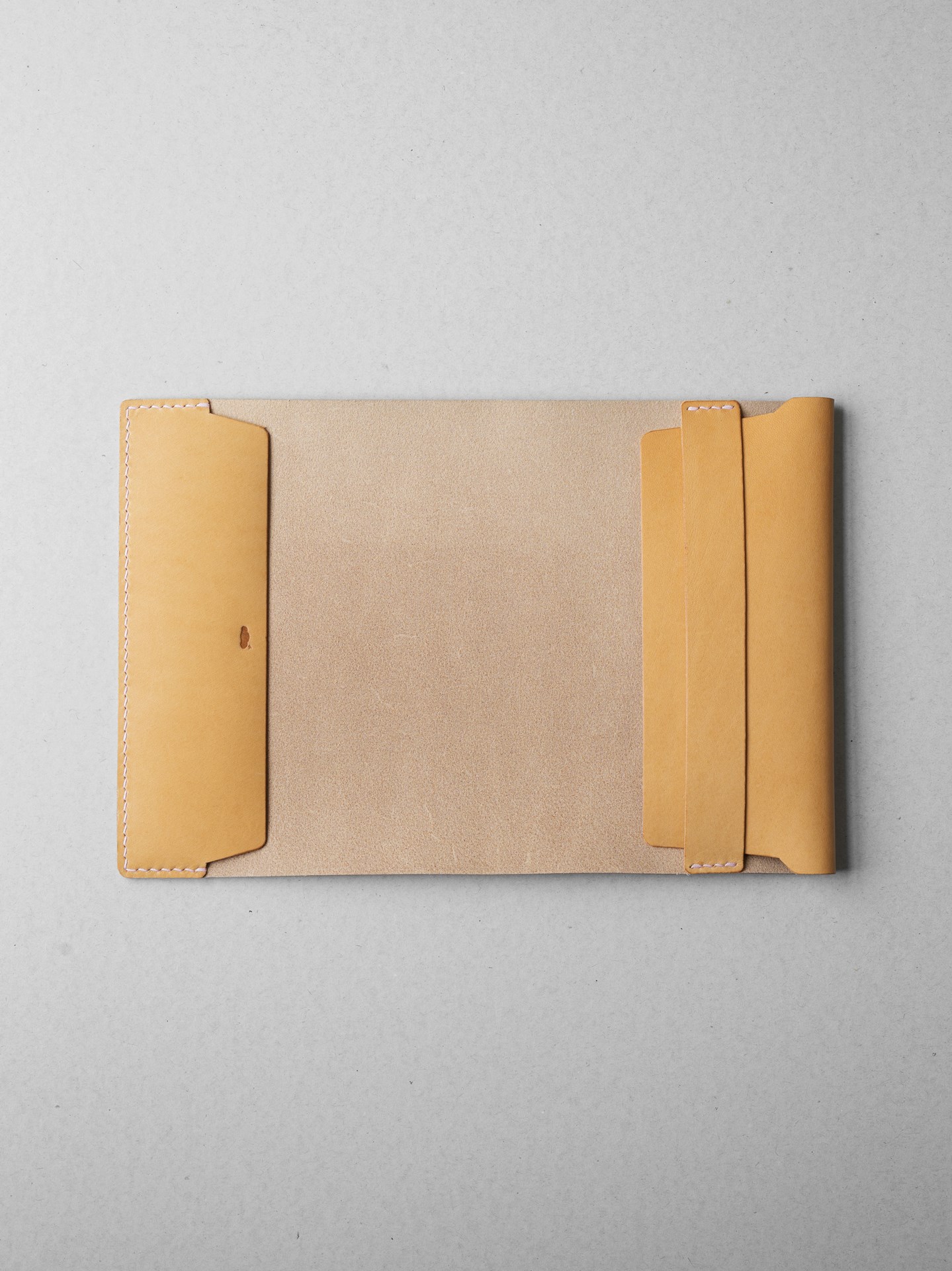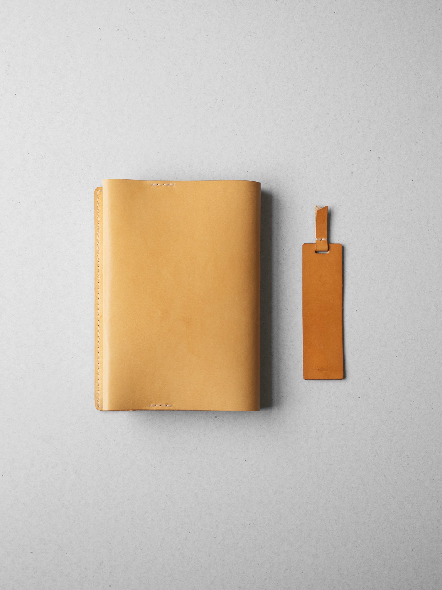 植物タンニン鞣し革に麻糸で手縫いを施したシンプルなつくりです。差込部にステッチを入れることで、ブックカバー1型をよりスマートに、本を読みやすく進化させました。