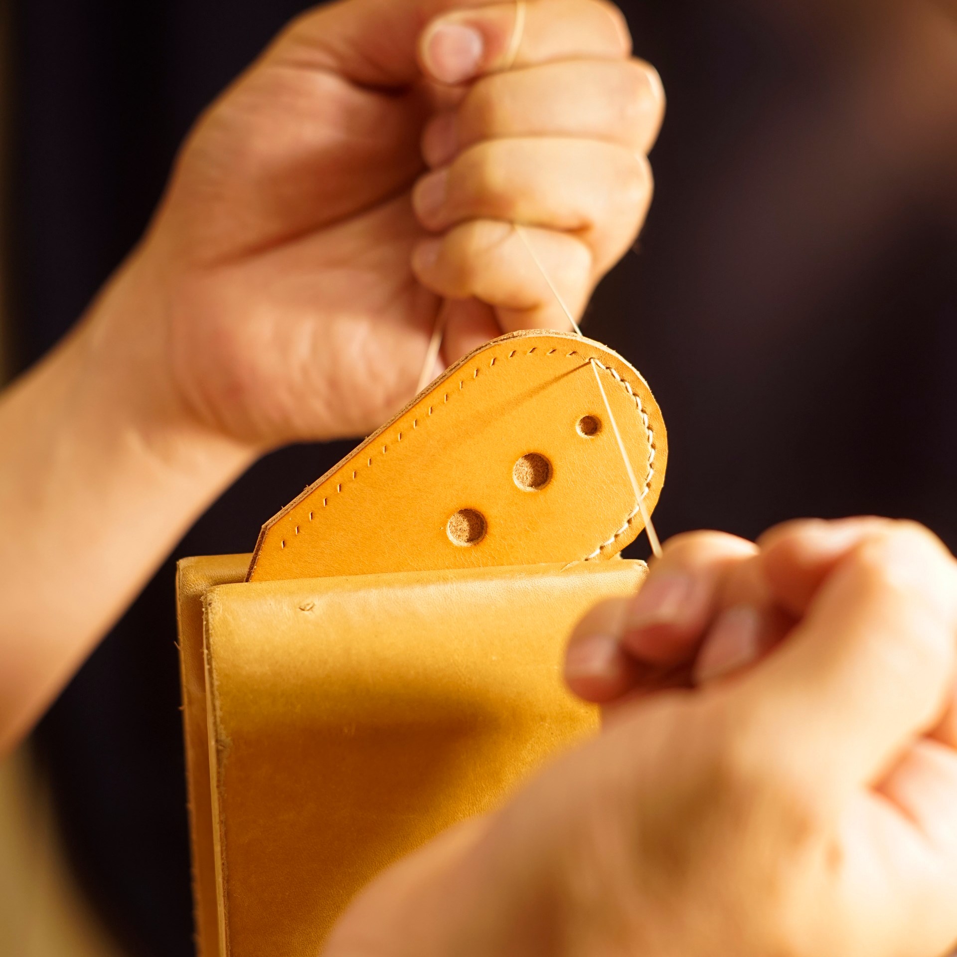 カットして穴あけ等を済ませた生成りヴィンテージ革を六花リネン糸の06白米で手縫いします。