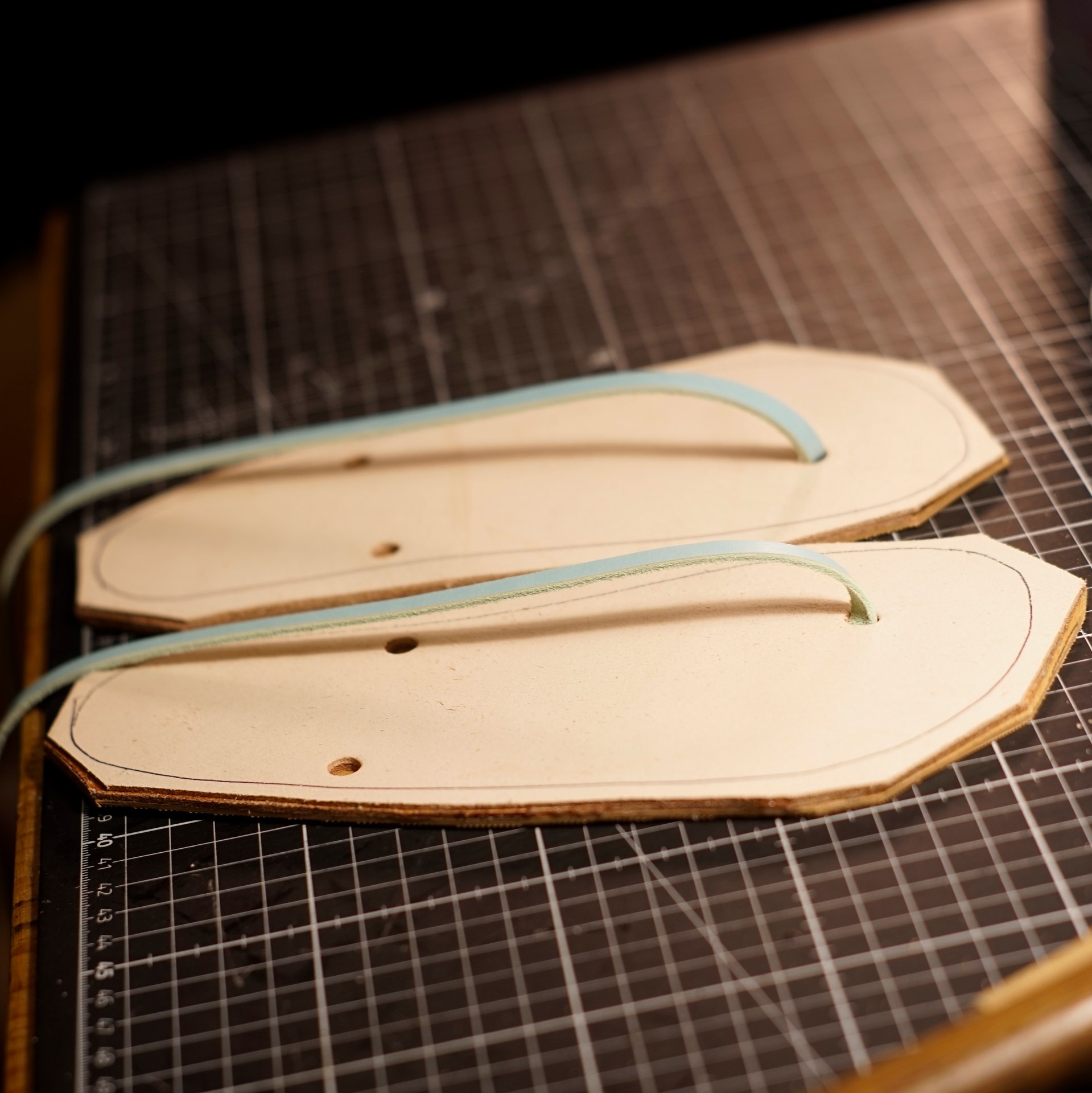 生成りベースでの制作になります。ビブラム底仕様となりますので、革とビブラムソールを切り出して、革ひもとソールの貼り合わせから穴あけを行います。