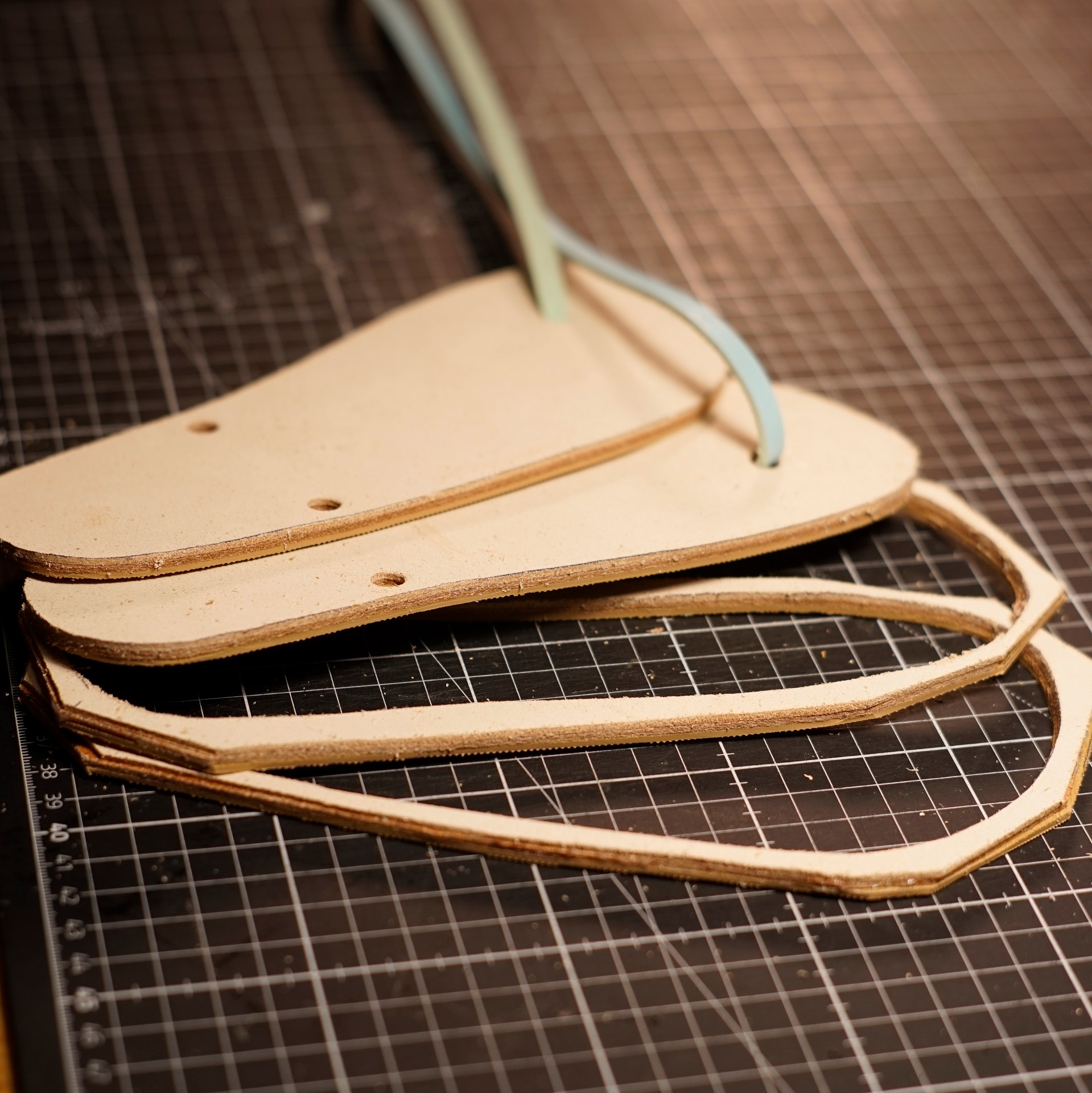 革とソールを手作業で切り抜きします。曲線と切口のエッジが綺麗に仕上がります。