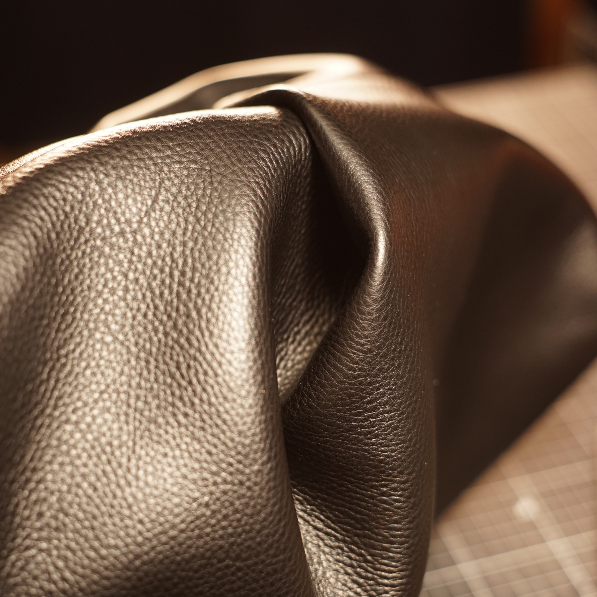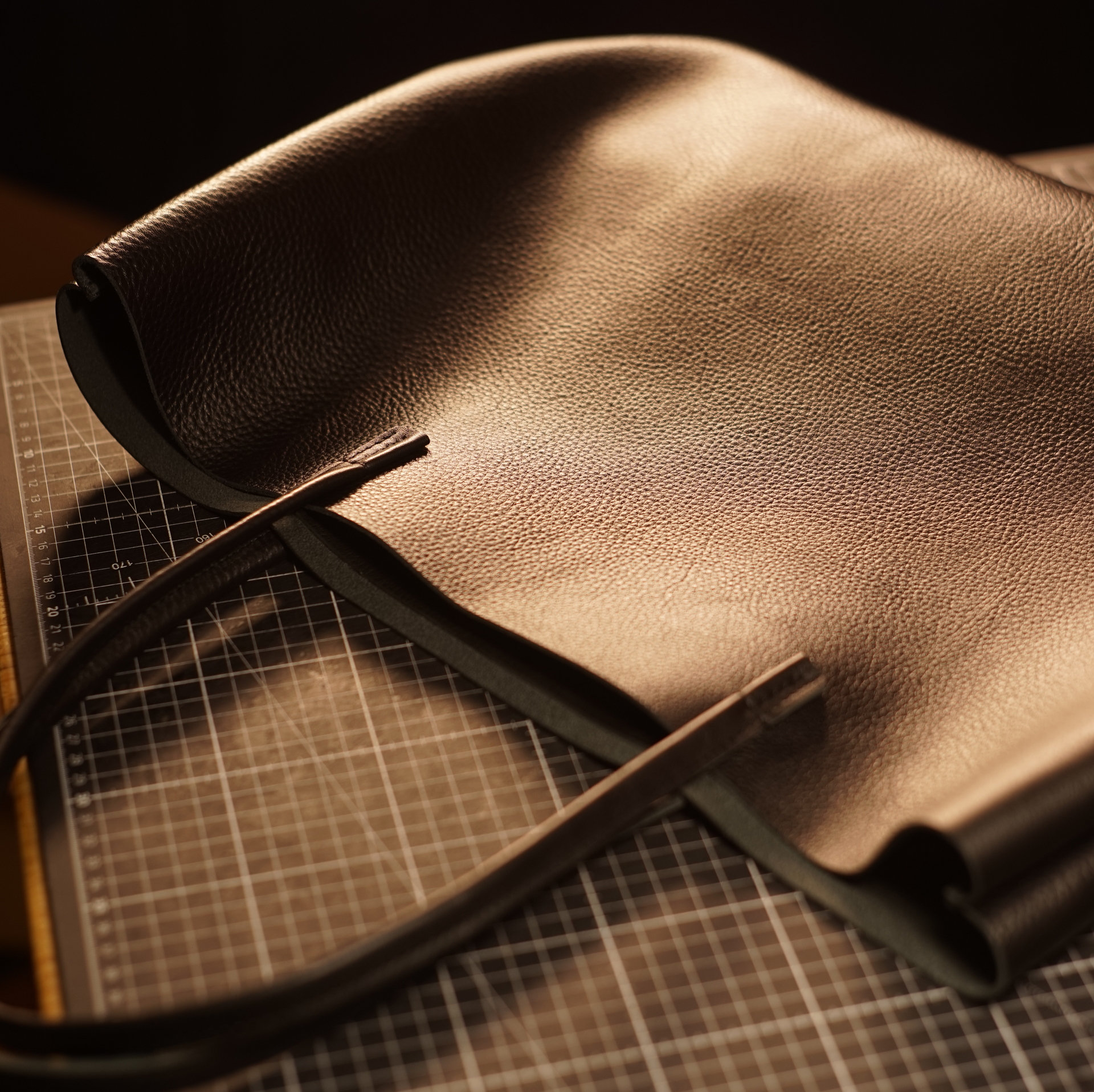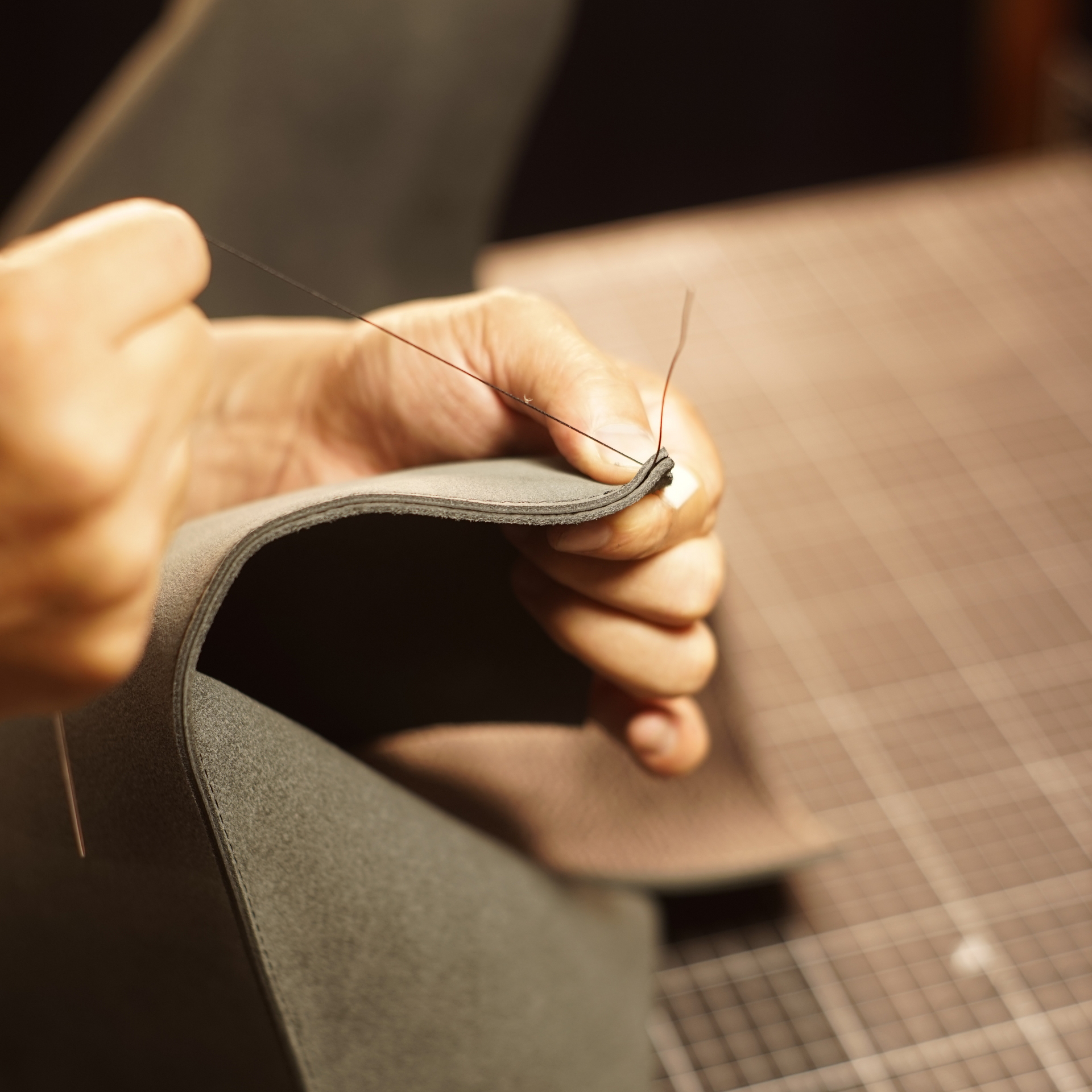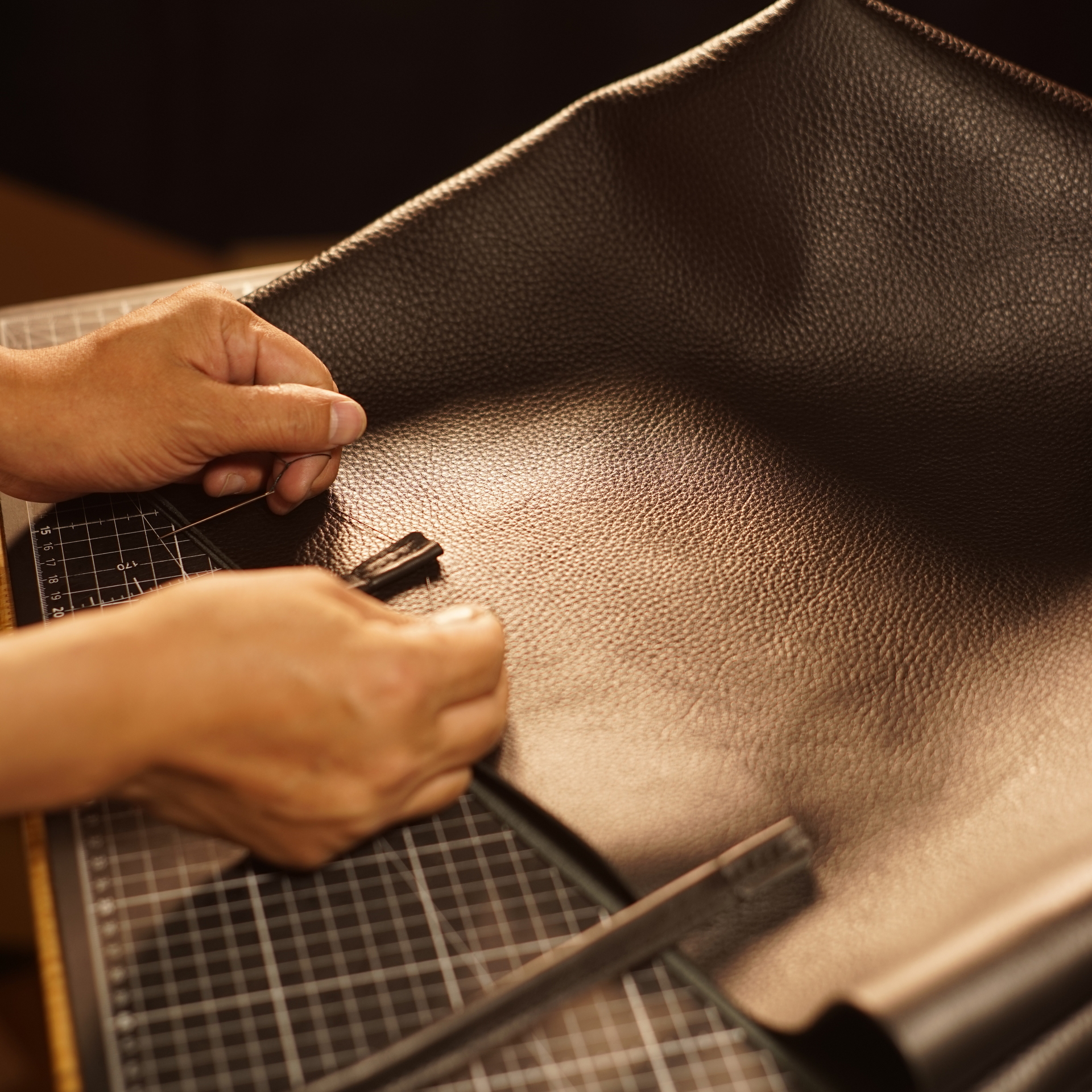 黒いシボ革をカットして持手やカバン本体、内ポケットなどのパーツを作っていきます。カバン本体は持ち手の付け根とマチの底と縁の部分のみ手縫いで、後は古いジャノメの職業用ミシンで縫い上げています。底の部分は二重縫いです。マチの底部分は六花リネン糸で手縫いしています。すべてを縫い上げたら革を裏返しますとカバン本体の出来上がります。