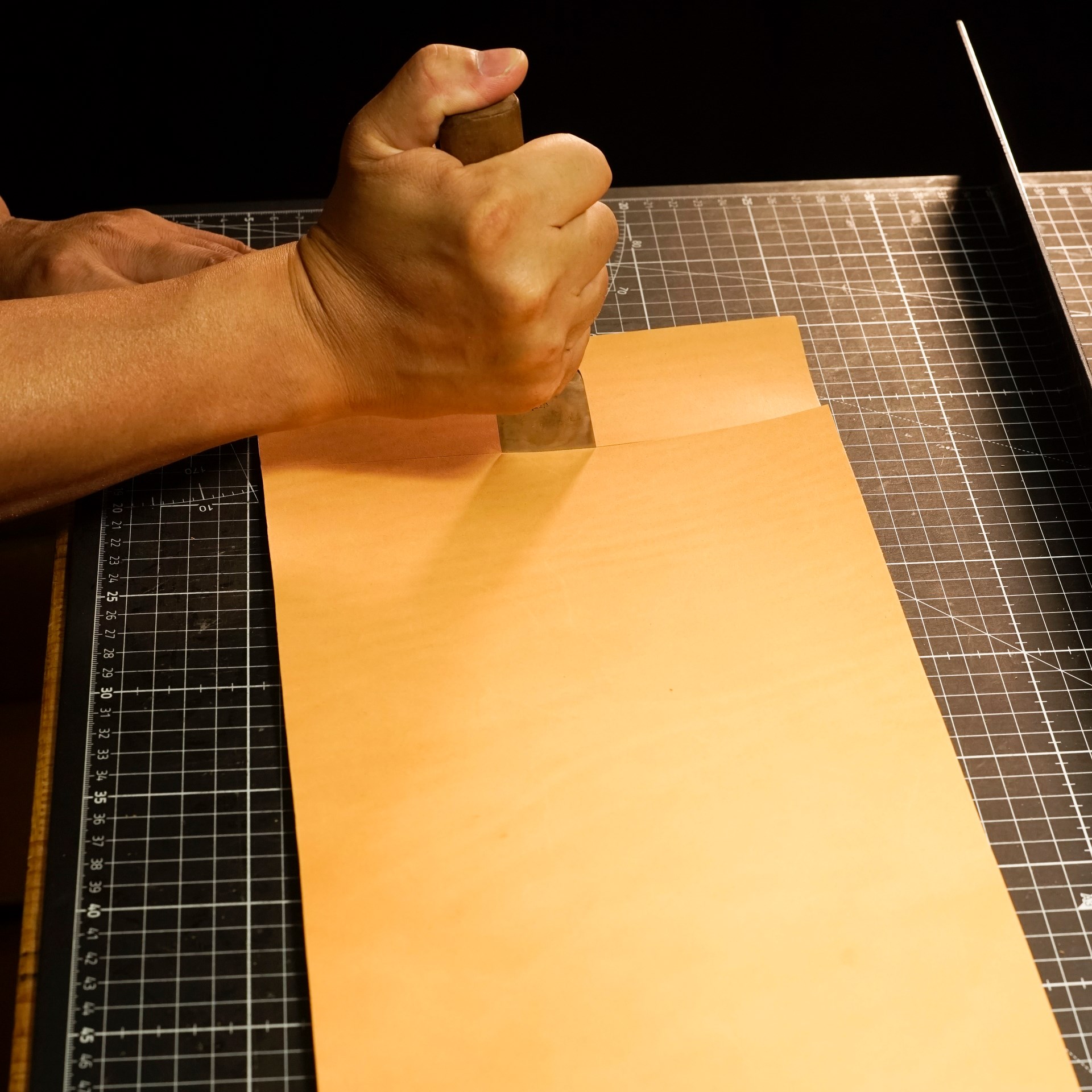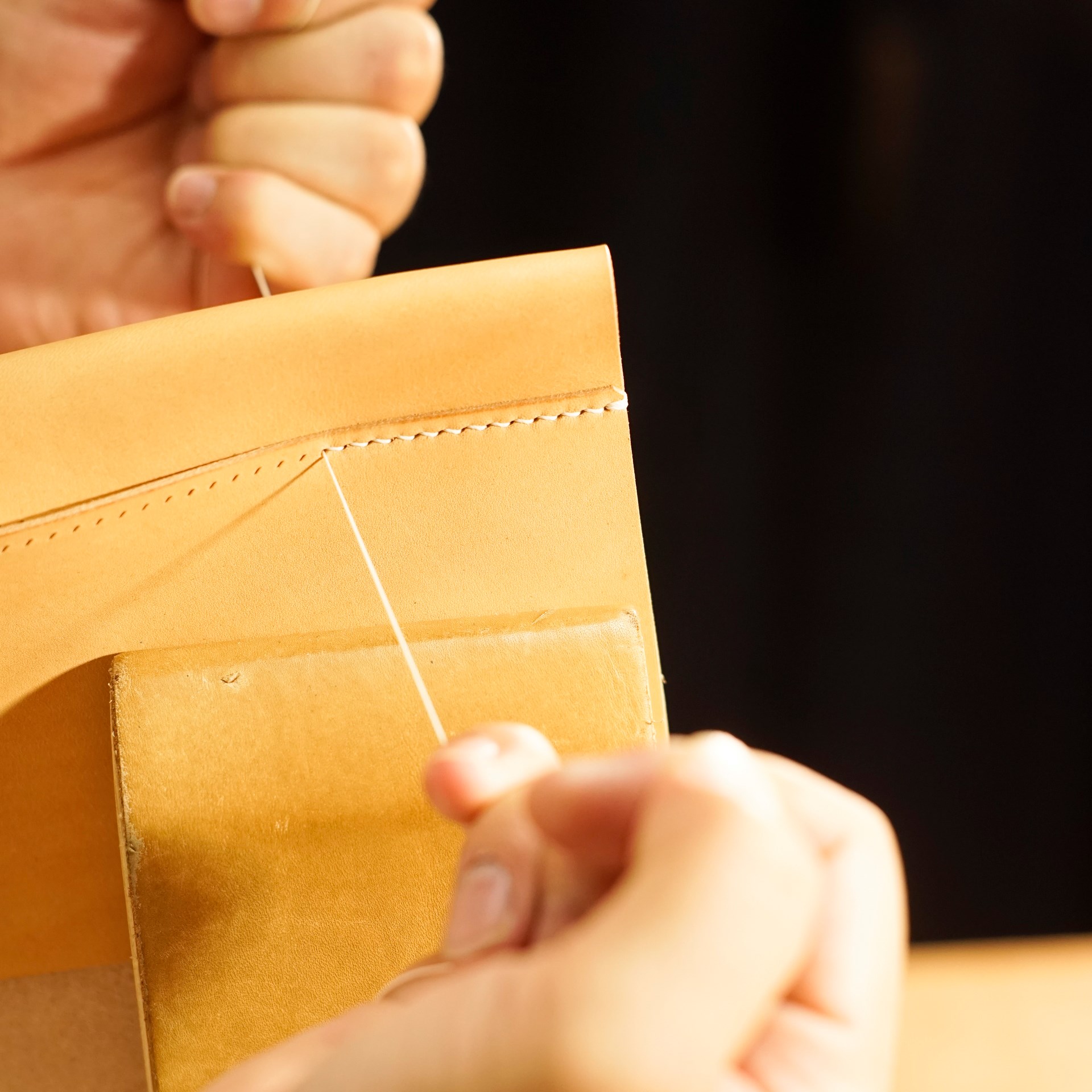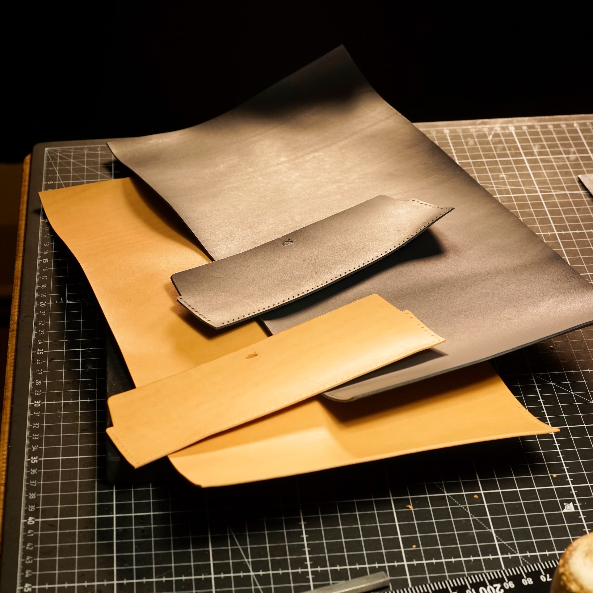 イタリアンソフトの生成りと紺からパーツを切り出して、目打ちと刻印を入れておきます。