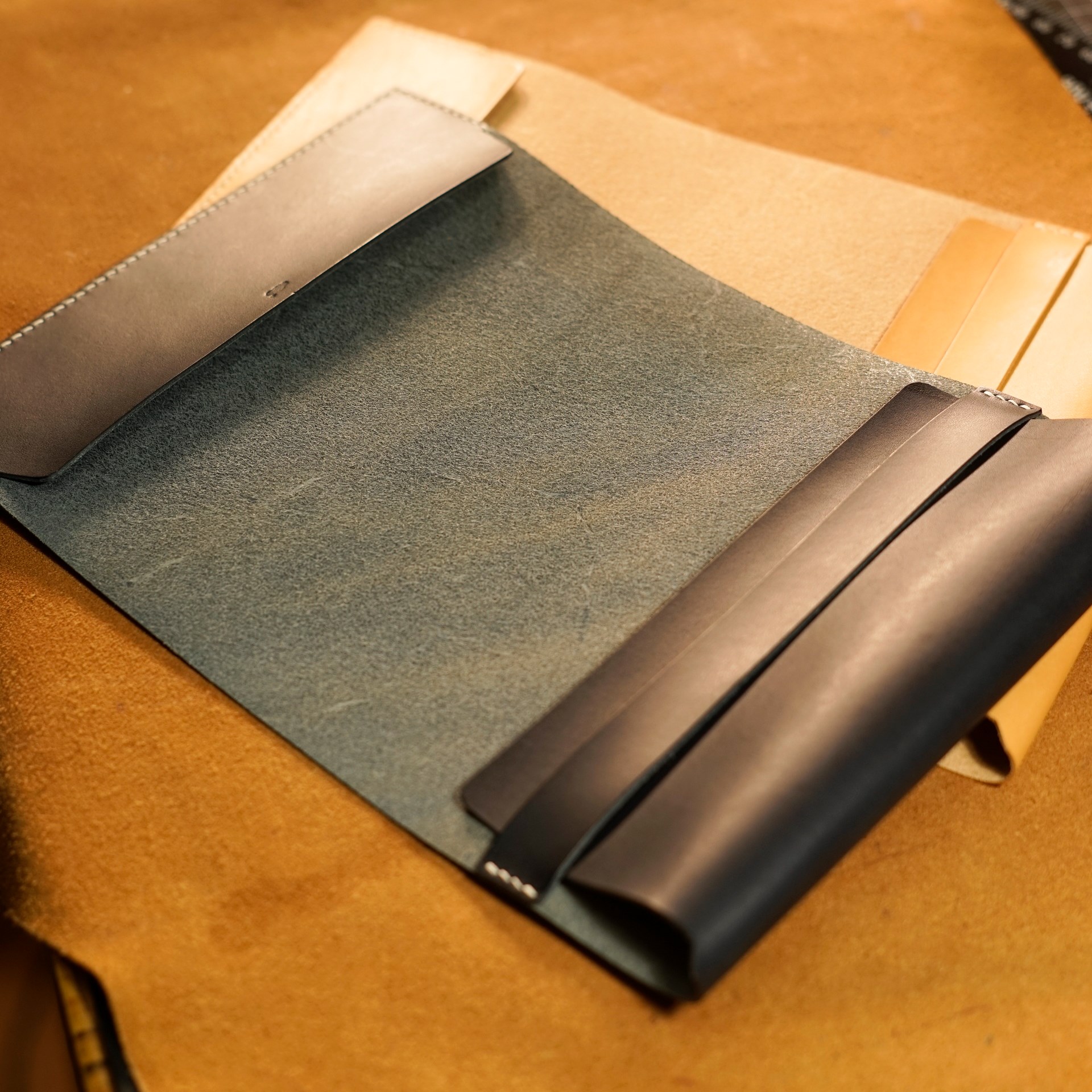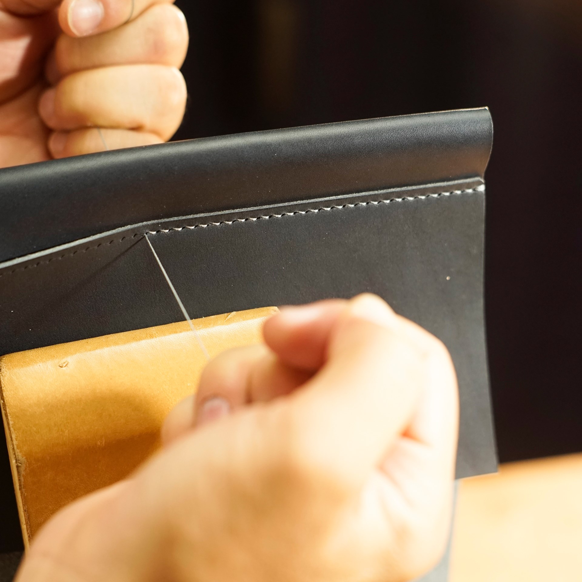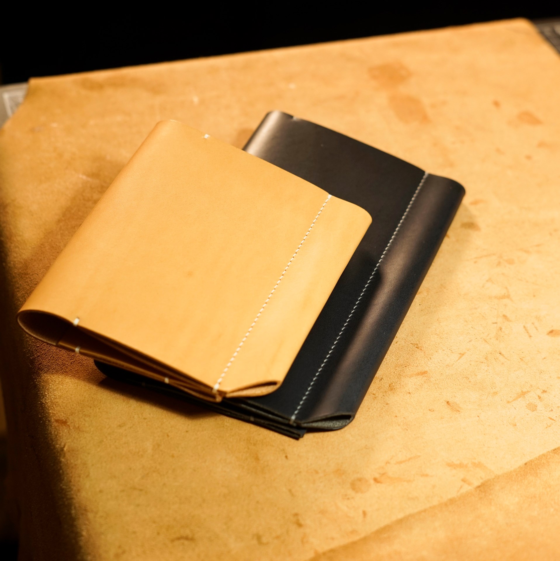 イタリアンソフトの生成りとネイビーをカットして、くも舎刻印、目打ち、軽いコバ磨きを済ませます。