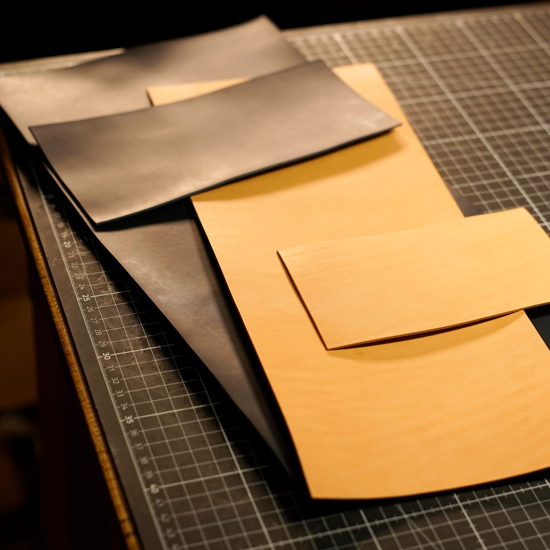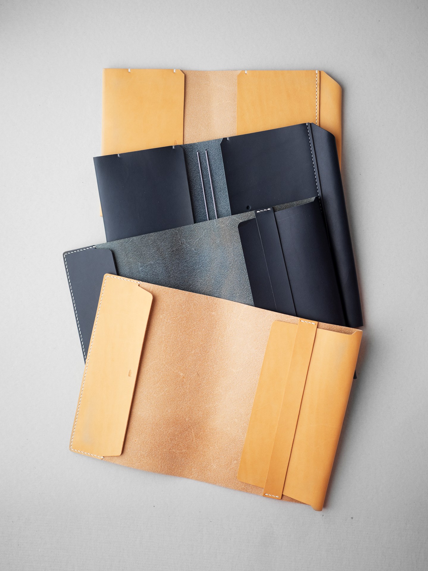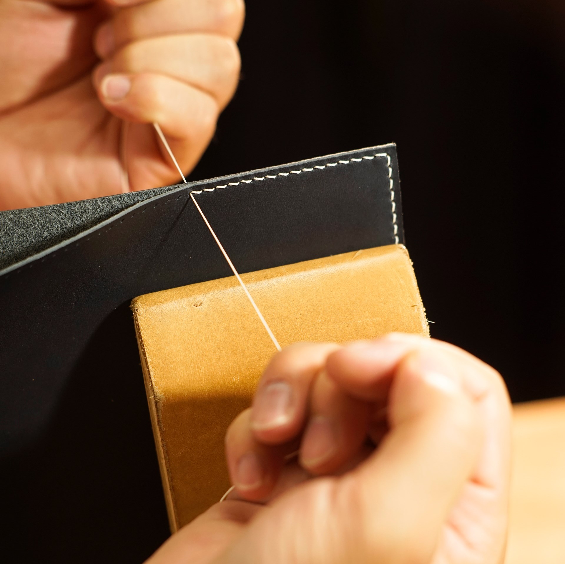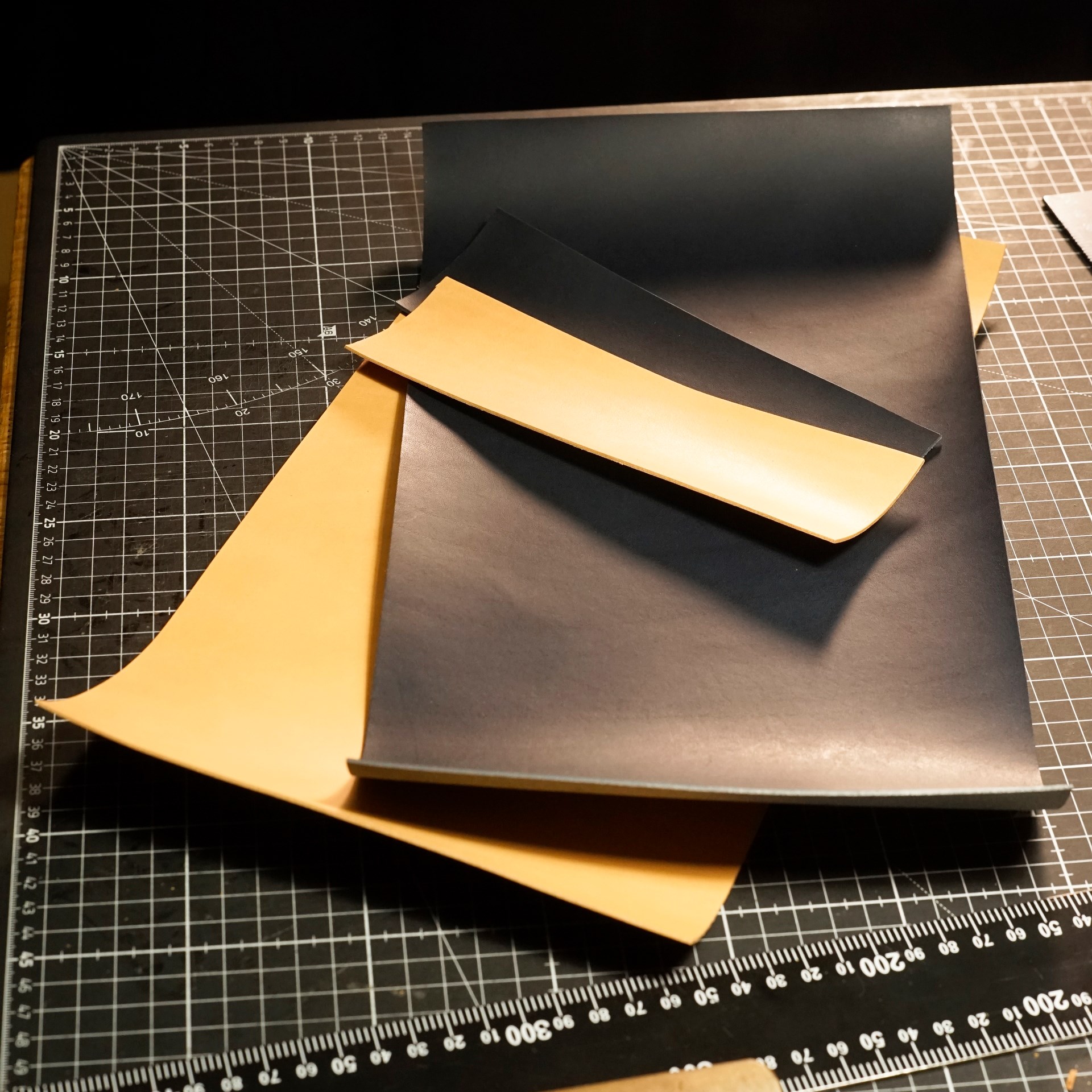 イタリアンソフトの生成りとネイビーをカットして、くも舎刻印、目打ち、軽いコバ磨きを済ませます。