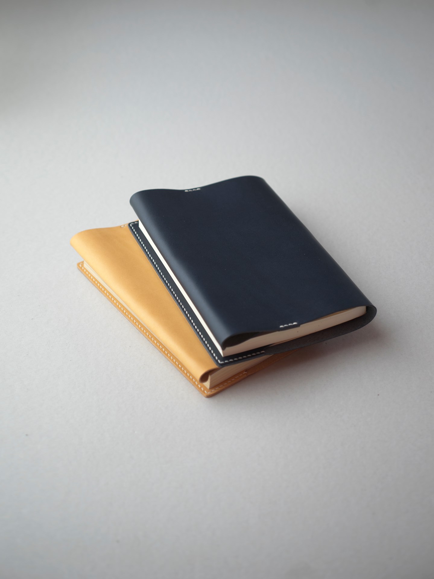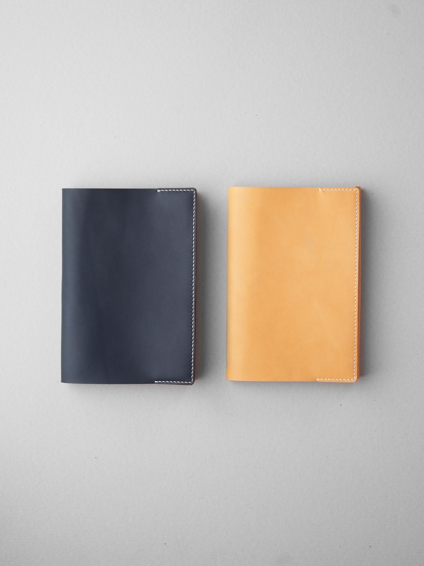 植物タンニン鞣し革に麻糸で手縫いを施したシンプルなつくりです。差込部にステッチを入れることで、ブックカバー1型をよりスマートに、本を読みやすく進化させました。