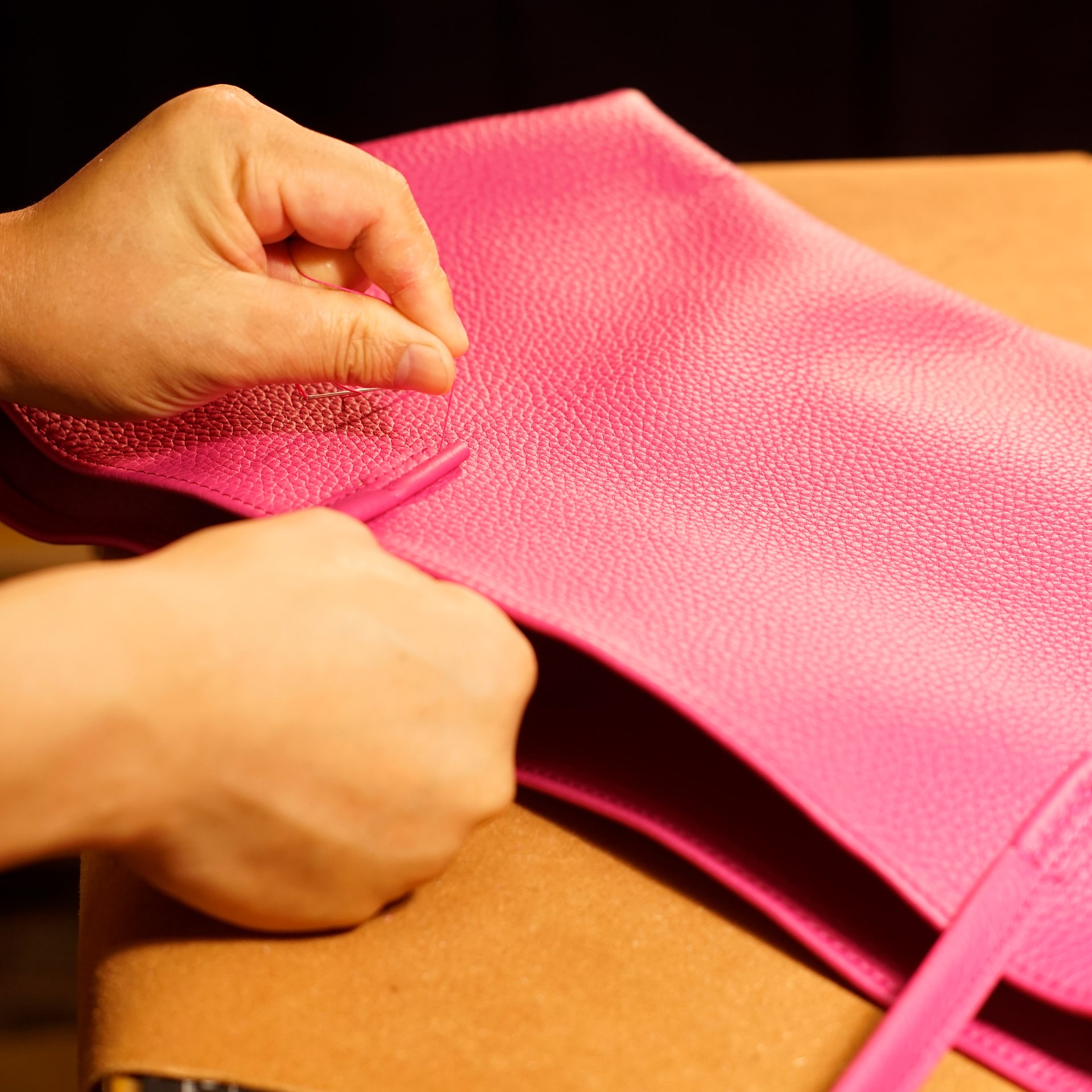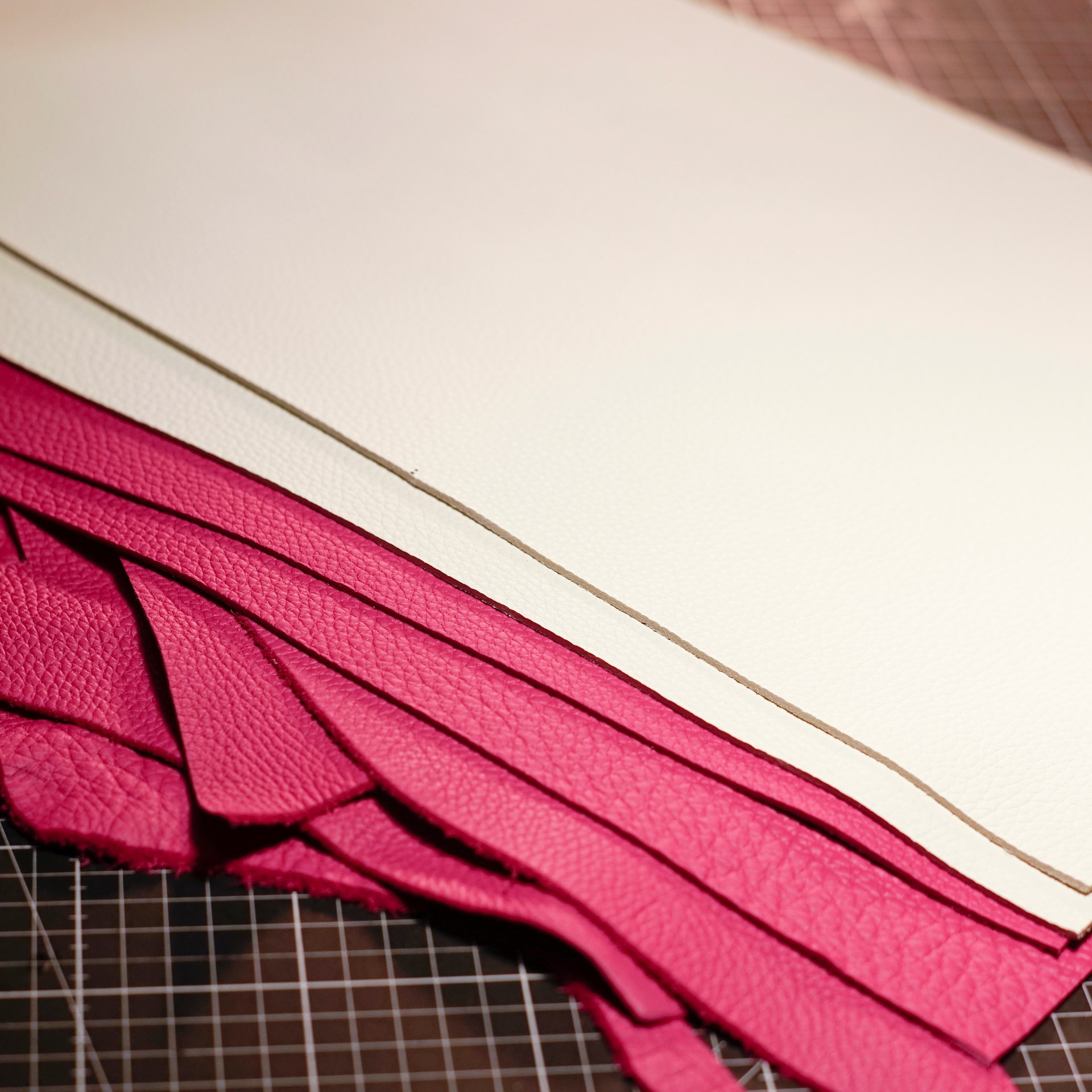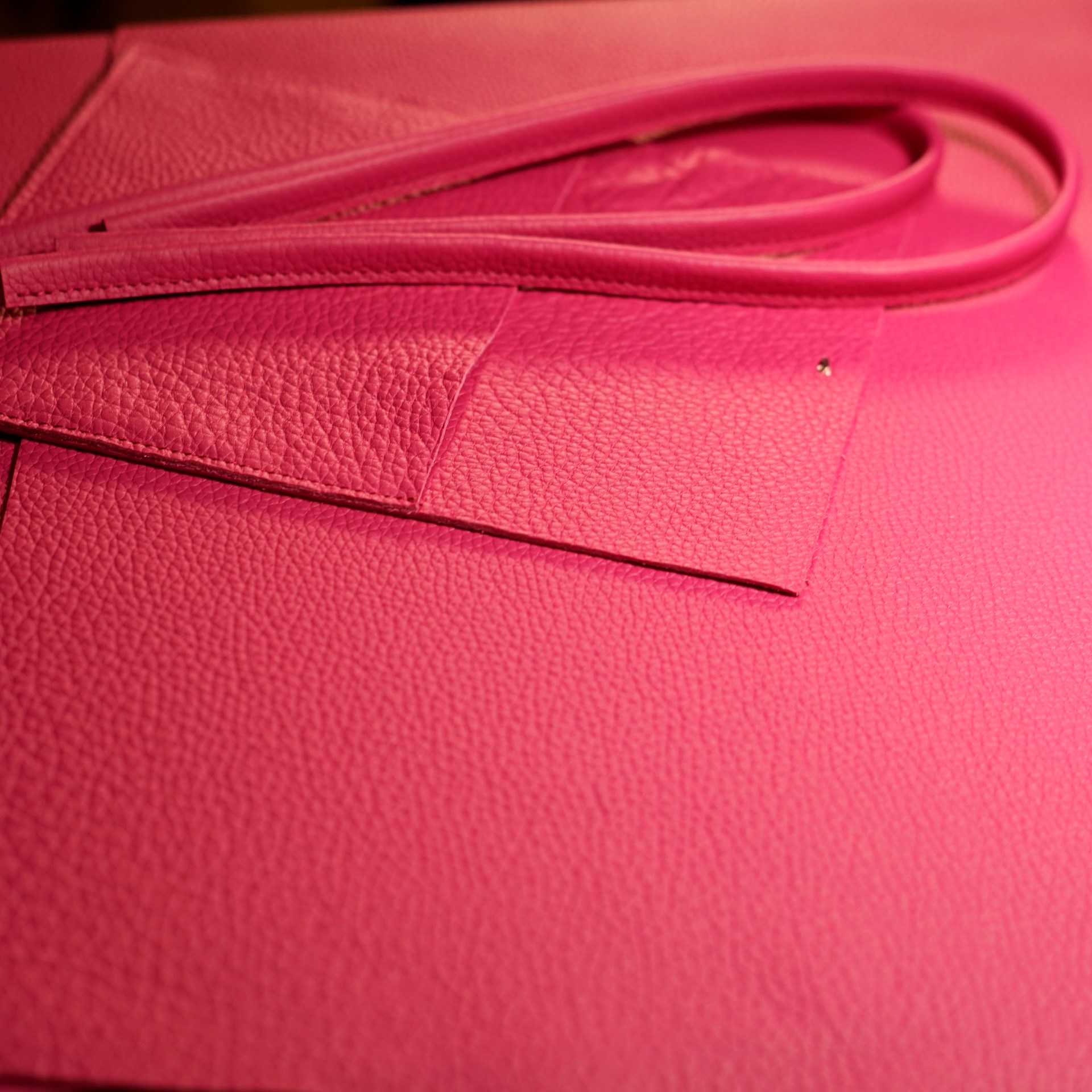 今回はピンクと白のシボ革をカットして持手やカバン本体、内ポケットなどのパーツを作っていきます。カバン本体は持ち手の付け根とマチの底と縁の部分のみ手縫いで、後は古いジャノメの職業用ミシンで縫い上げています。底の部分は二重縫いです。マチの底部分は六花リネン糸で手縫いしています。すべてを縫い上げたら革を裏返しますとカバン本体の出来上がります。