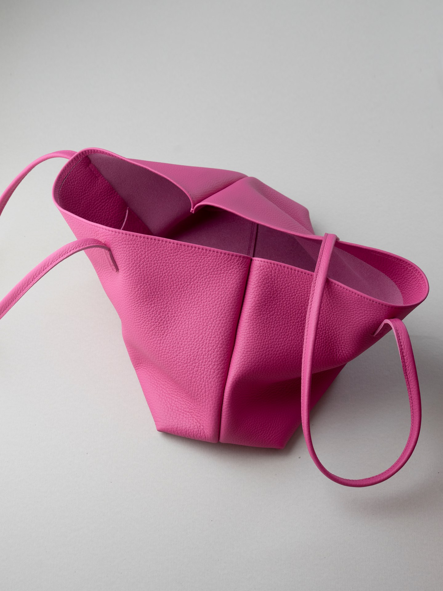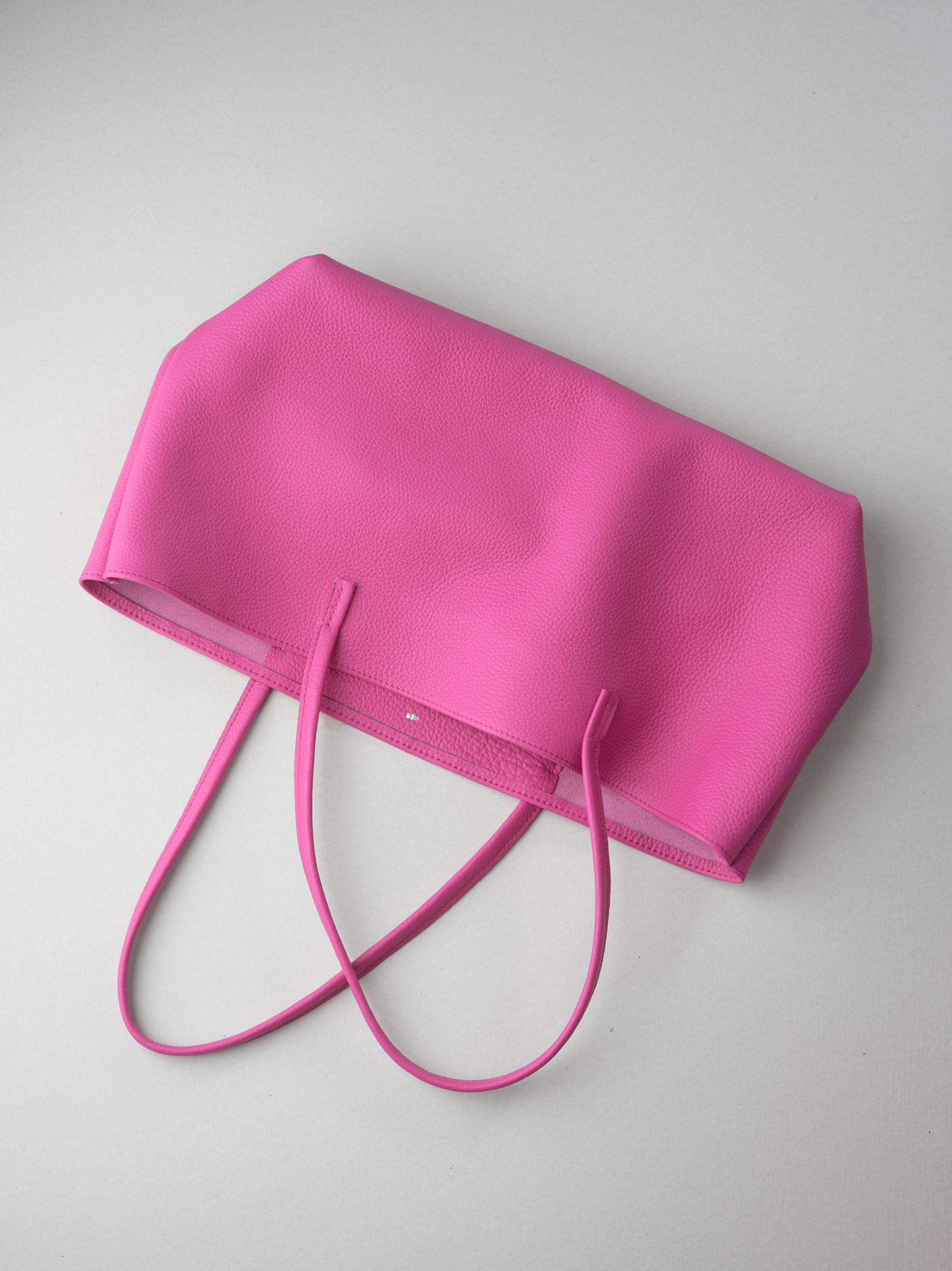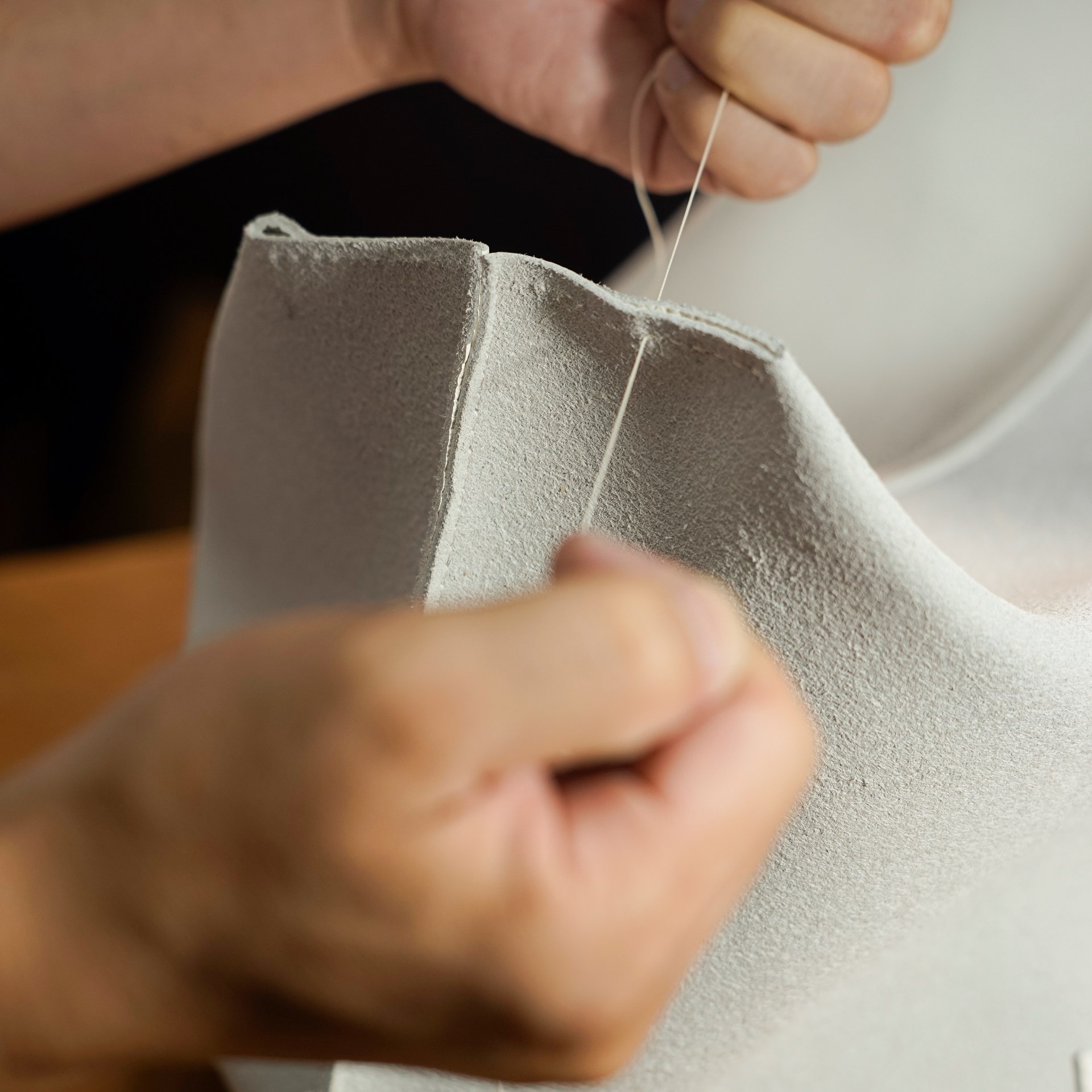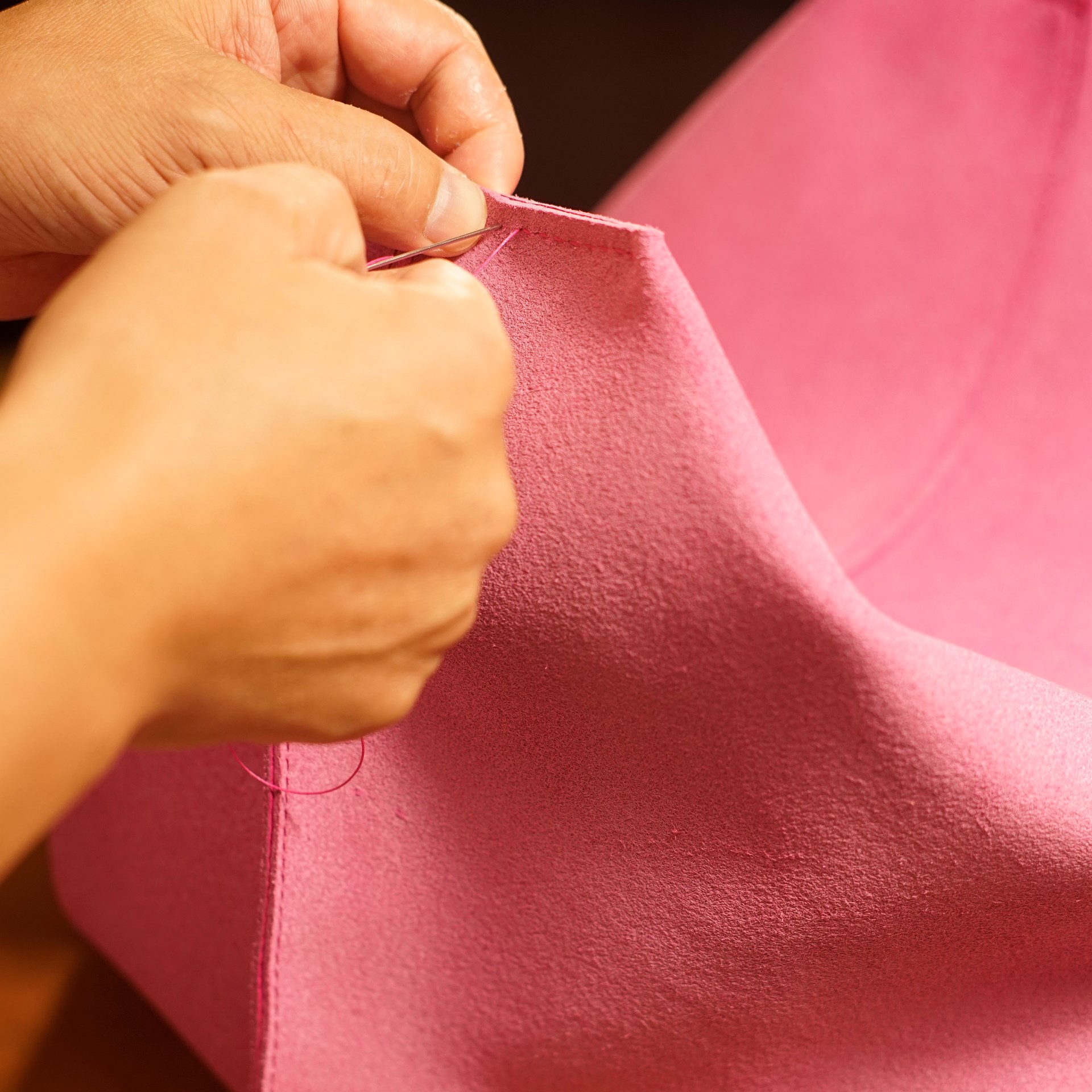 今回はピンクと白のシボ革をカットして持手やカバン本体、内ポケットなどのパーツを作っていきます。カバン本体は持ち手の付け根とマチの底と縁の部分のみ手縫いで、後は古いジャノメの職業用ミシンで縫い上げています。底の部分は二重縫いです。マチの底部分は六花リネン糸で手縫いしています。すべてを縫い上げたら革を裏返しますとカバン本体の出来上がります。