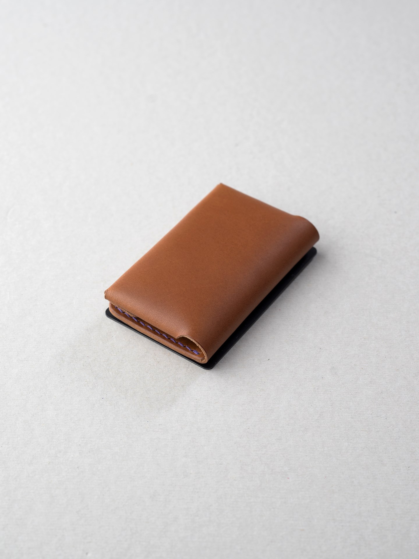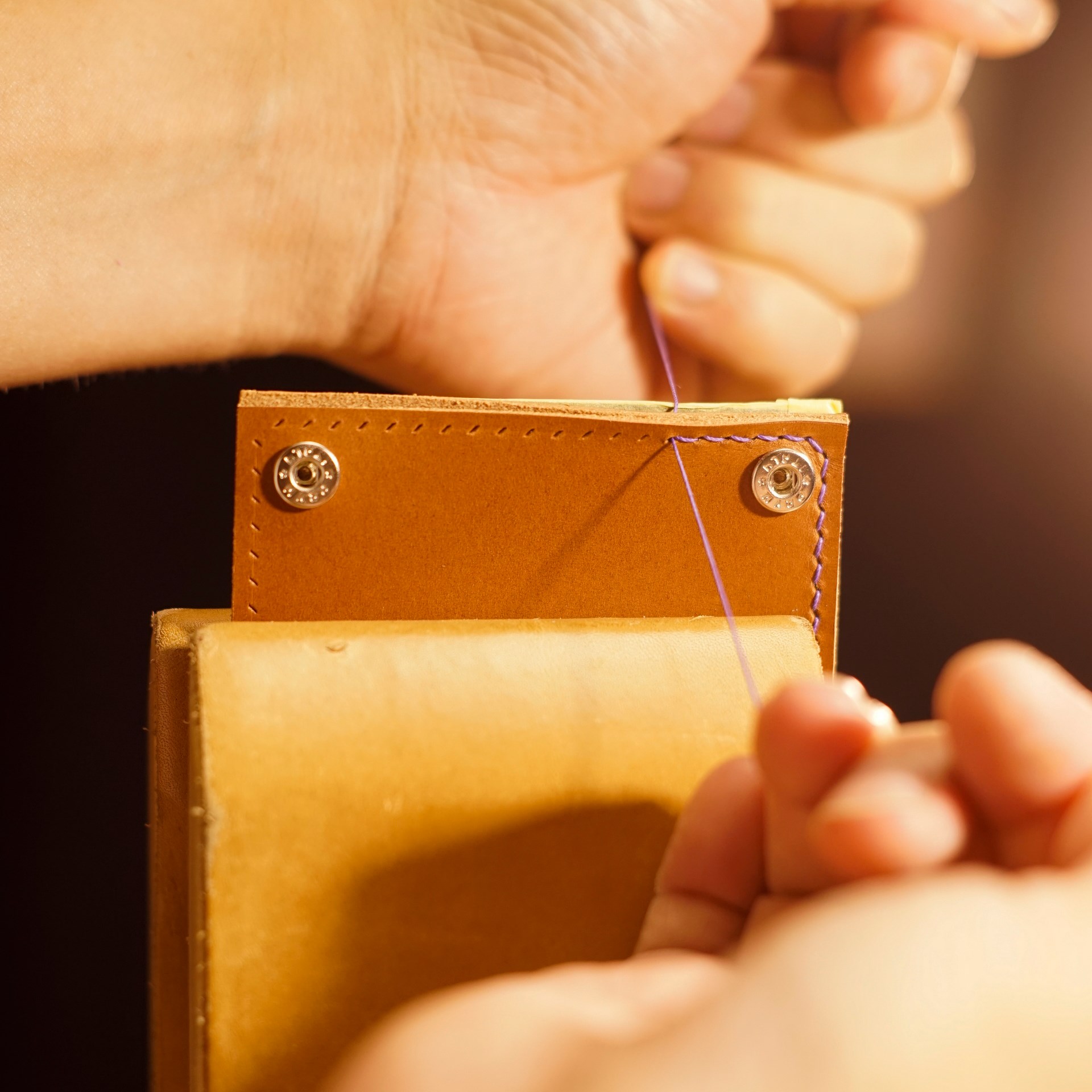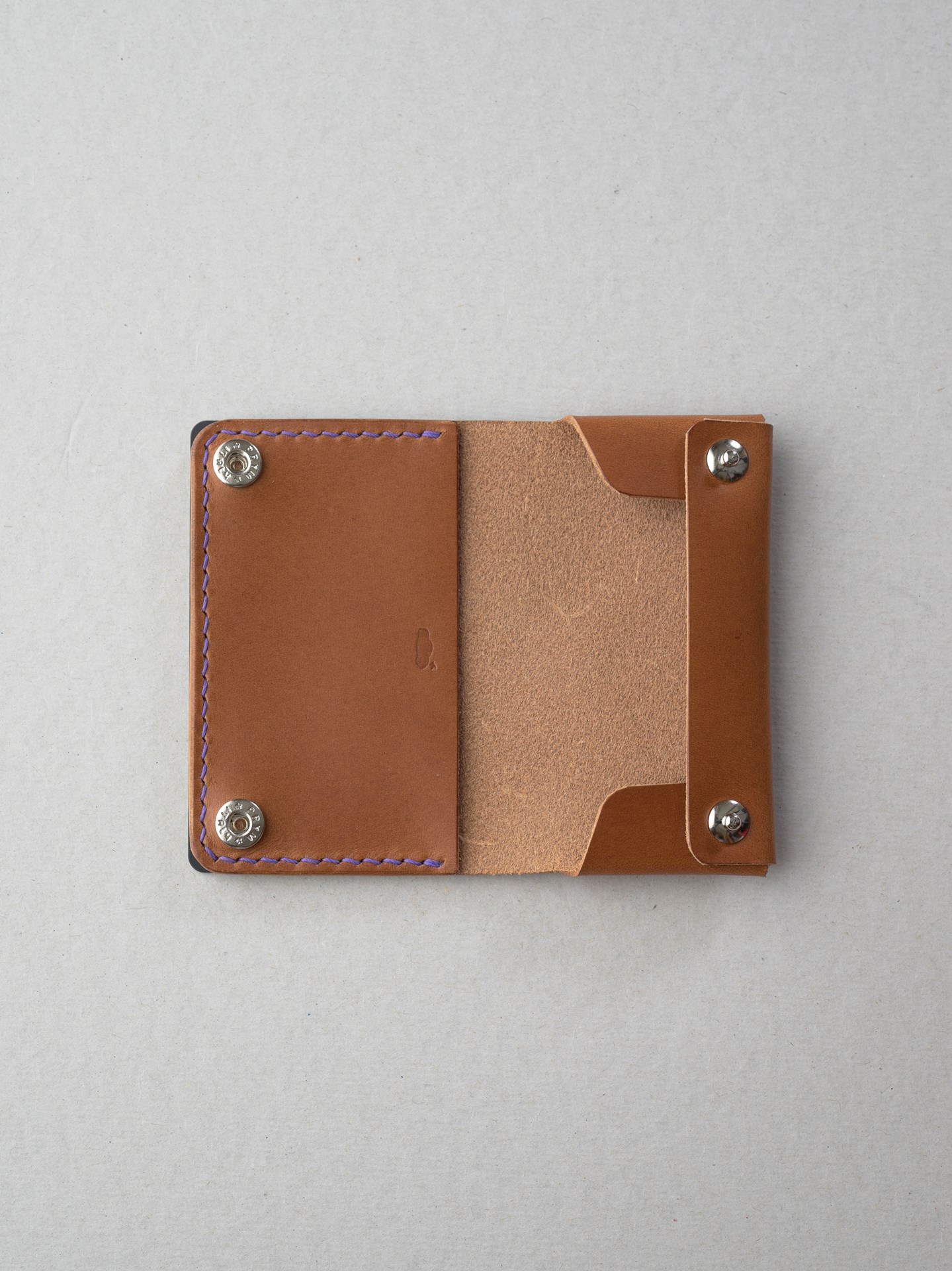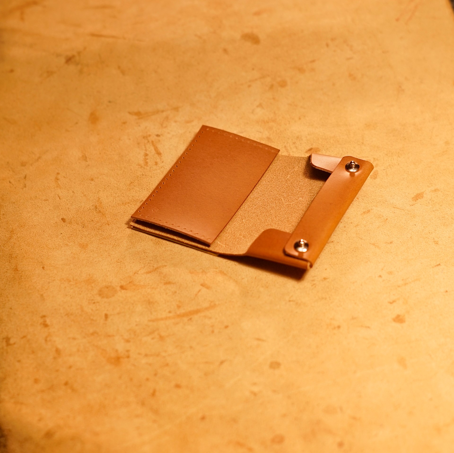 今回はイタリアンハード革のキャメルを使用したミニマリスト財布1型プラスの制作となります。手縫いで使用するのは六花リネン糸の31江戸紫です。ホックは定番プリムの挽物ホック。カチッとした感触が気持ち良いホックです。