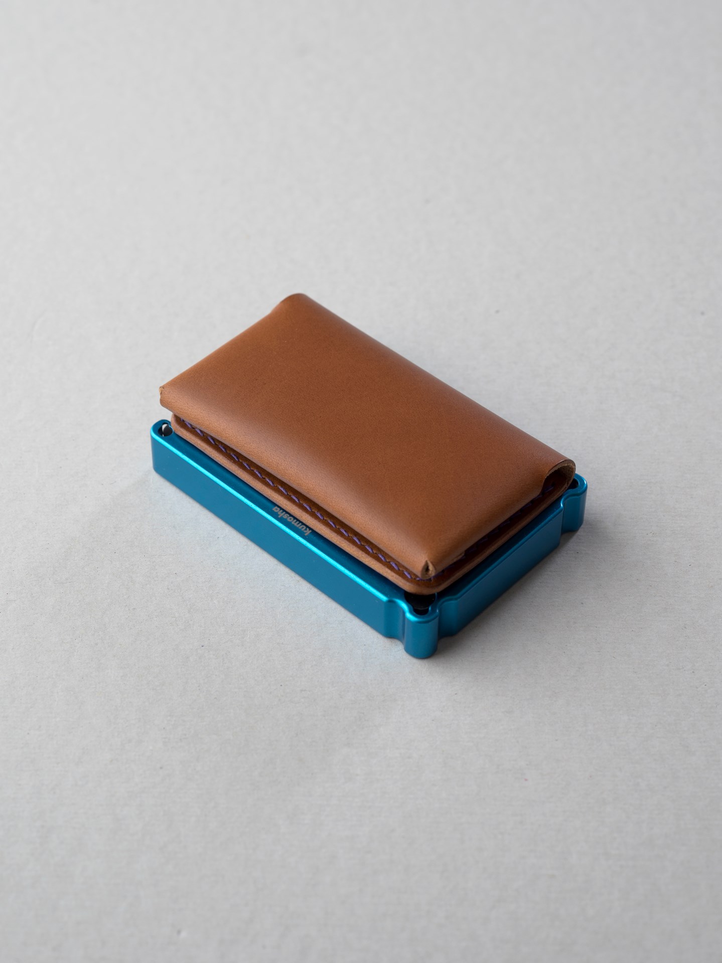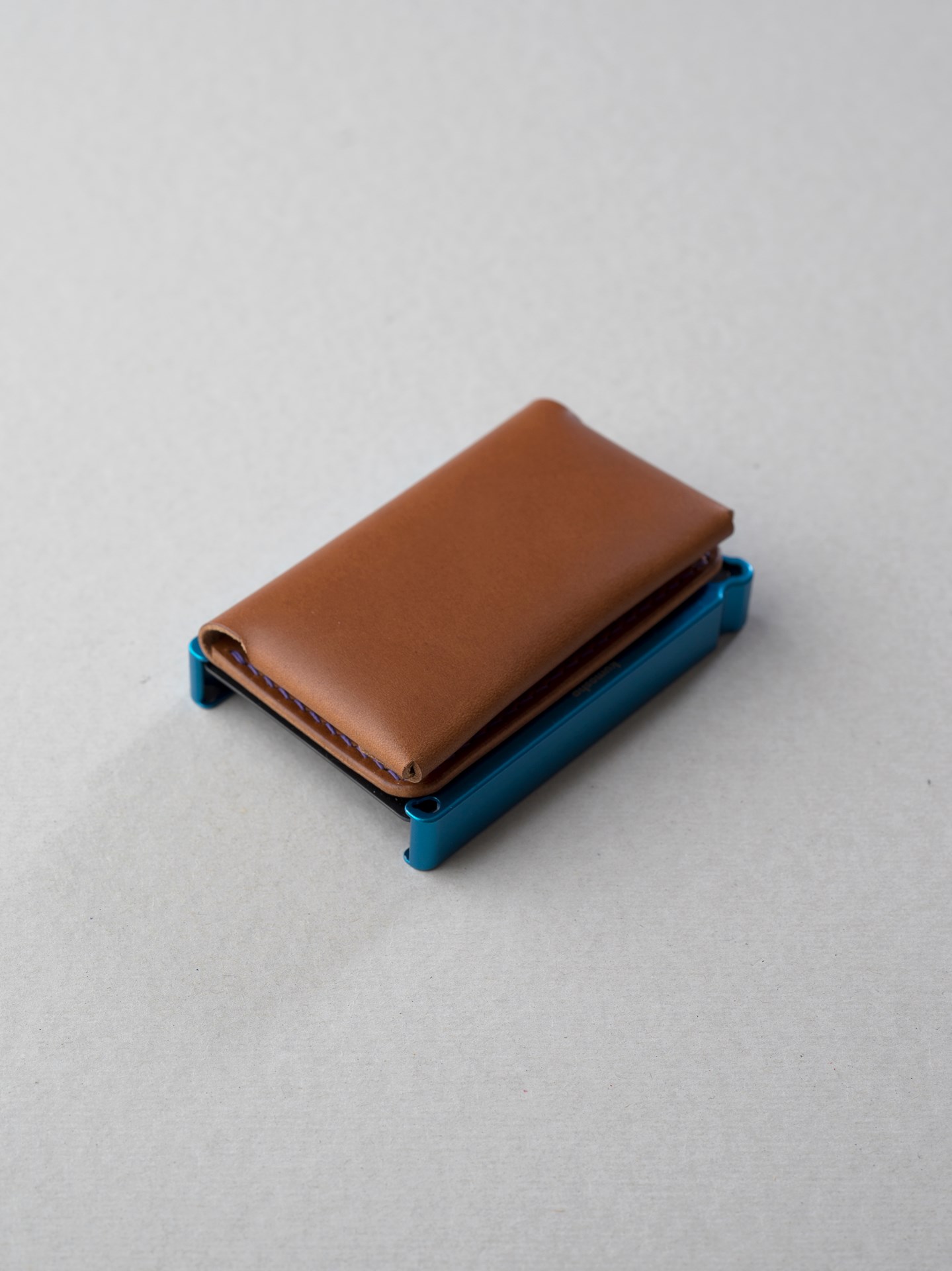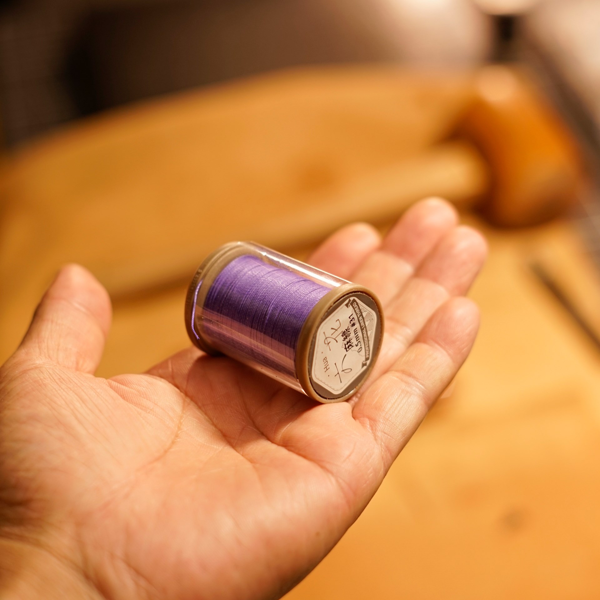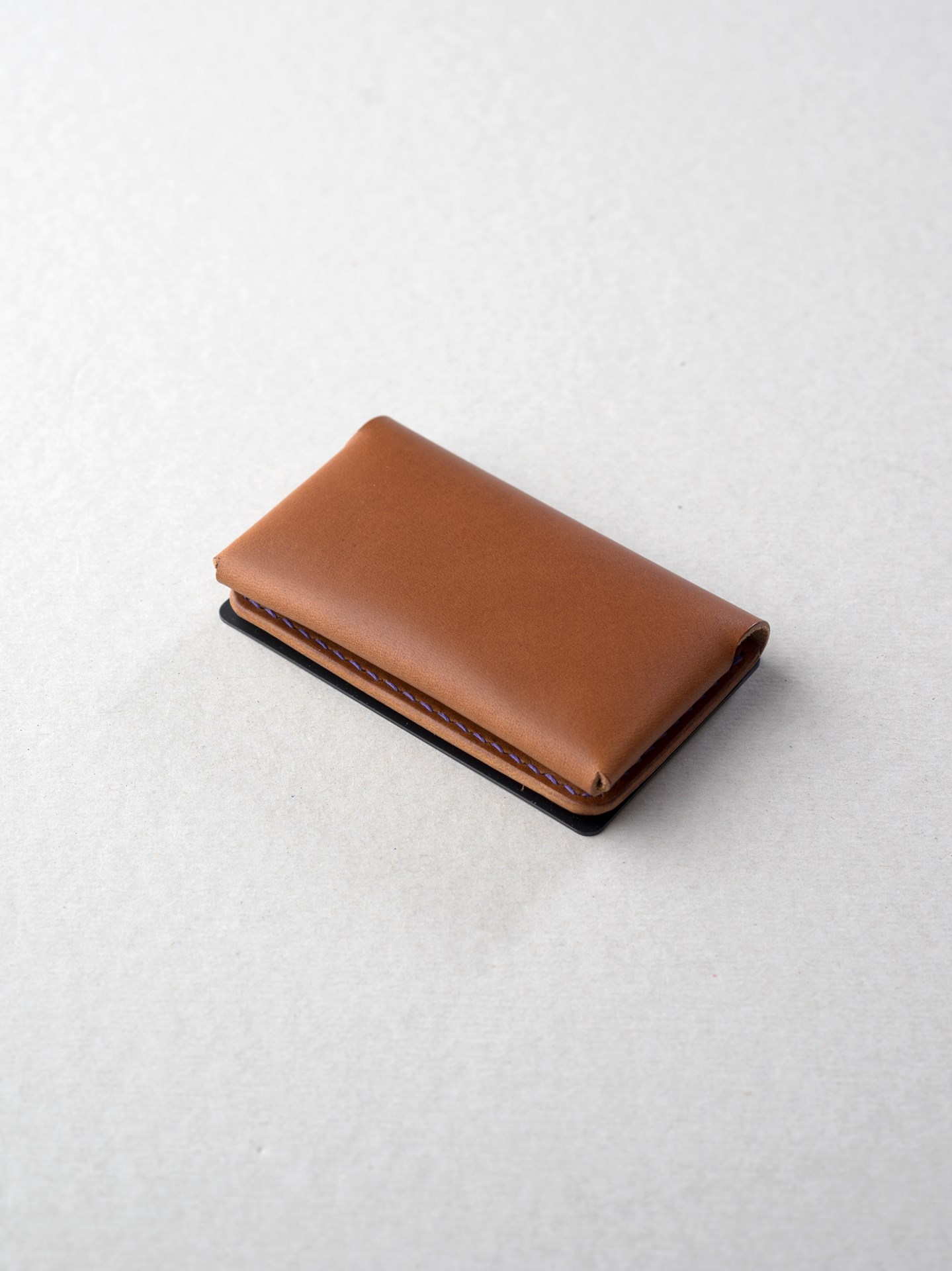 今回はイタリアンハード革のキャメルを使用したミニマリスト財布1型プラスの制作となります。手縫いで使用するのは六花リネン糸の31江戸紫です。ホックは定番プリムの挽物ホック。カチッとした感触が気持ち良いホックです。