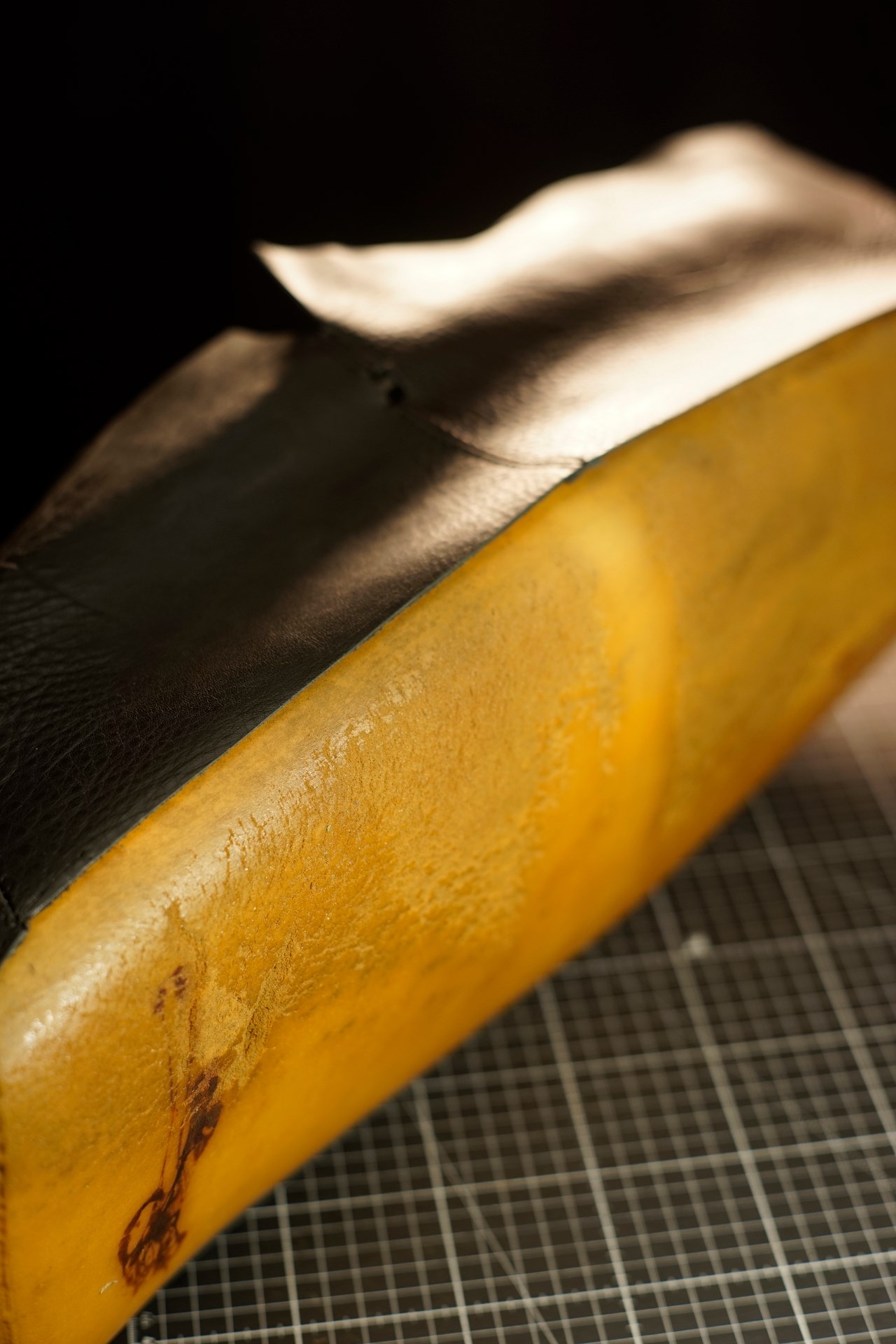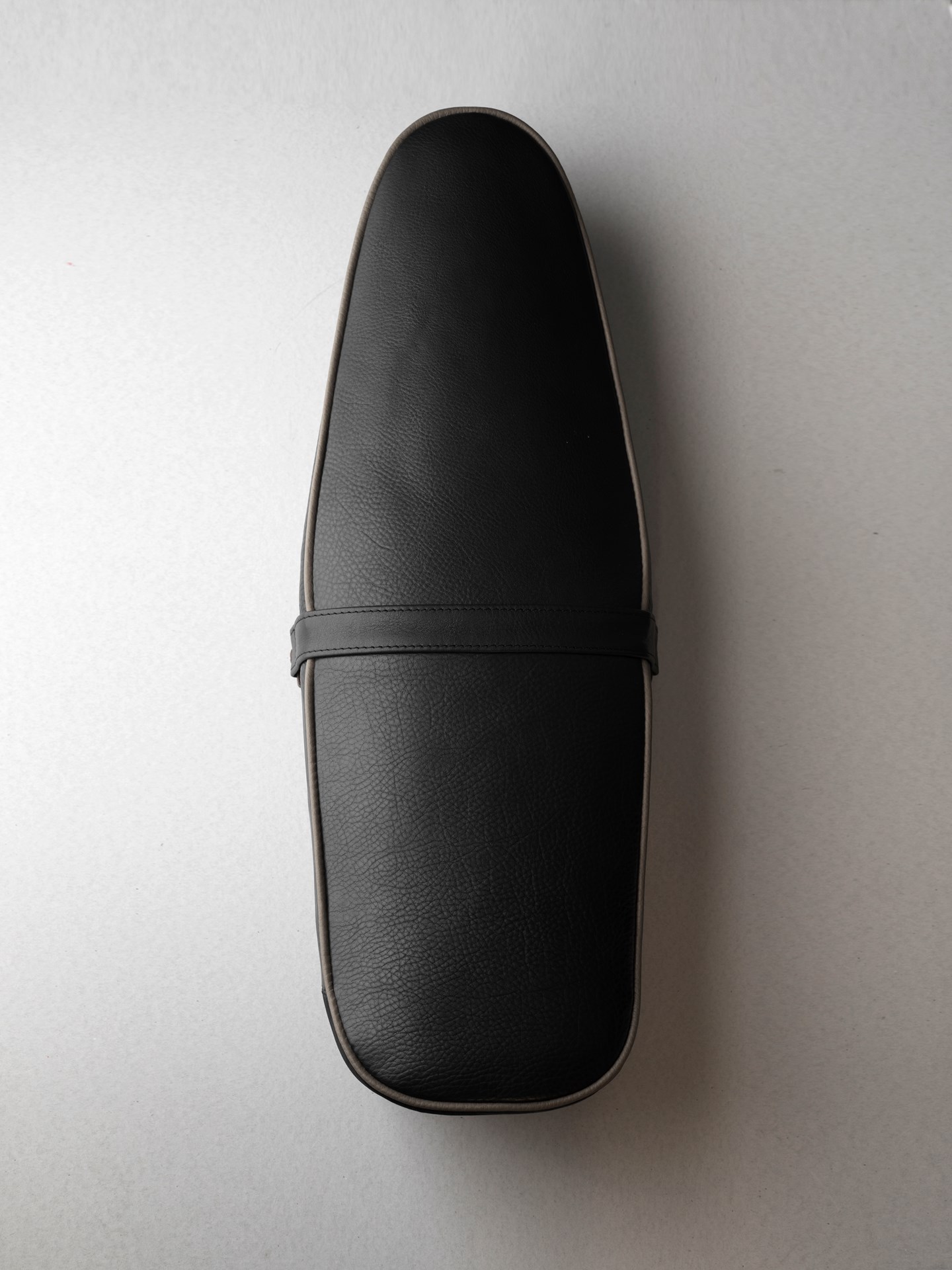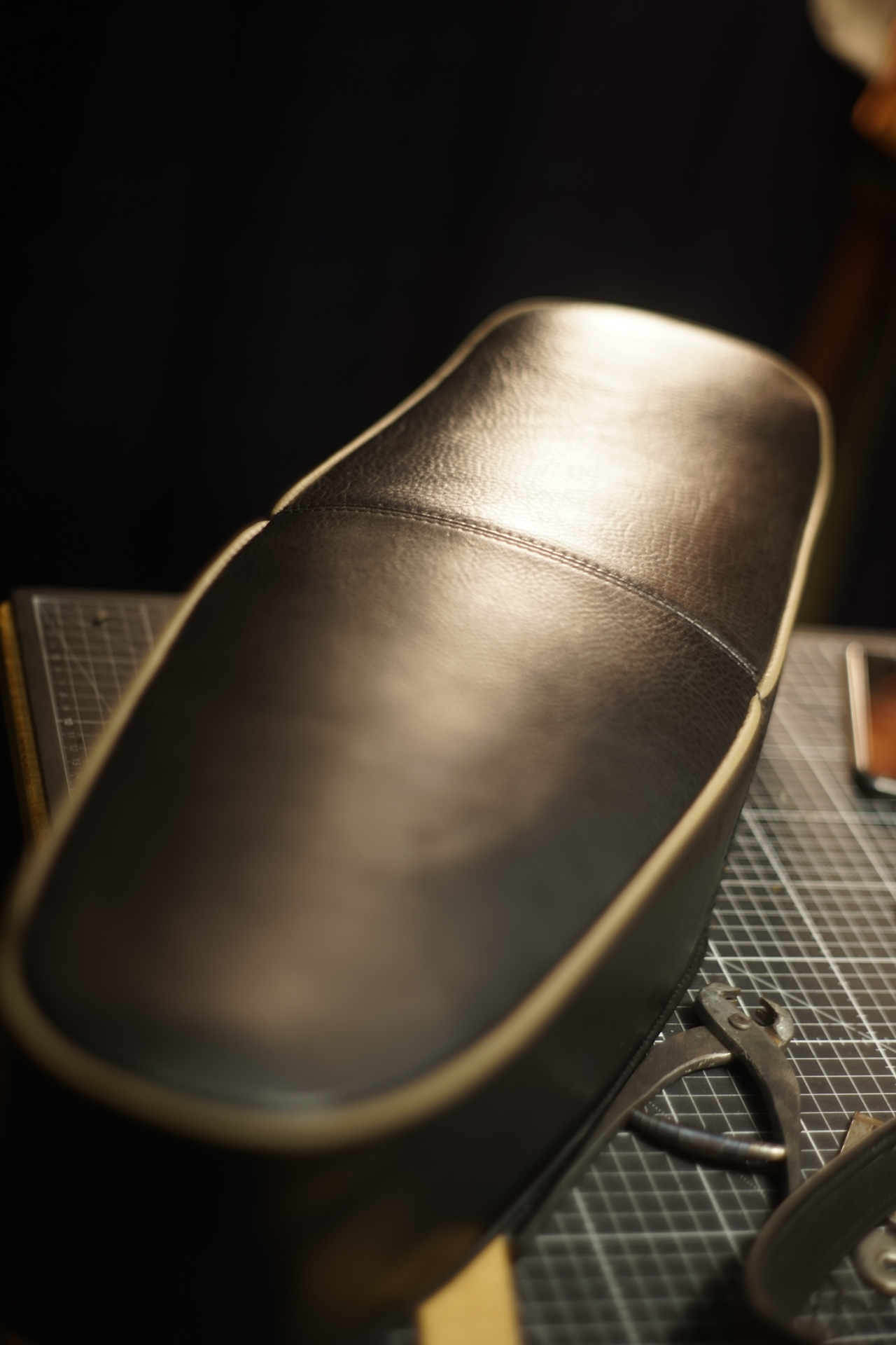 型紙からカットしたシボ革の端切れを縫い合わせてシートカバーの形に仕上げていきます。シート側面はジャノメ763で8番の糸で縫い上げていきます。シートにはめ込んでサイズ感とパイピングのラインのチェックをします。