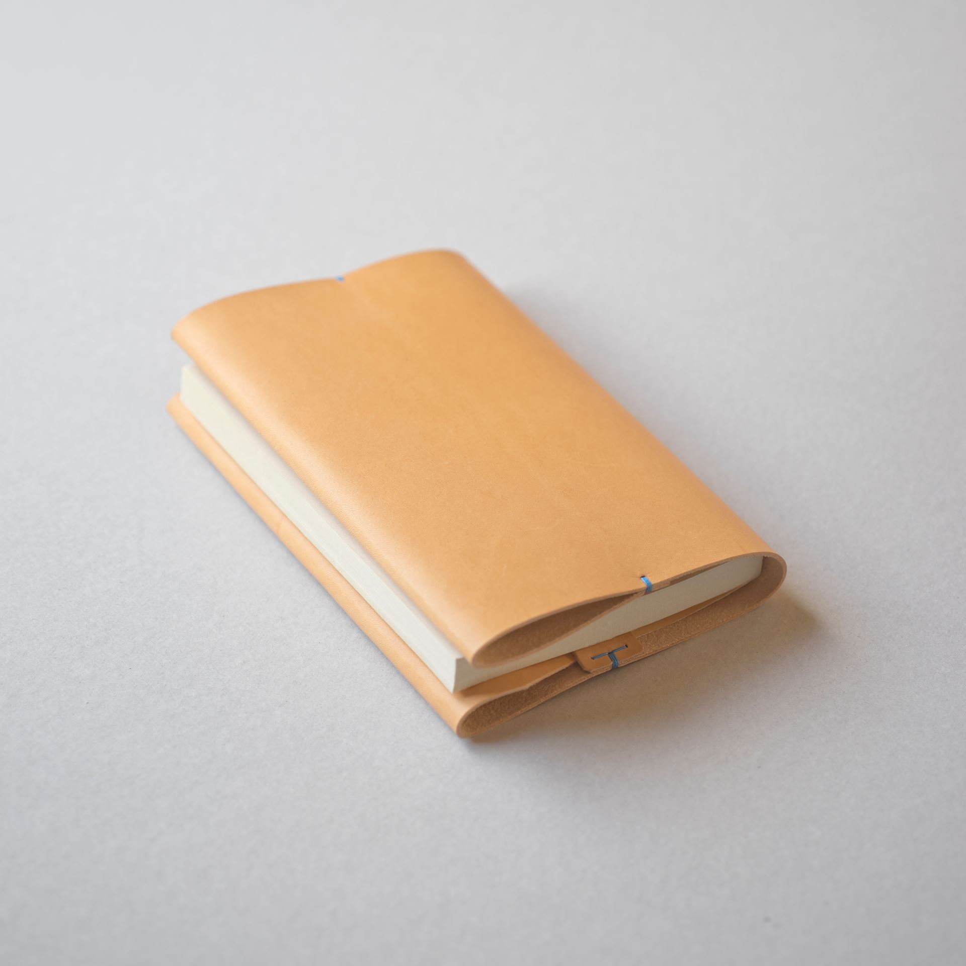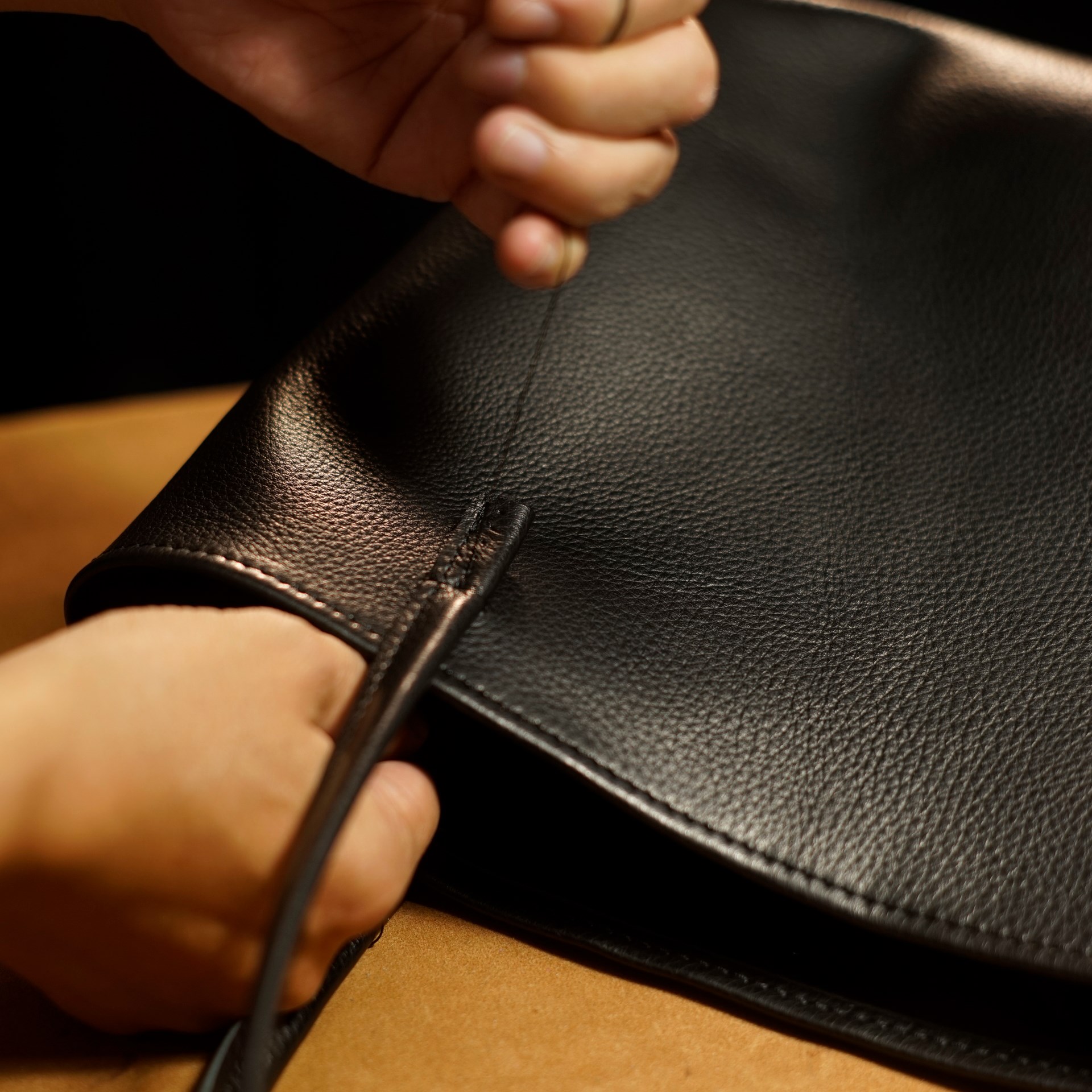 底の部分は二重縫いです。マチの底部分は六花リネン糸で手縫いしています。すべてを縫い上げたら革を裏返しますとカバン本体の出来上がります。