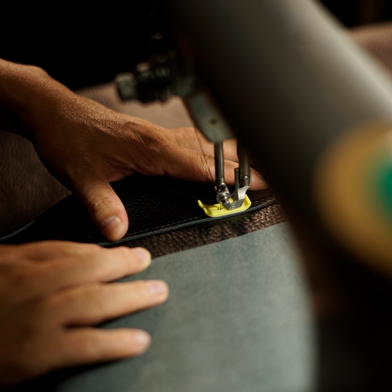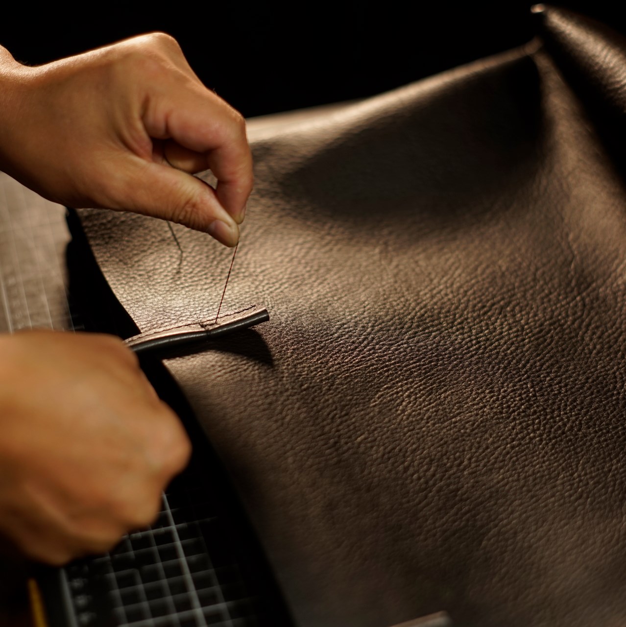 底の部分は二重縫いです。マチの底部分は六花リネン糸で手縫いしています。すべてを縫い上げたら革を裏返しますとカバン本体の出来上がります。