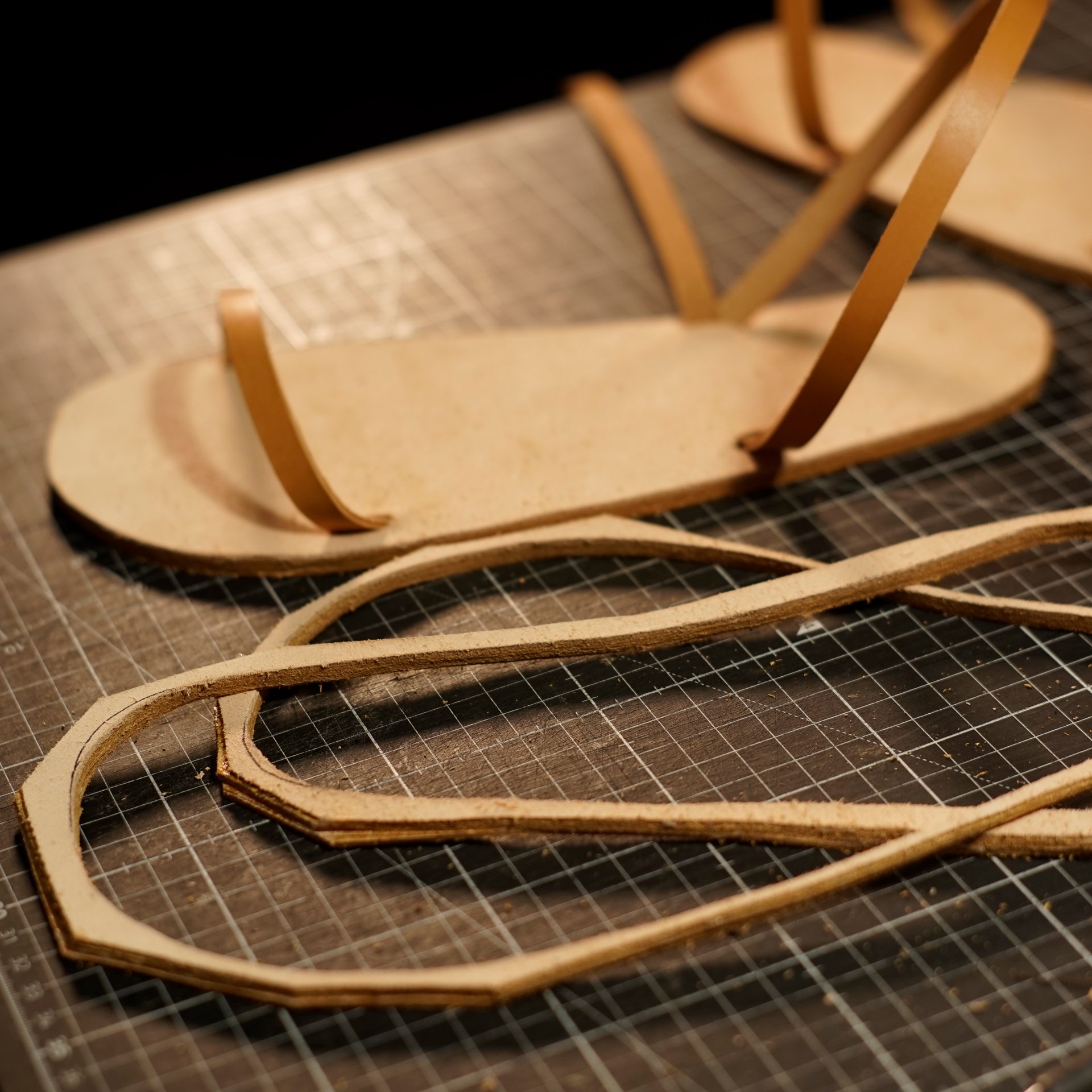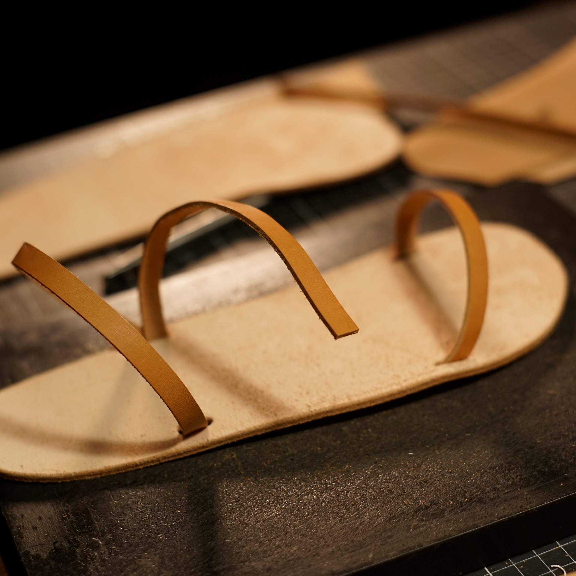 一本紐でサイズの調整機能があって金具も縫い目もなくてシンプルなサンダルを目指します。