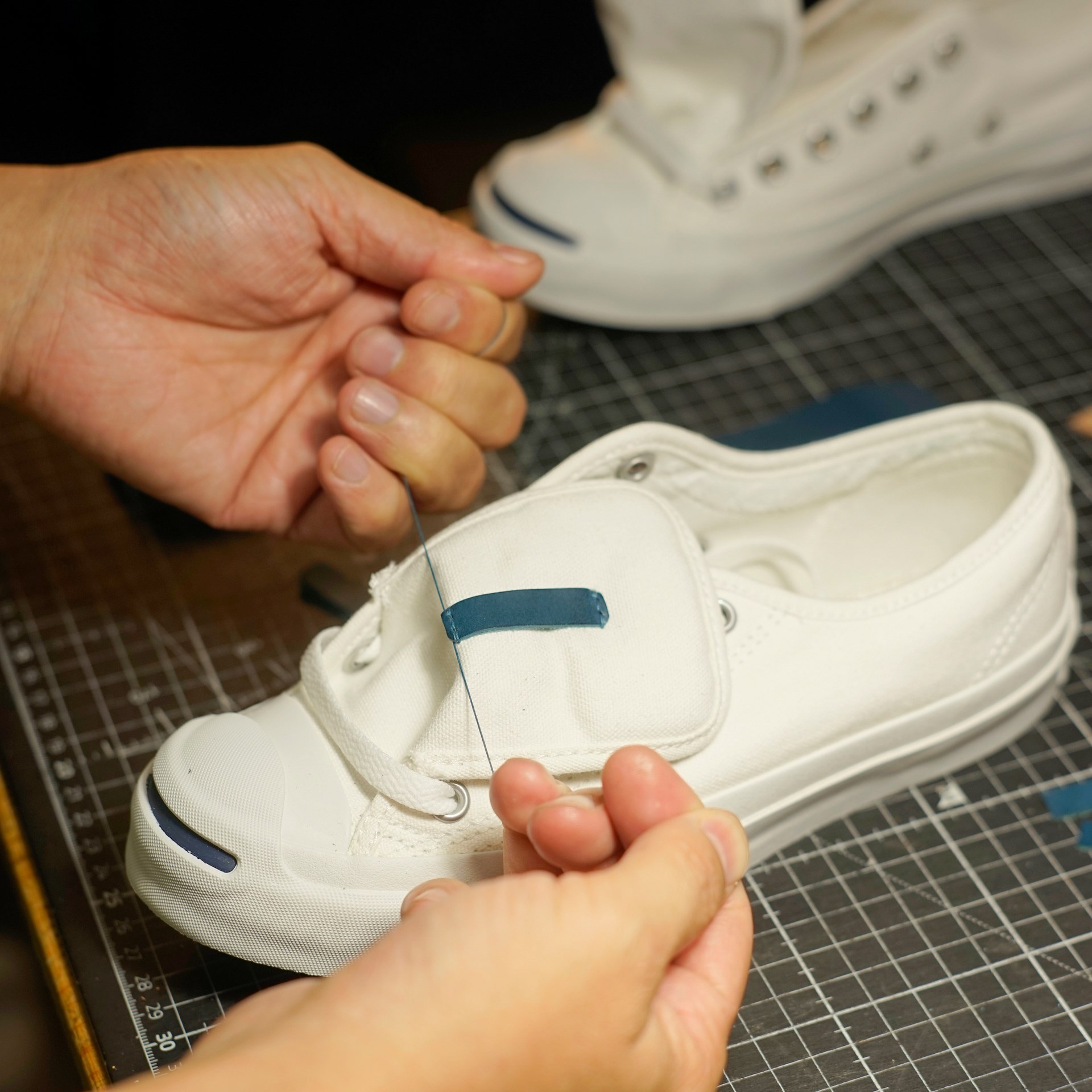 ベロのベルトループを縫い付けます。かかとパーツを縫い付ければ青ひげ改の完成です。