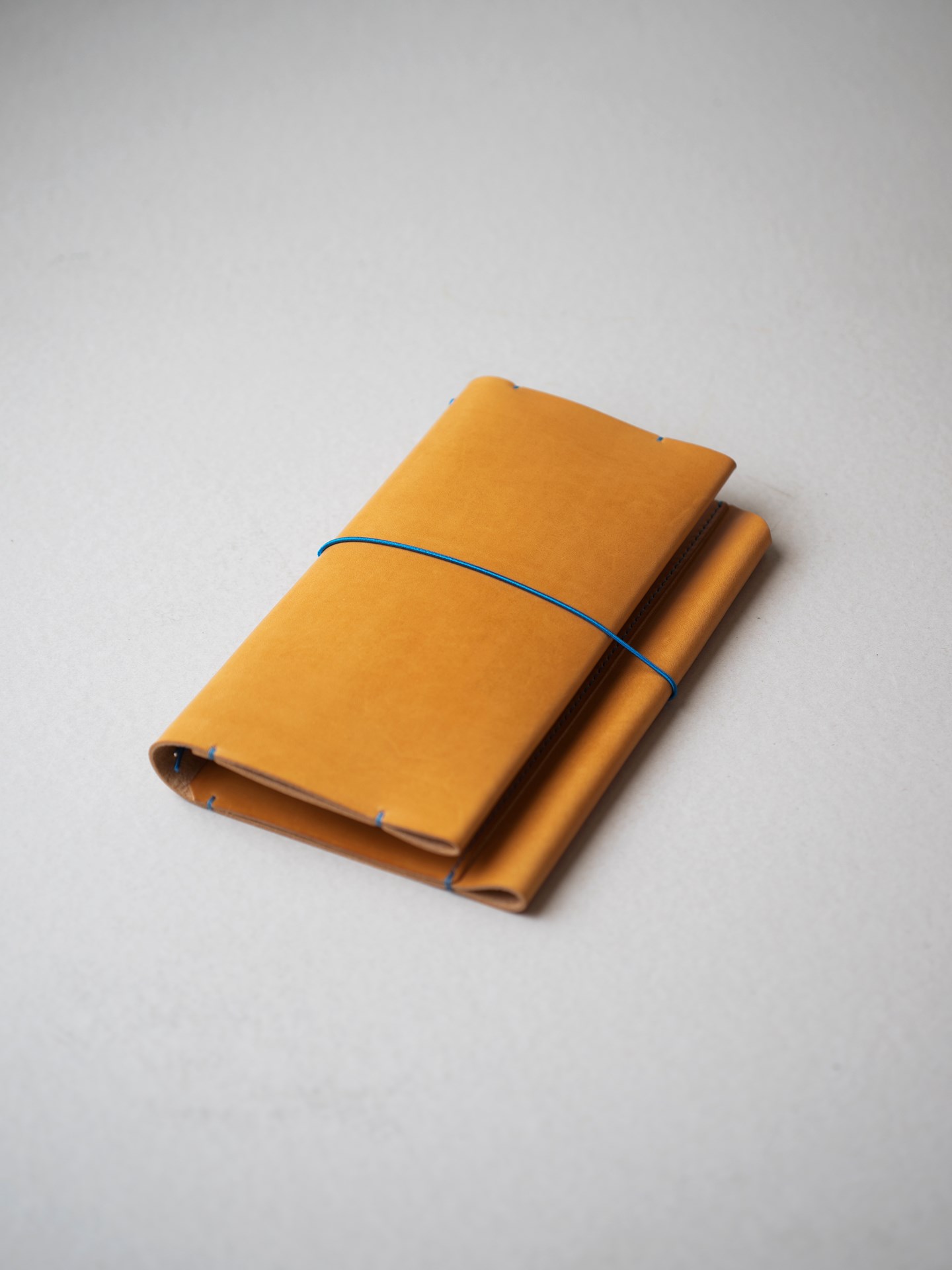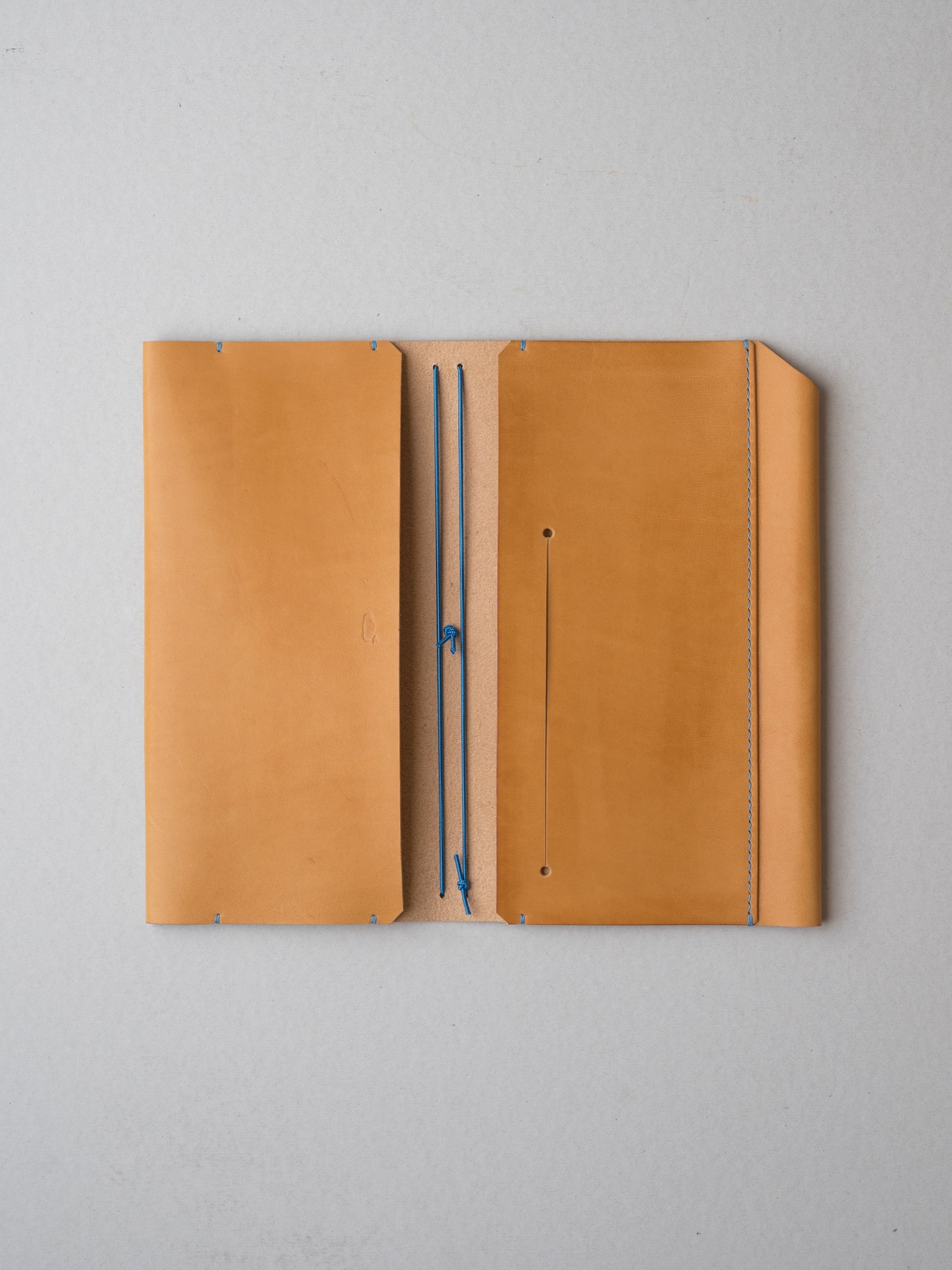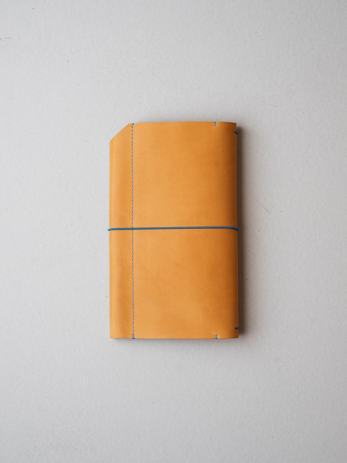 トラベラーズノート用のノートカバーです。植物タンニン鞣し革にラミー糸で手縫いを施したシンプルなつくり。太めのペンもしっかり収納できます。ゴム紐つきで挟めるリフィルが増やせます。カバーのバインドも可能です。