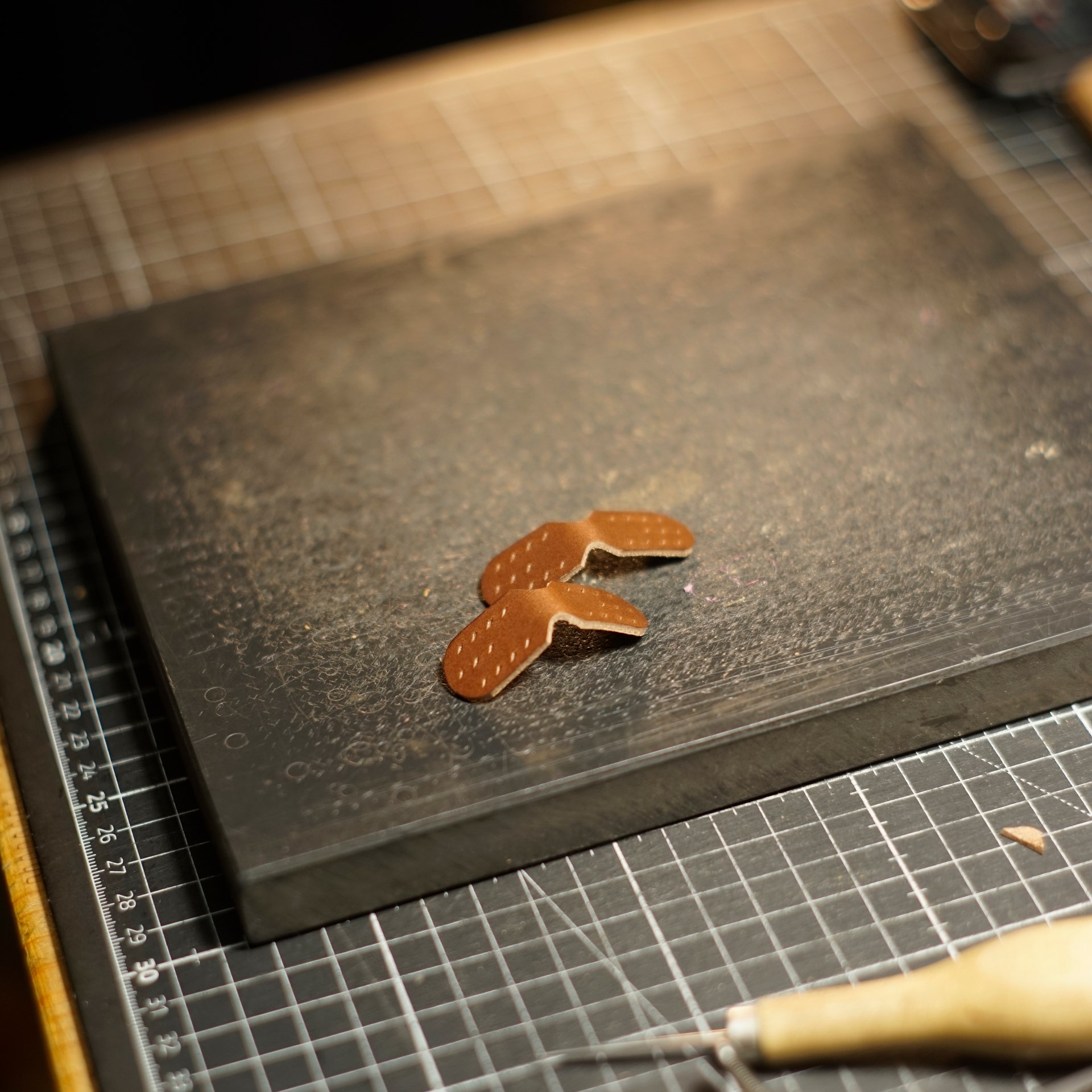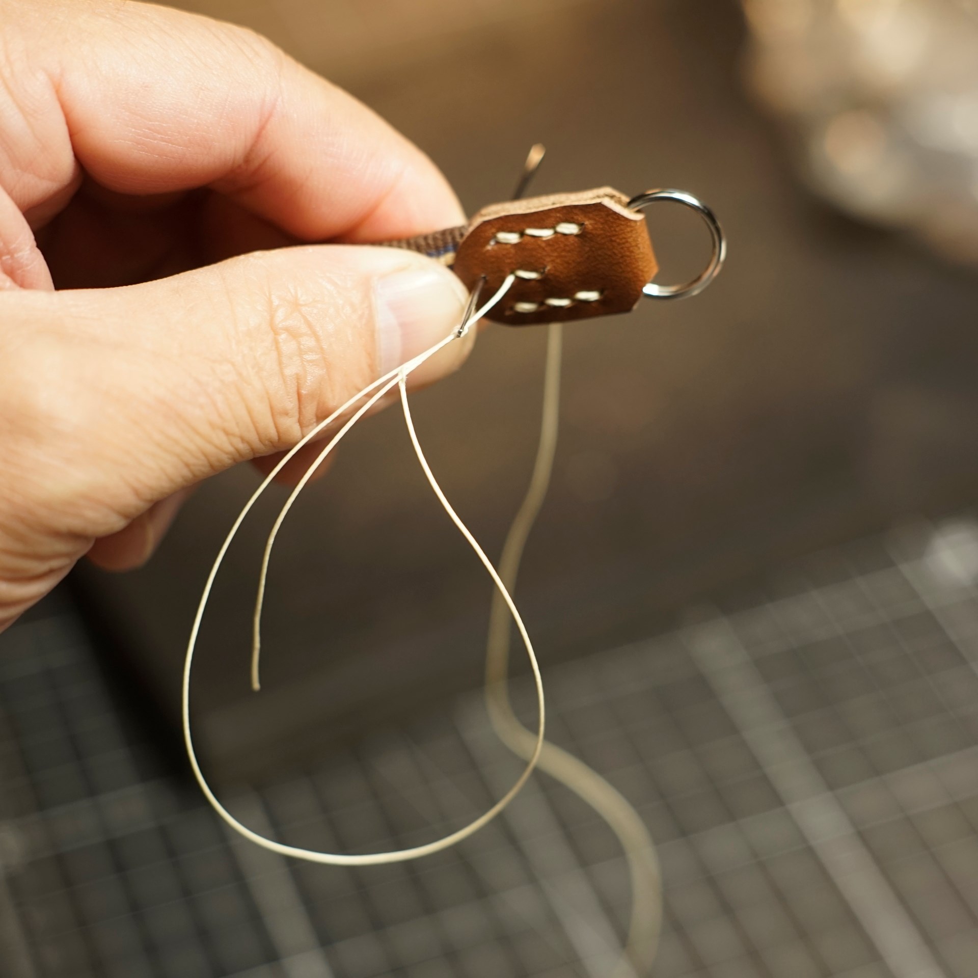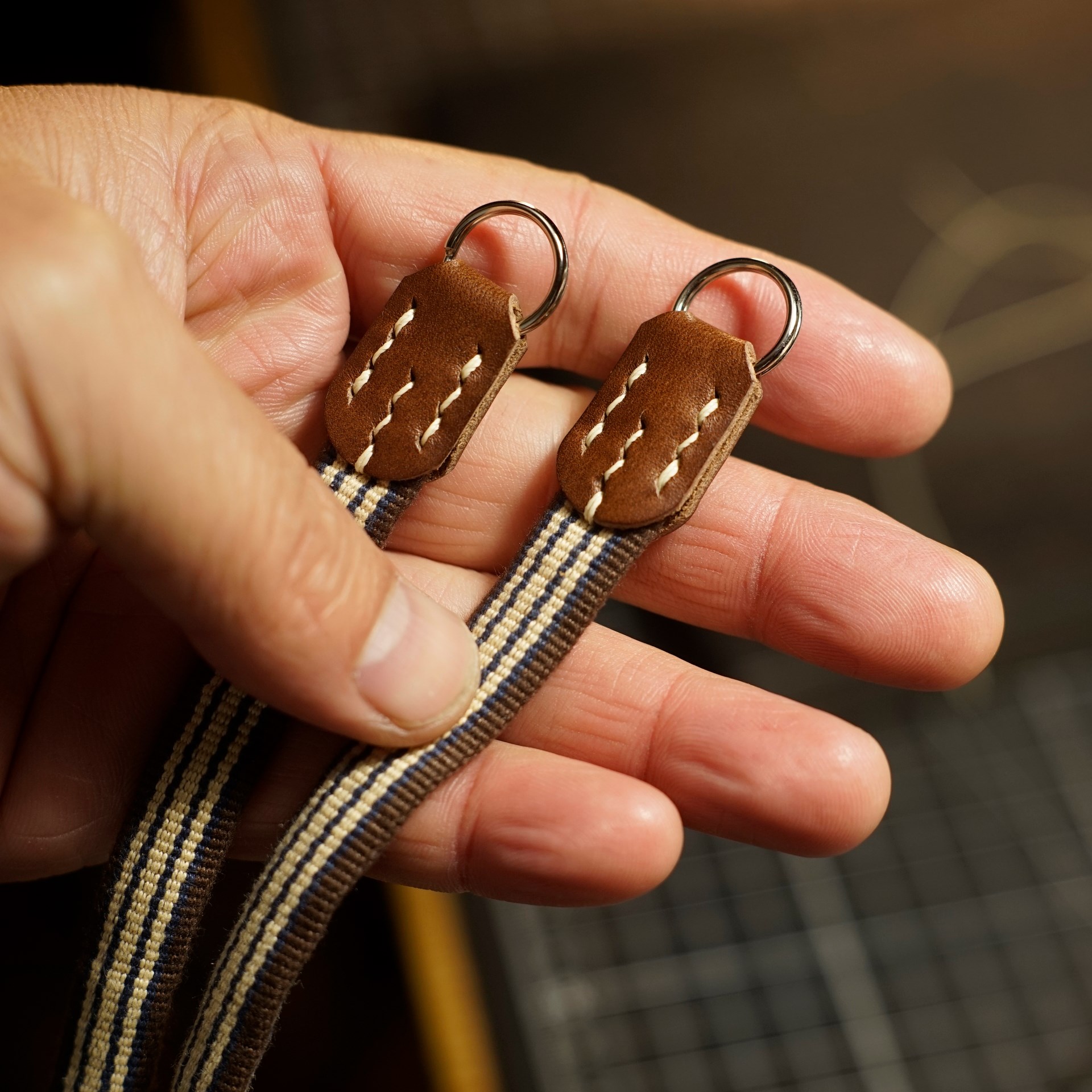 革色はイタリアンハードのチョコにステッチは六花リネン糸の06白米となります。半丸紐となった真田紐に革パーツと金具を取り付けます。